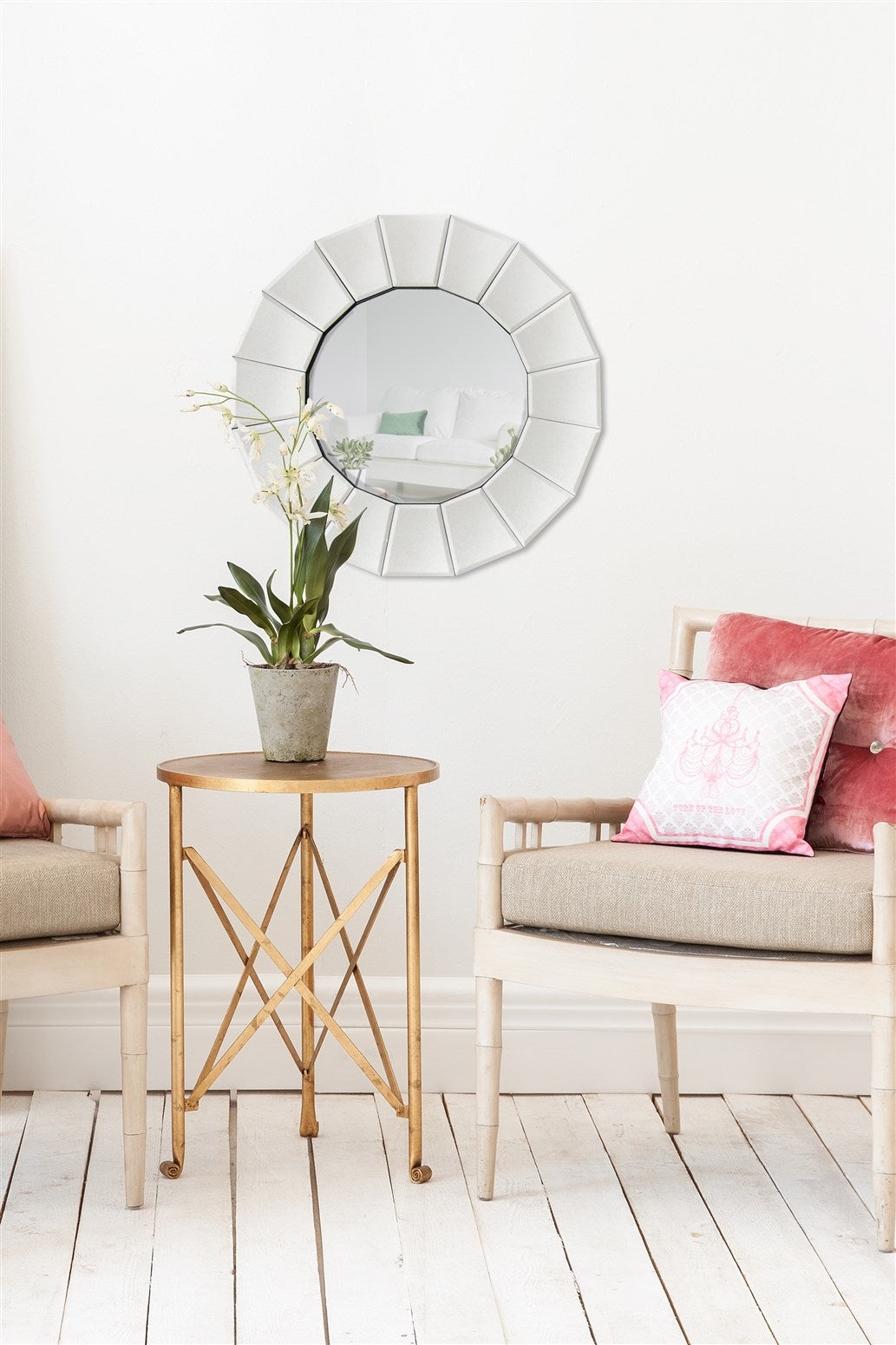 Dieser Spiegel bringt gehobene Eleganz in Ihre Räumlichkeiten. Die klassisch-runde Form der Spiegelfläche harmonisiert mit der sechszehneckigen Polygon-Form des silbernen Rahmens und betont den reizvollen Charakter des Wohnaccessoires. Der zeitlose Spiegel eignet sich ideal für die Anbringung im Wohnzimmer, Flur, Badezimmer oder jedem weiteren Raum. Kleine Räume profitieren von Spiegelflächen an der Wand, da sie diese größer erscheinen lassen. Mit einem Durchmesser von ca. 60 cm macht der silberne Spiegel besonders an freien Wänden etwas her. Auch als Geschenk für Freunde und Familie, egal ob zum Geburtstag, zur Einweihung oder für sich selbst, eignet sich der polygon-förmige Wandspiegel ideal. Egal ob als auflockernde Dekoration oder als stylischer Hingucker – der Wandspiegel mit Silberrahmen glänzt prachtvoll und erhellt jeden Raum. Vereinen Sie den Deko-Zweck und den praktischen Nutzen des Deko-Spiegels miteinander und bringen Sie ihn an einer Wand in Ihrem Zuhause an. Er fügt sich dank der leichten Anbringung ideal in unterschiedlichste Wohnkonzepte ein.