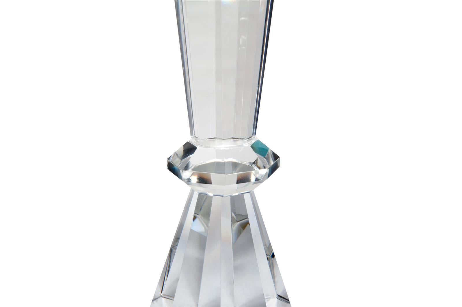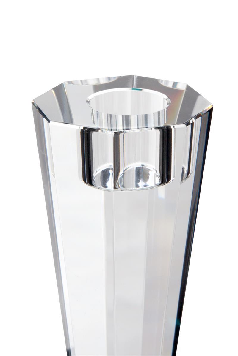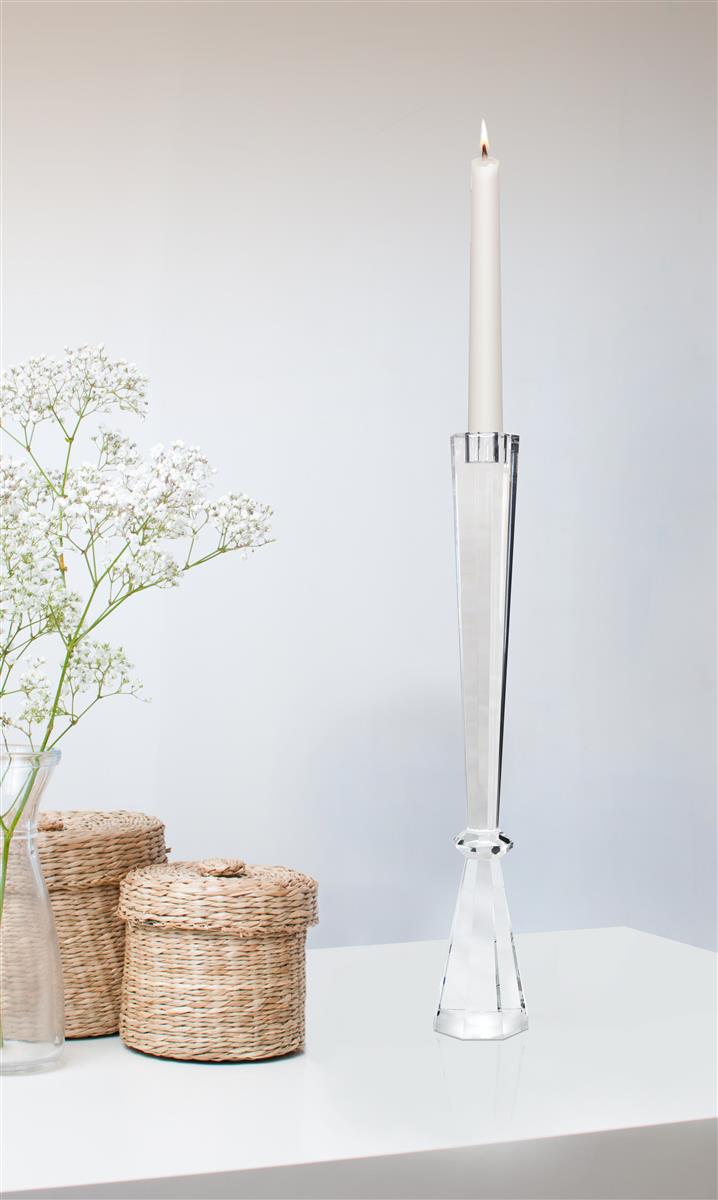 Der schöne Kerzenhalter in Kristalloptik mit hochwertigem Erscheinungsbild bietet einen starken Charakter und Glanzfaktor. Für alle, die gerne etwas Glamour beherbergen, ist dieser längliche Kerzenhalter genau richtig. Schaffen Sie in Kombination mit den richtigen Kerzen eine romantische Atmosphäre in Ihrem Zuhause und genießen Sie die Umgebung. Auch als dekorative Kerzenbeleuchtung auf dem Esstisch kann der Kerzenhalter optimal verwendet werden. Das zeitlose und elegante Design aus massivem Glas ist klar und schwer. Das hohe Gewicht gibt dem Kerzenhalter einen festen Stand, was ihn besonders praktisch macht. Der für Stabkerzen geeignete Kerzenhalter ca. 46 cm hohe sorgt ohne Schnick-Schnack für ein High-Class-Ambiente im Raum. Die Benutzung erfolgt auf eigene Gefahr!