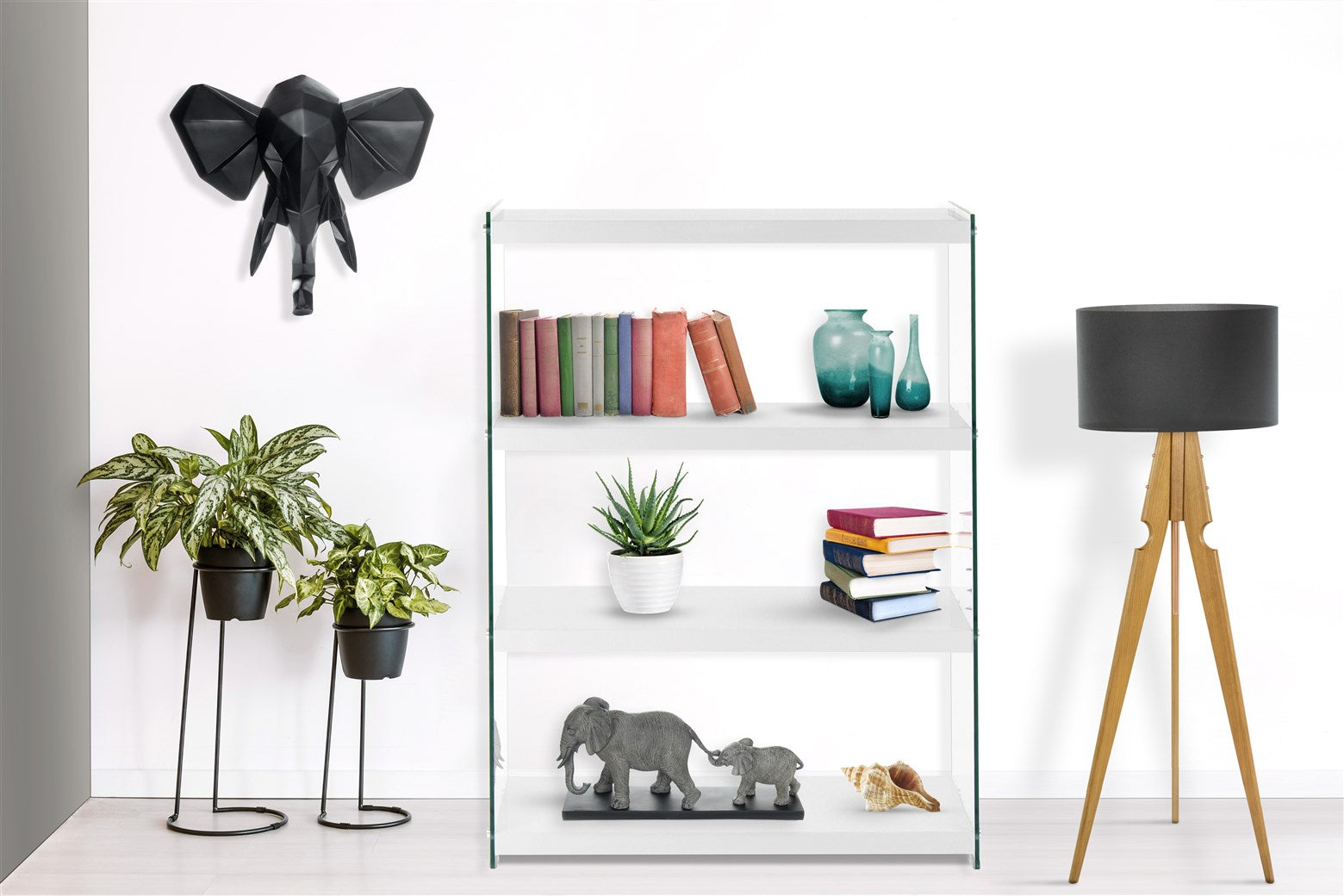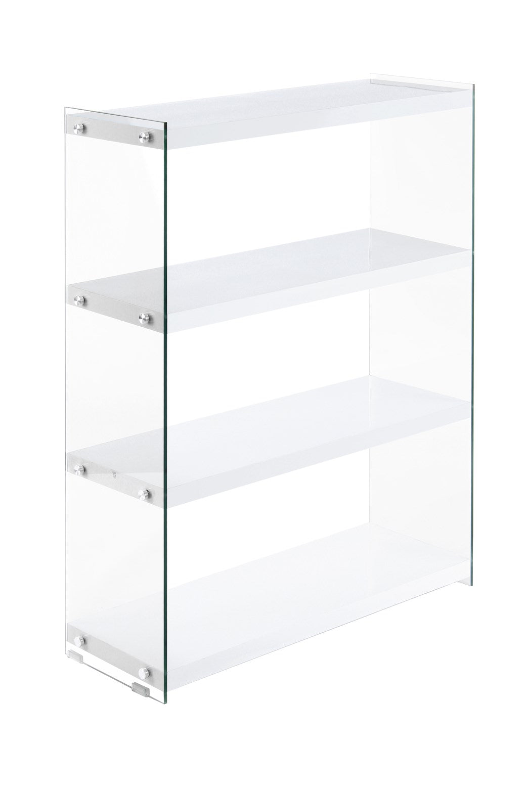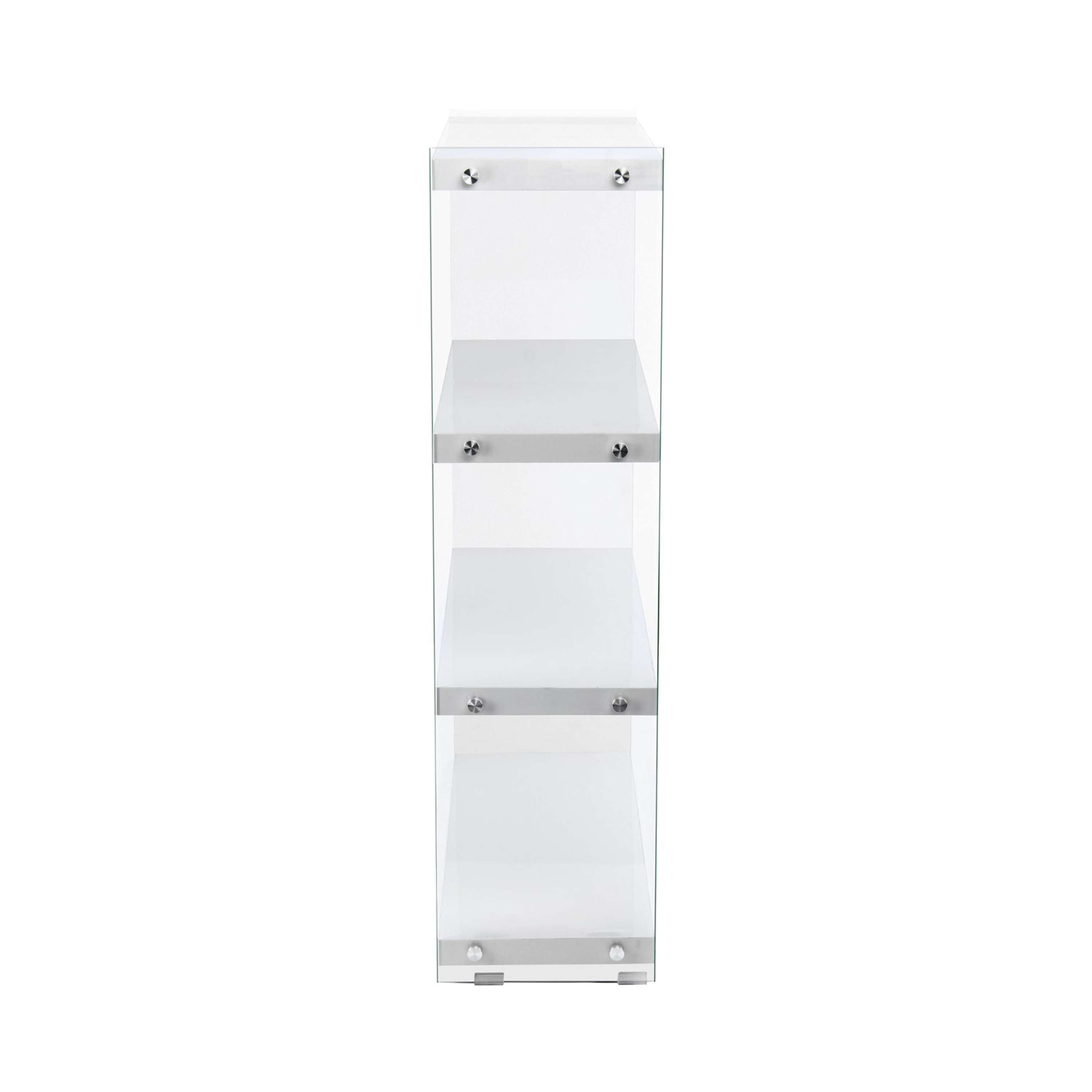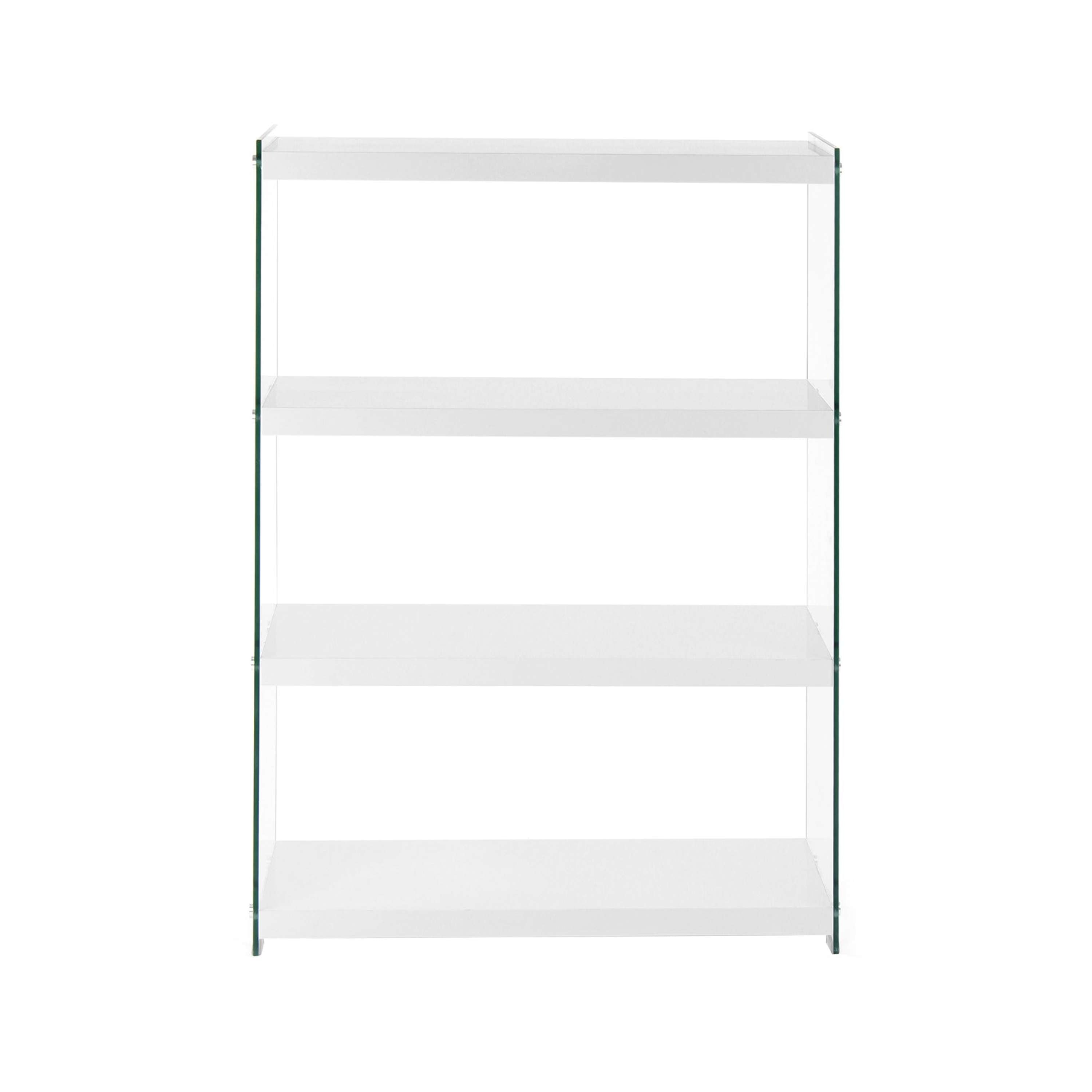 Das moderne Design dieses Regals zeichnet sich durch die transparenten Glas-Seitenwände und die unifarbenen Ablageflächen aus. Gleichzeitig ist das Design unaufdringlich und kann in verschiedene Einrichtungsstile integriert werden. Das Regal ist Bestandteil einer Möbelserie, sodass Sie durch die Kombination mit weiteren Möbelstücken ein einheitliches, harmonisches Gesamtambiente im Raum schaffen können. In dem Regal können ideal verschiedene Dinge platziert werden, wie beispielsweise Bücher, DVDs oder Dekoration. Egal ob als Wohnzimmerregal, Stauraum im Schlafzimmer oder als Ablage im Flur – das Regal ist vielseitig einsetzbar und ein praktisches und zugleich dekoratives Möbelstück. Durch die schmale Form kann es einfach an der Wand platziert werden und benötigt auch in kleinen und engen Räumen nur wenig Platz.
