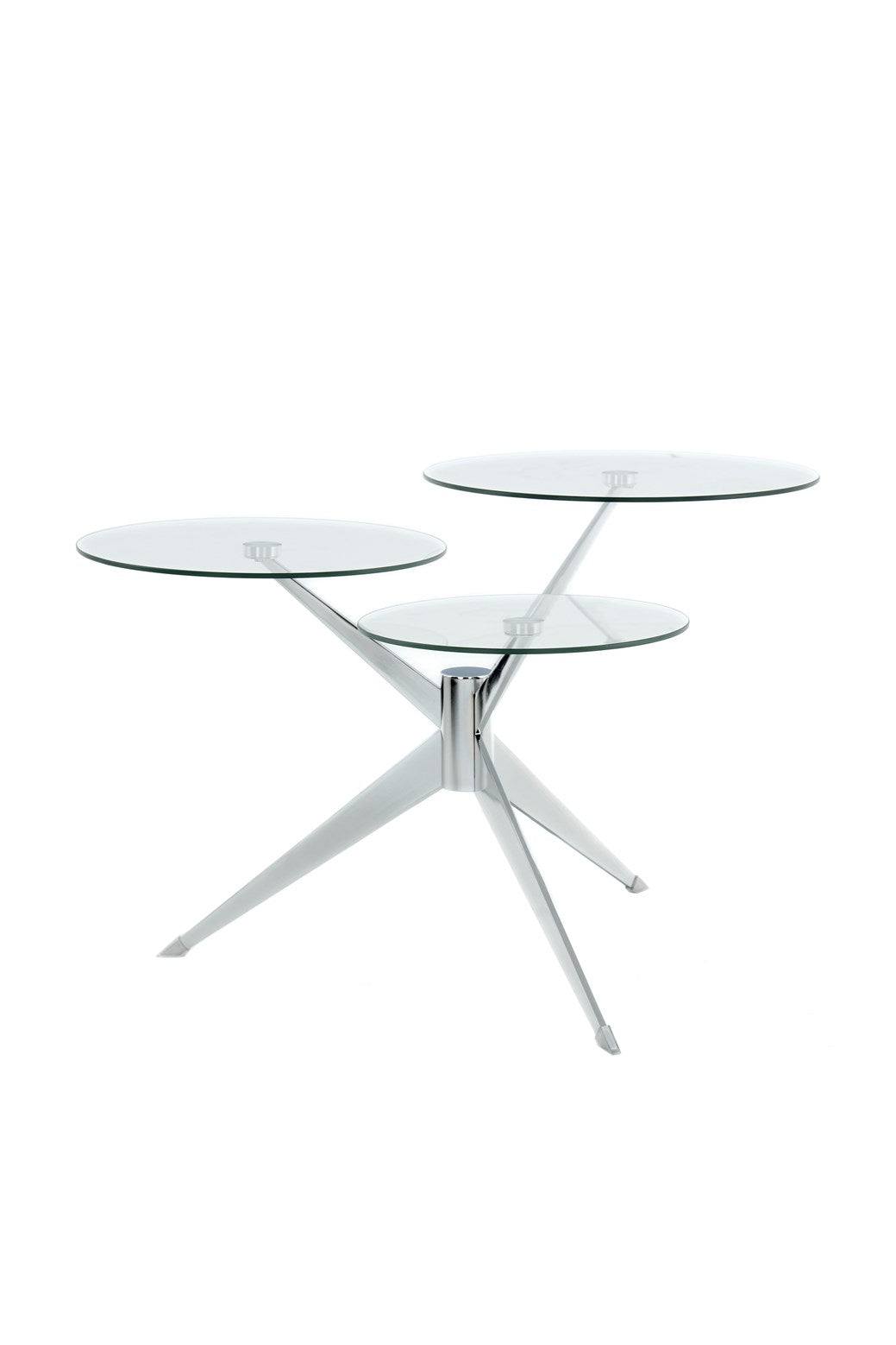Dieser Tisch ist ein absoluter Hingucker. Drei runde, versetzt zueinander angeordnete Tischplatten bieten eine moderne Optik für moderne und klassische Einrichtungen und gleichzeitig flexible Nutzungsmöglichkeiten. Platzieren Sie dekorative Vasen und Figuren auf dem Tischchen und nutzen Sie es gleichzeitig zur Ablage verschiedener Gegenstände und Utensilien. Ob als Beistelltisch im Wohnbereich oder als Ablageplatz für Schlüssel und weitere täglich genutzte Dinge im Flur – dieses Tischmodell ist in jedem Raum ein praktisches Möbelstück.