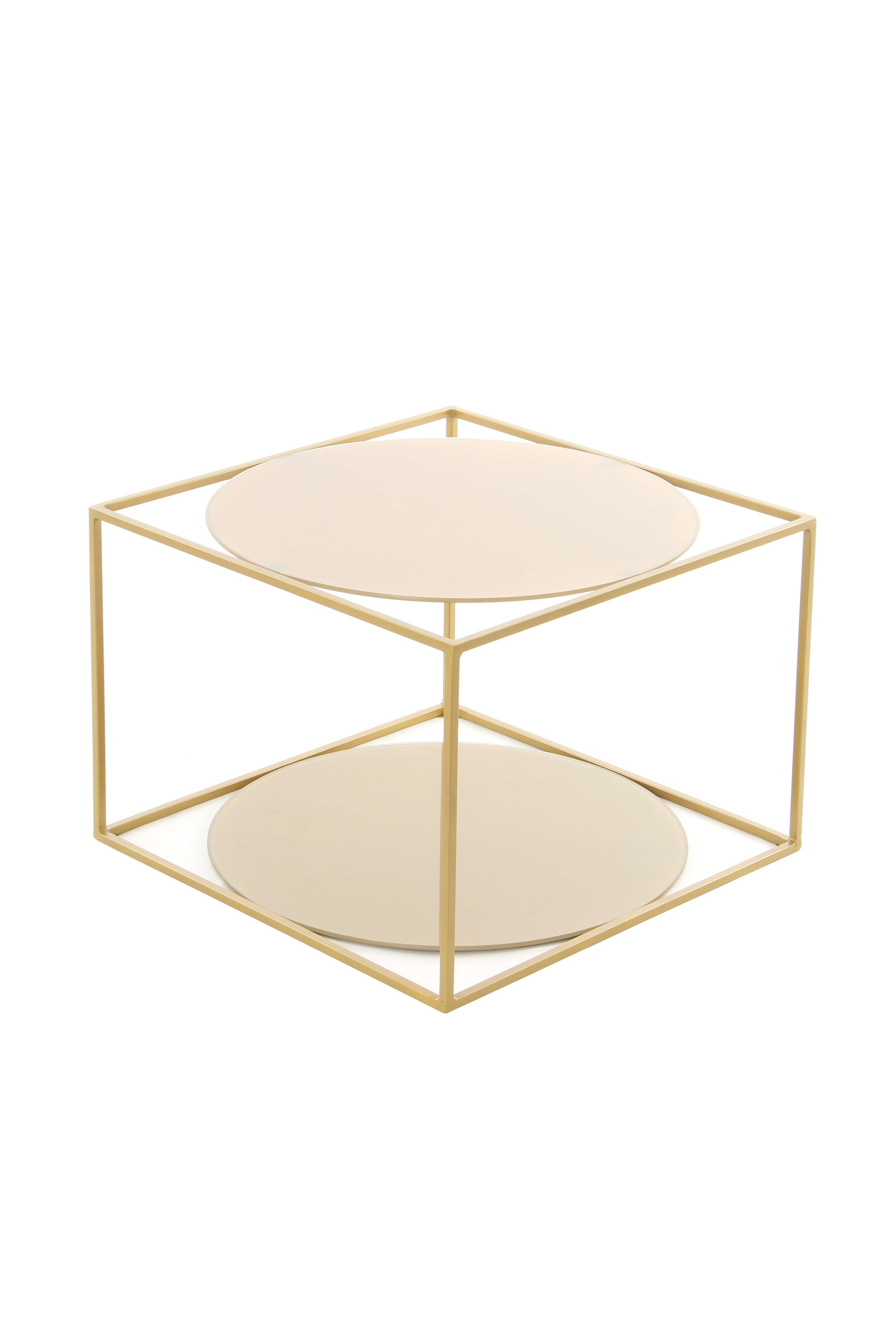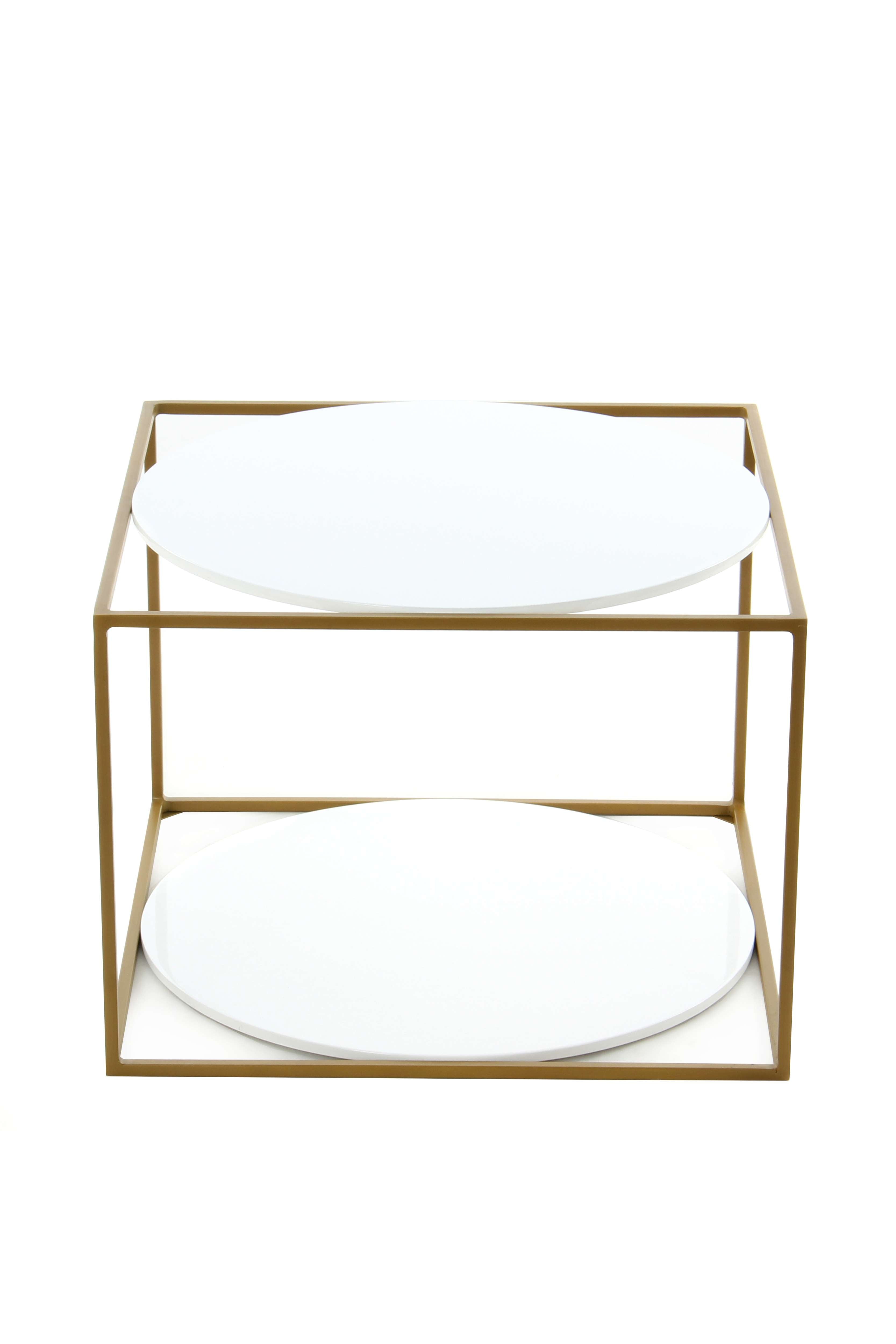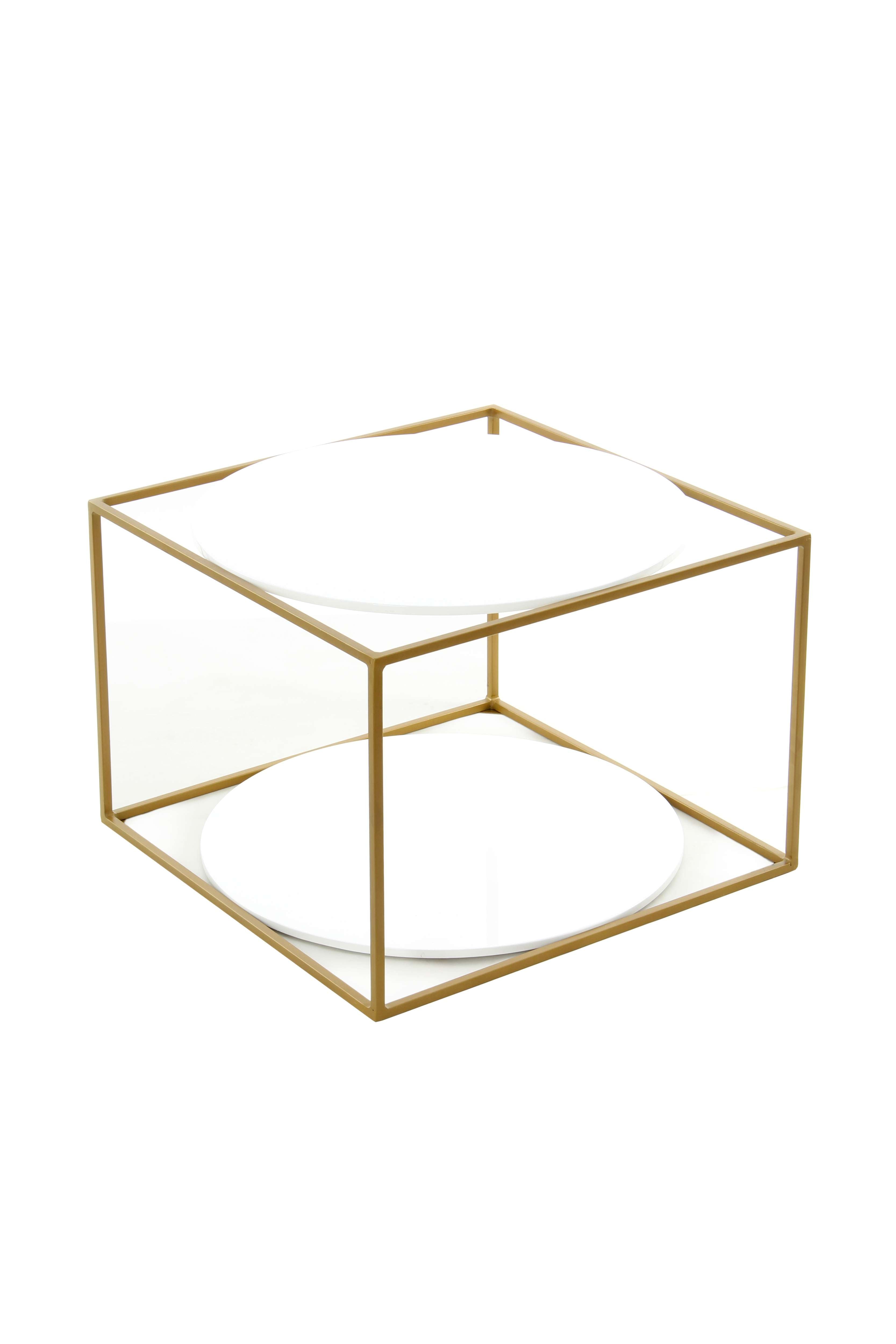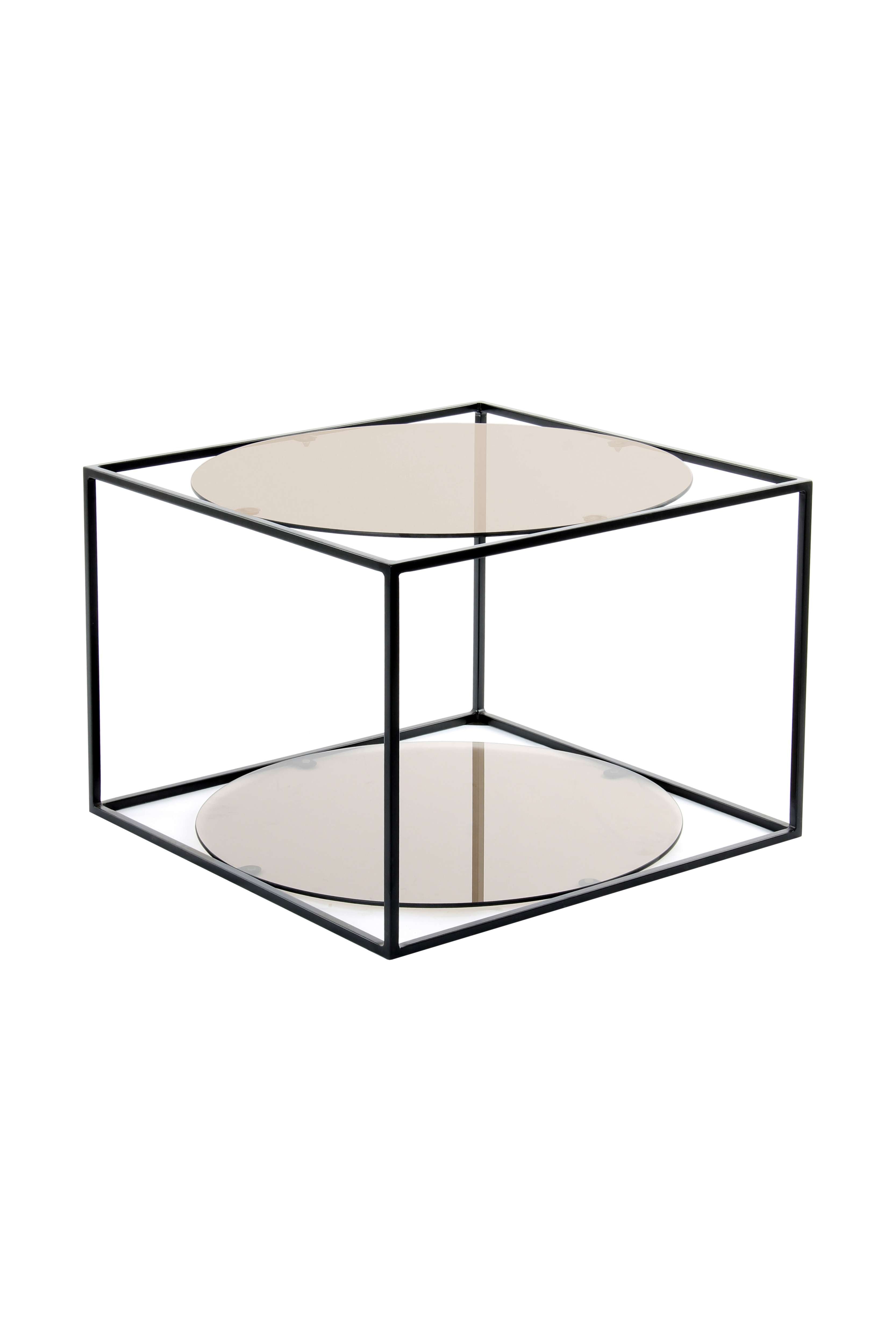Bei diesem Beistelltisch stehen das Gestell und die Tischplatten in absoluter Harmonie miteinander. Das offene Metallgestell in Würfelform ist nicht nur mit einer Tischplatte, sondern auch mit einer zusätzlichen Bodenplatte ausgestattet, sodass der Beistelltisch bequem als Dekofläche und Ablagefläche gleichzeitig genutzt werden kann. Durch die runde Form der eingelassenen Platten wird das Konzept geometrischer Formen beibehalten und gleichzeitig ein Kontrast zu dem eckigen Gestell erzeugt. Besonders in modernen, stilvollen Einrichtungen kommt der minimalistisch gehaltene Tisch gut zur Geltung, doch auch klassische Einrichtungen können mit diesem Modell aufgewertet werden. Durch die dekorative Aufmachung wird der Beistelltisch schnell zum Hingucker im Raum.