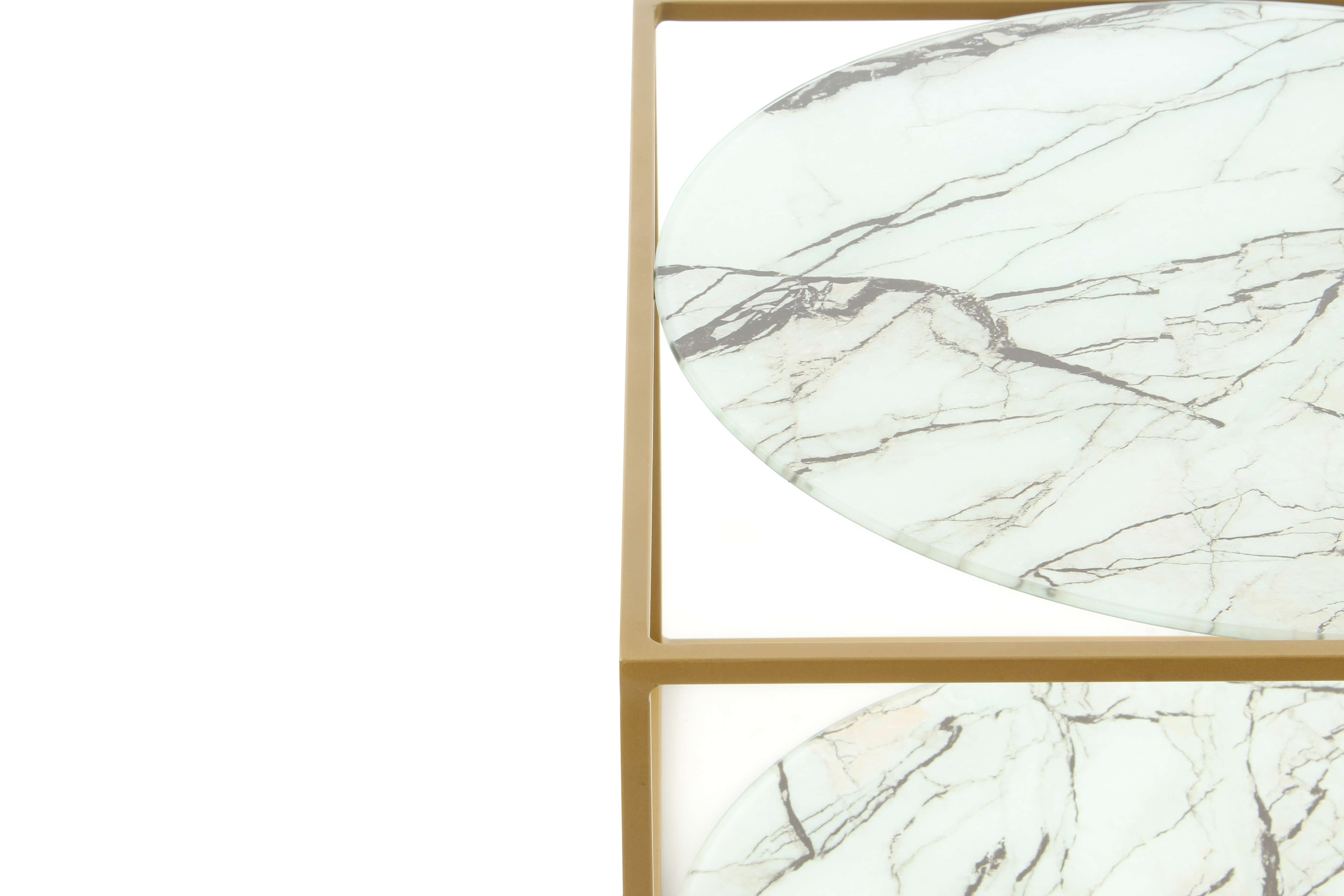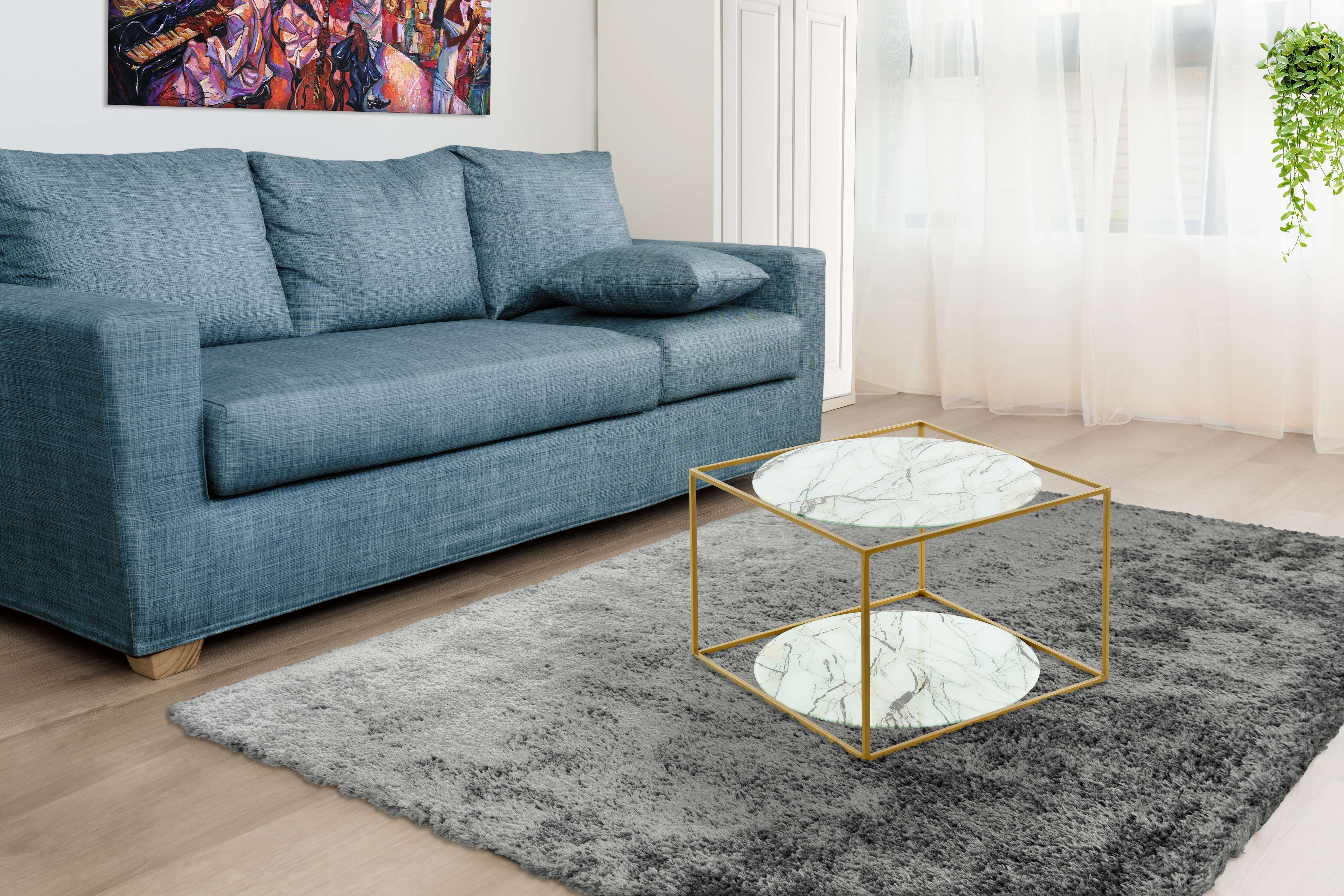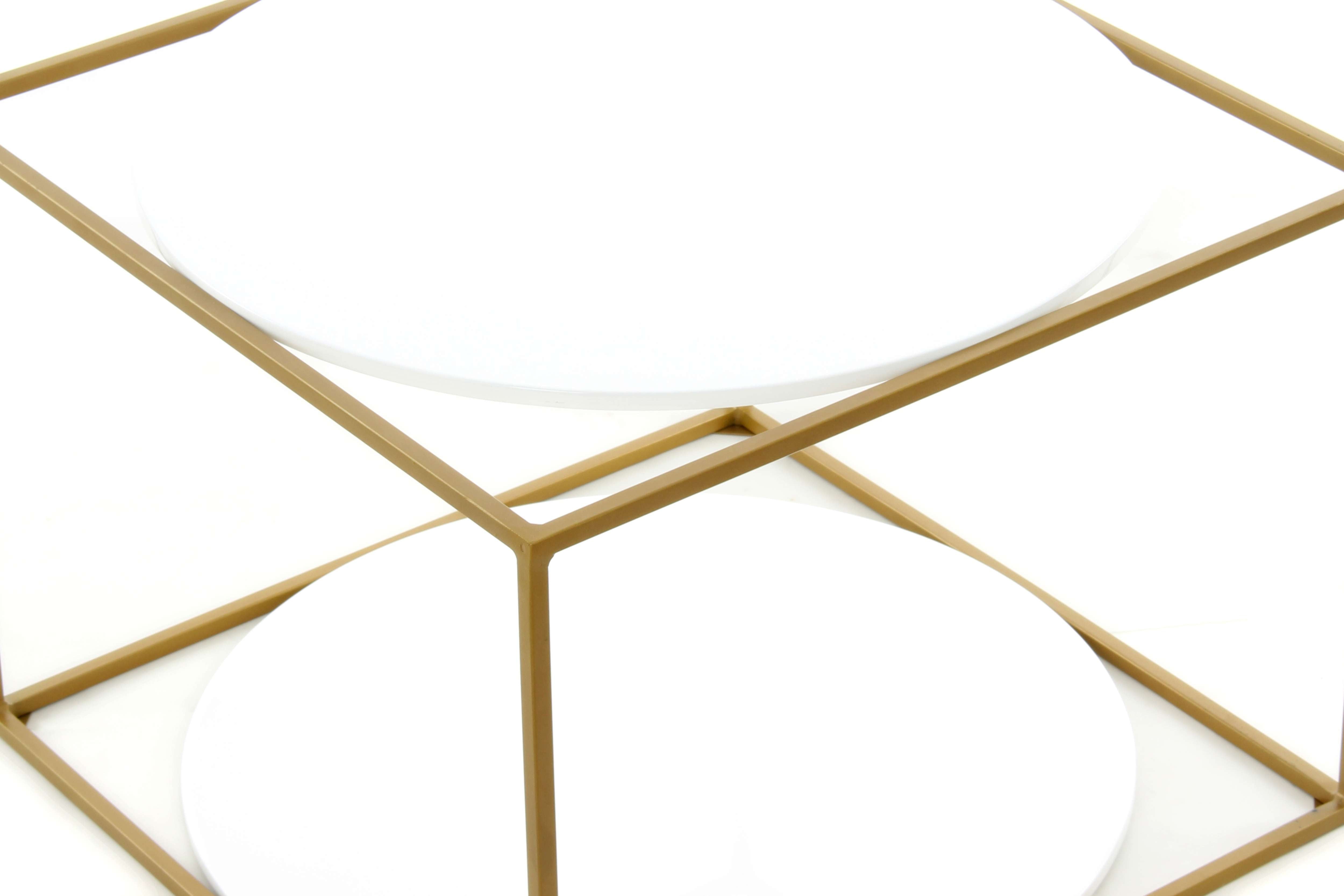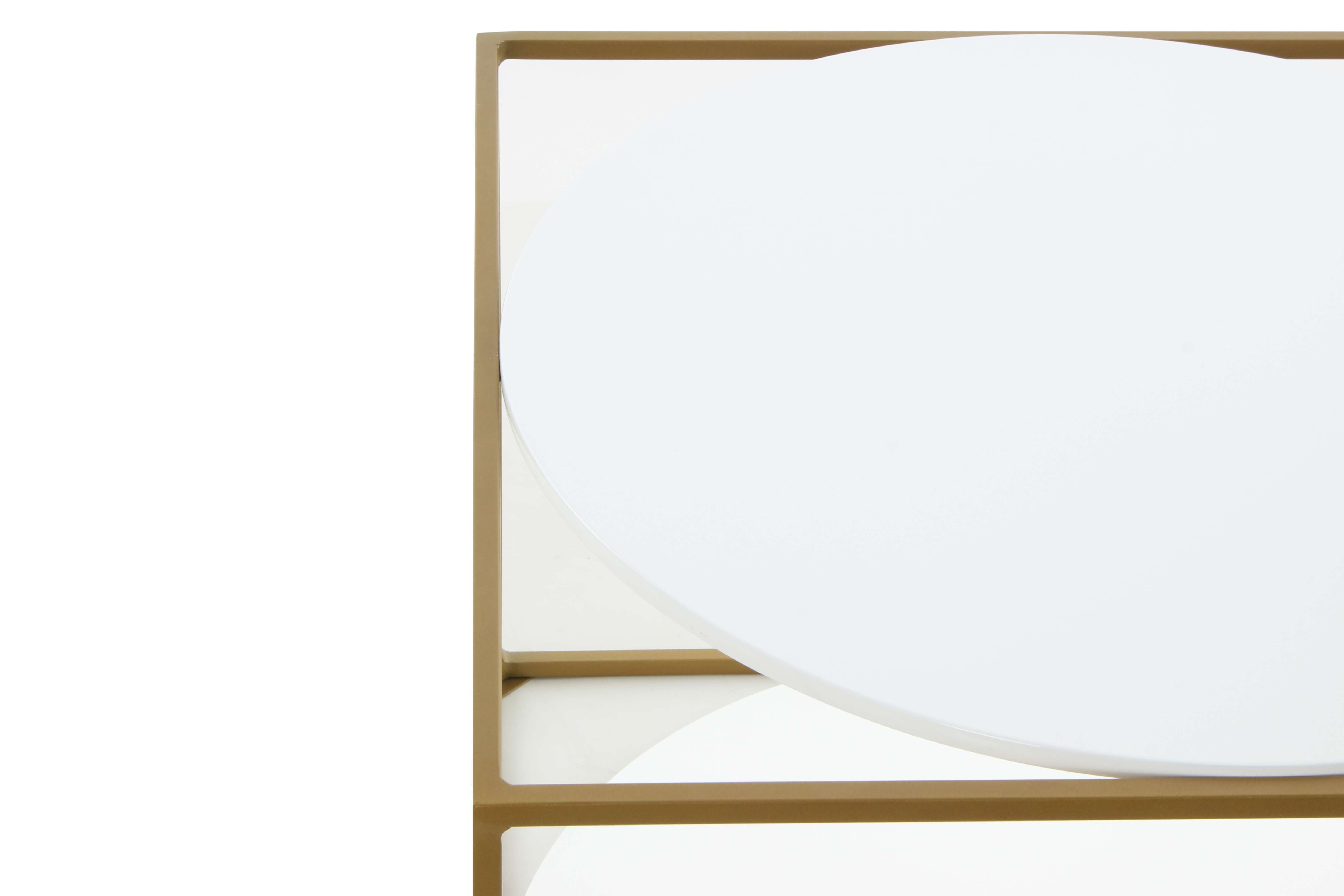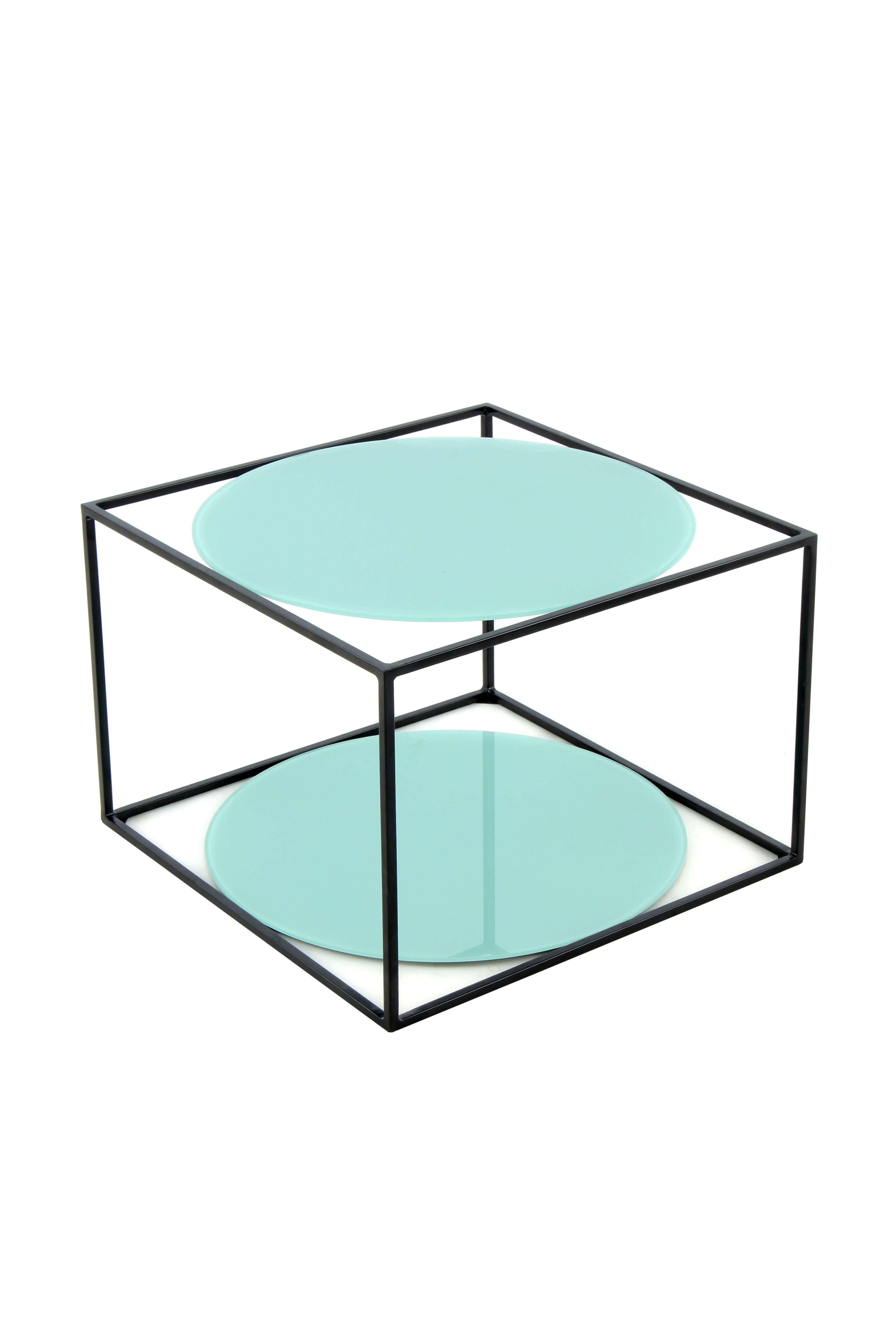 Bei diesem Beistelltisch stehen das Gestell und die Tischplatten in absoluter Harmonie miteinander. Das offene Metallgestell in Würfelform ist nicht nur mit einer Tischplatte, sondern auch mit einer zusätzlichen Bodenplatte ausgestattet, sodass der Beistelltisch bequem als Dekofläche und Ablagefläche gleichzeitig genutzt werden kann. Durch die runde Form der eingelassenen Platten wird das Konzept geometrischer Formen beibehalten und gleichzeitig ein Kontrast zu dem eckigen Gestell erzeugt. Besonders in modernen, stilvollen Einrichtungen kommt der minimalistisch gehaltene Tisch gut zur Geltung, doch auch klassische Einrichtungen können mit diesem Modell aufgewertet werden. Durch die dekorative Aufmachung wird der Beistelltisch schnell zum Hingucker im Raum.