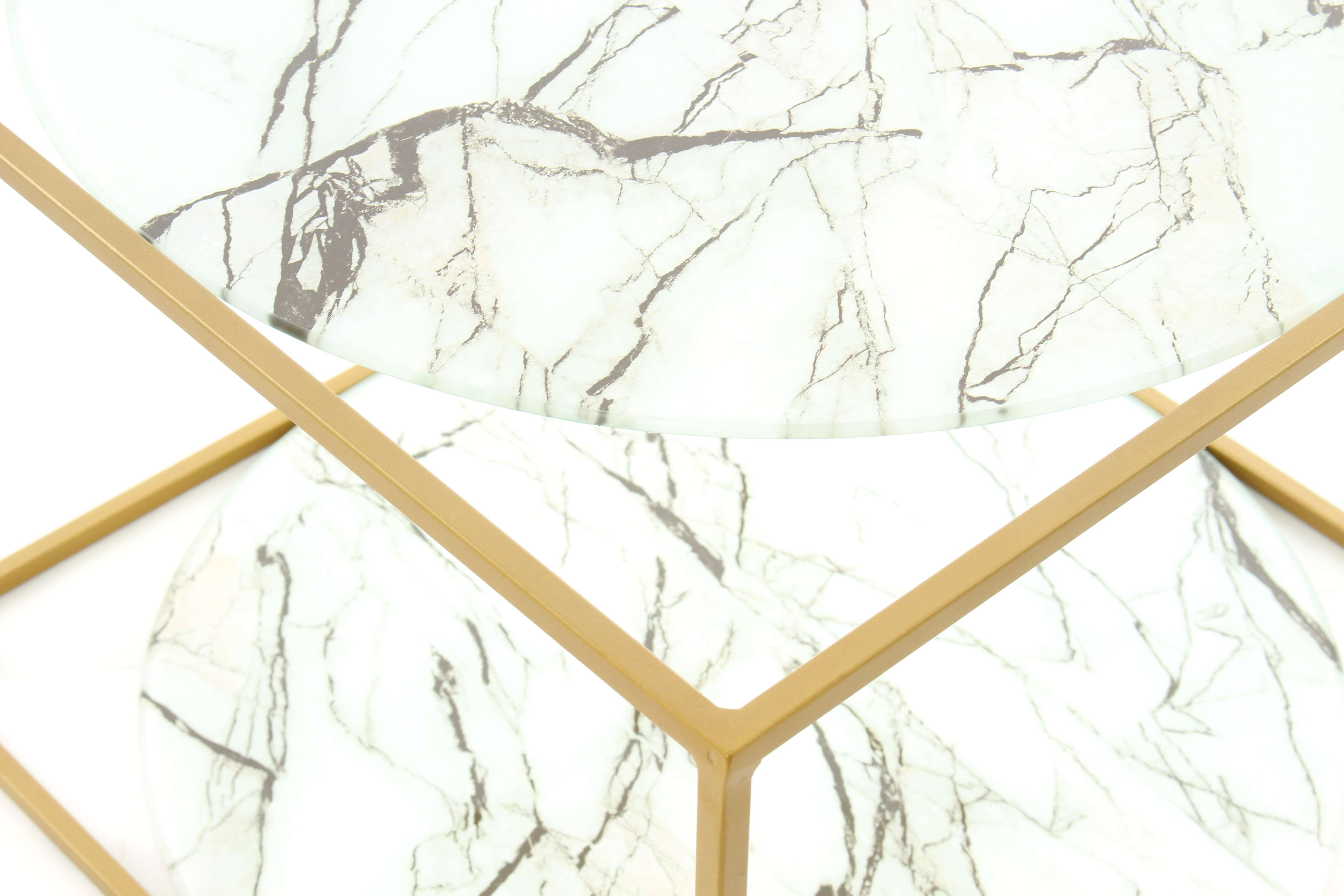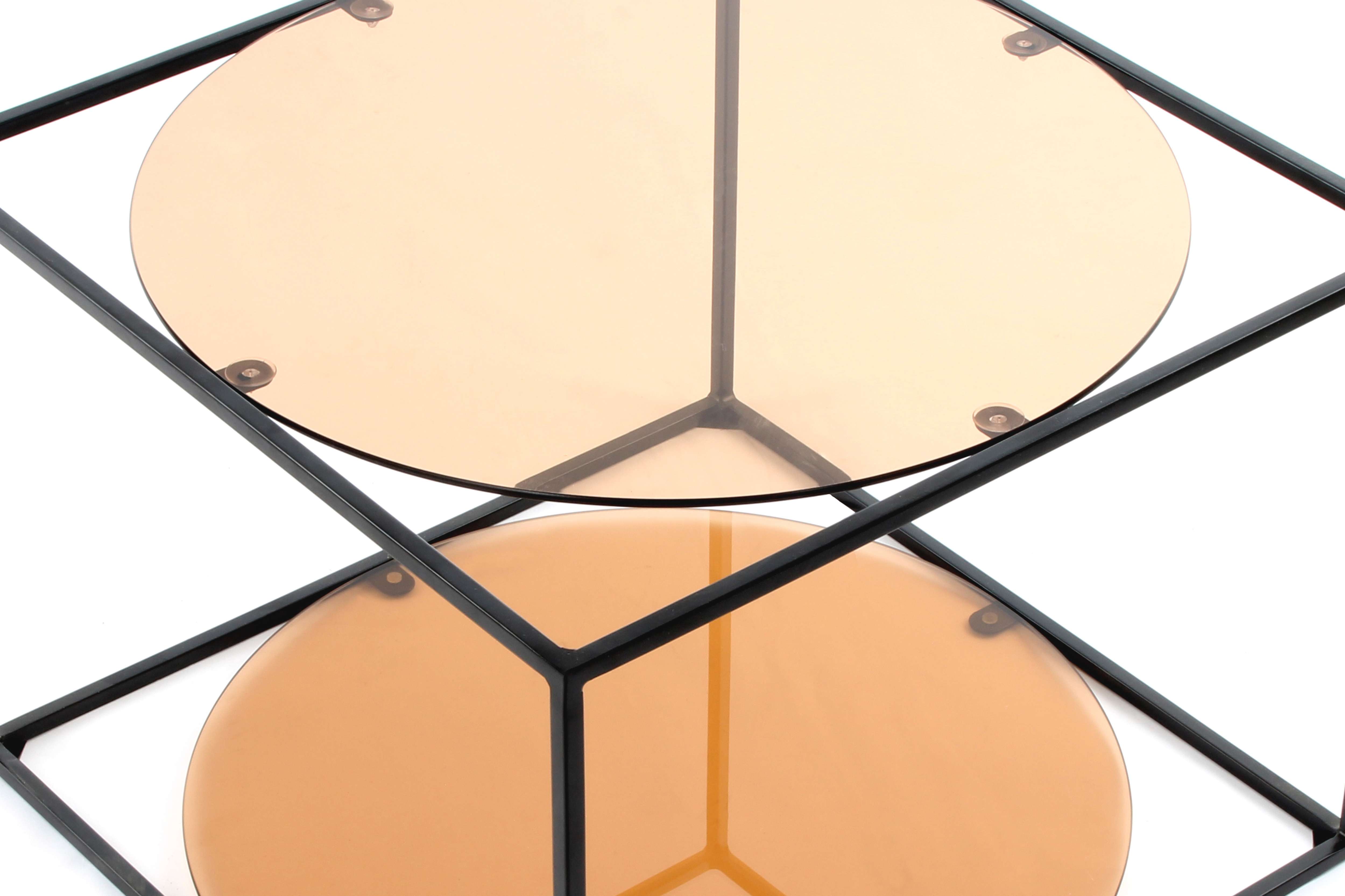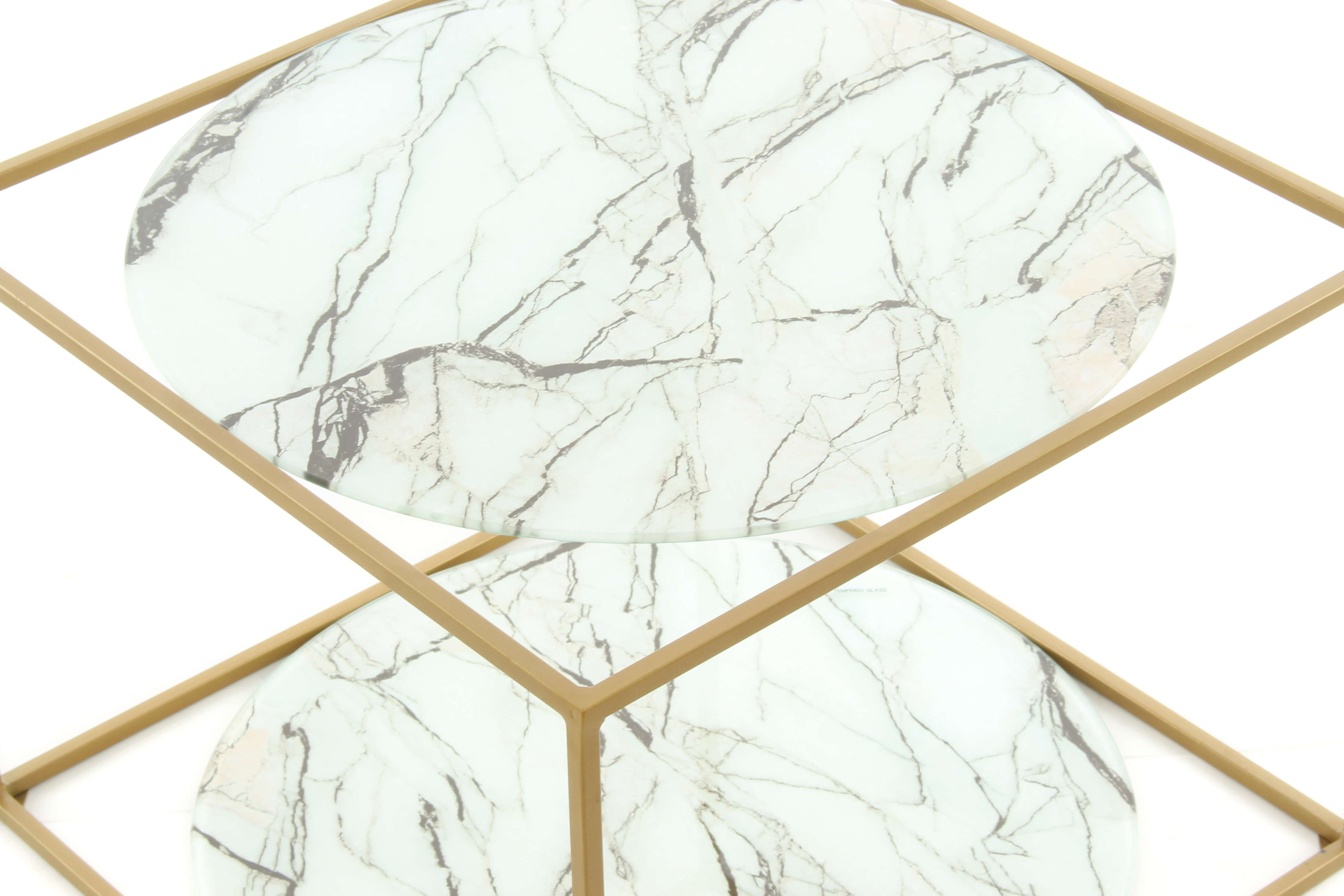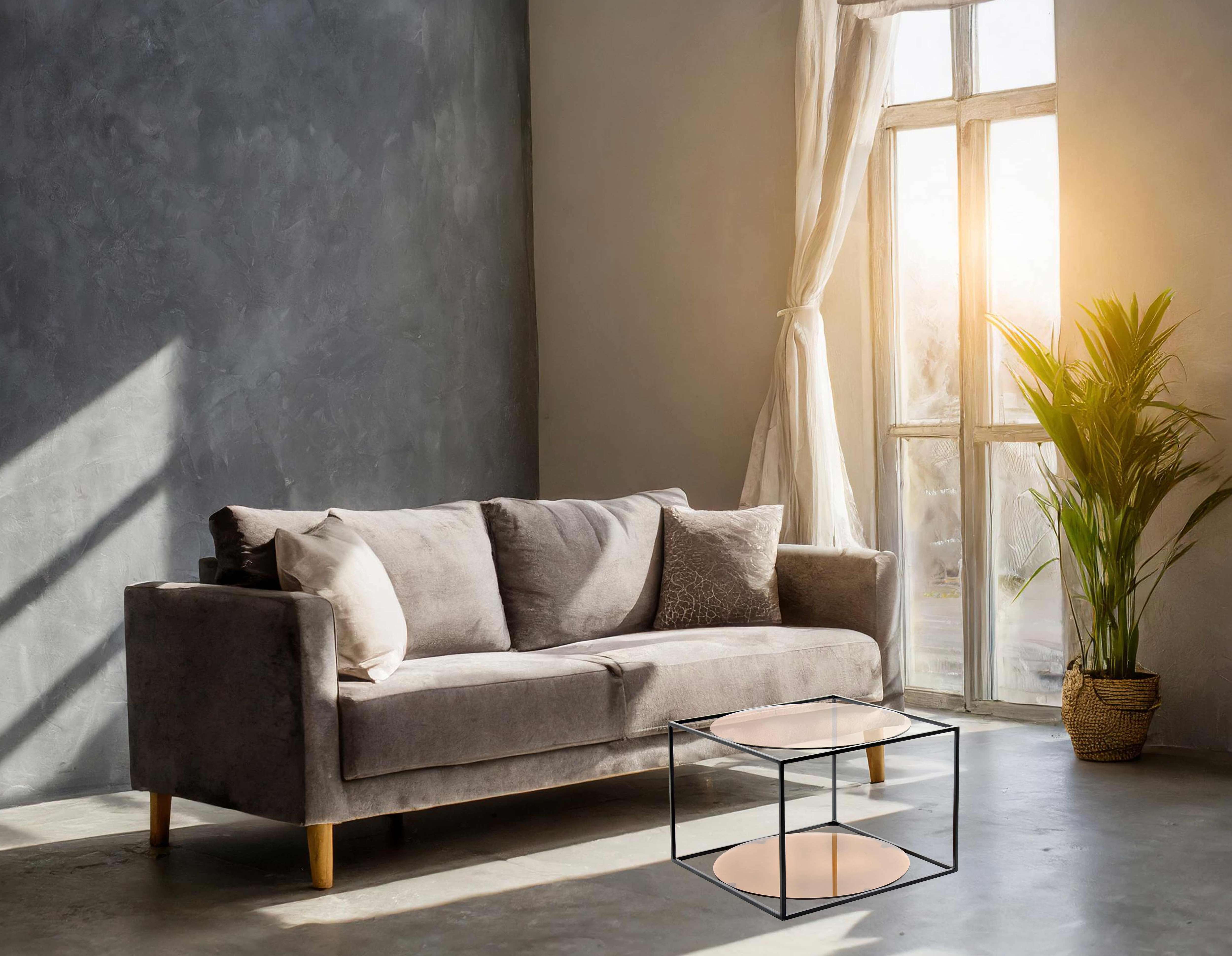 Bei diesem Beistelltisch stehen das Gestell und die Tischplatten in absoluter Harmonie miteinander. Das offene Metallgestell in Würfelform ist nicht nur mit einer Tischplatte, sondern auch mit einer zusätzlichen Bodenplatte ausgestattet, sodass der Beistelltisch bequem als Dekofläche und Ablagefläche gleichzeitig genutzt werden kann. Durch die runde Form der eingelassenen Platten wird das Konzept geometrischer Formen beibehalten und gleichzeitig ein Kontrast zu dem eckigen Gestell erzeugt. Besonders in modernen, stilvollen Einrichtungen kommt der minimalistisch gehaltene Tisch gut zur Geltung, doch auch klassische Einrichtungen können mit diesem Modell aufgewertet werden. Durch die dekorative Aufmachung wird der Beistelltisch schnell zum Hingucker im Raum.