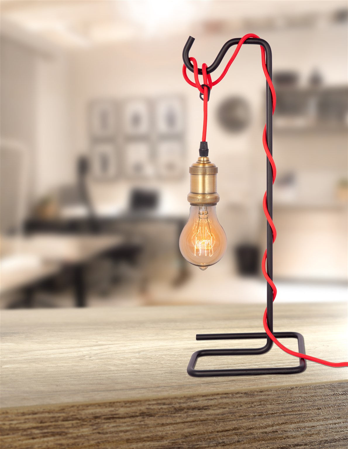 Diese nostalgische Tischlampe lädt zum Träumen ein. Das dekorative Wohnaccessoire beeindruckt durch sein mattes, elegantes Erscheinungsbild. Das rote Kabel, welches den schwarzen minimalistischen Lampenständer umwickelt, sticht hervor und macht den besonderen Look der Tischlampe aus. Am Kabelende befestigt ist die Lampenfassung, die für E27-Leuchtmittel mit 40 W geeignet ist (nicht im Lieferumfang enthalten). Bei dieser schönen Tischlampe werden der rohe Charme einer nackten Glühbirne und eine feminine Eleganz gekonnt miteinander vereint. Verleihen Sie Ihrem Zuhause den gewissen In-Look mit der Tischleuchte im "Industrial Style". Das moderne Design integriert sich hervorragend in moderne Wohneinrichtungen, eignet sich aber auch für viele andere Wohnstile. Das geniale Design der Tischlampe macht aus einer gewöhnlichen Glühbirne bzw. LED-Lampe eine besondere Sache. Für moderne Nostalgiefans ist das Modell der absolute Eyecatcher.