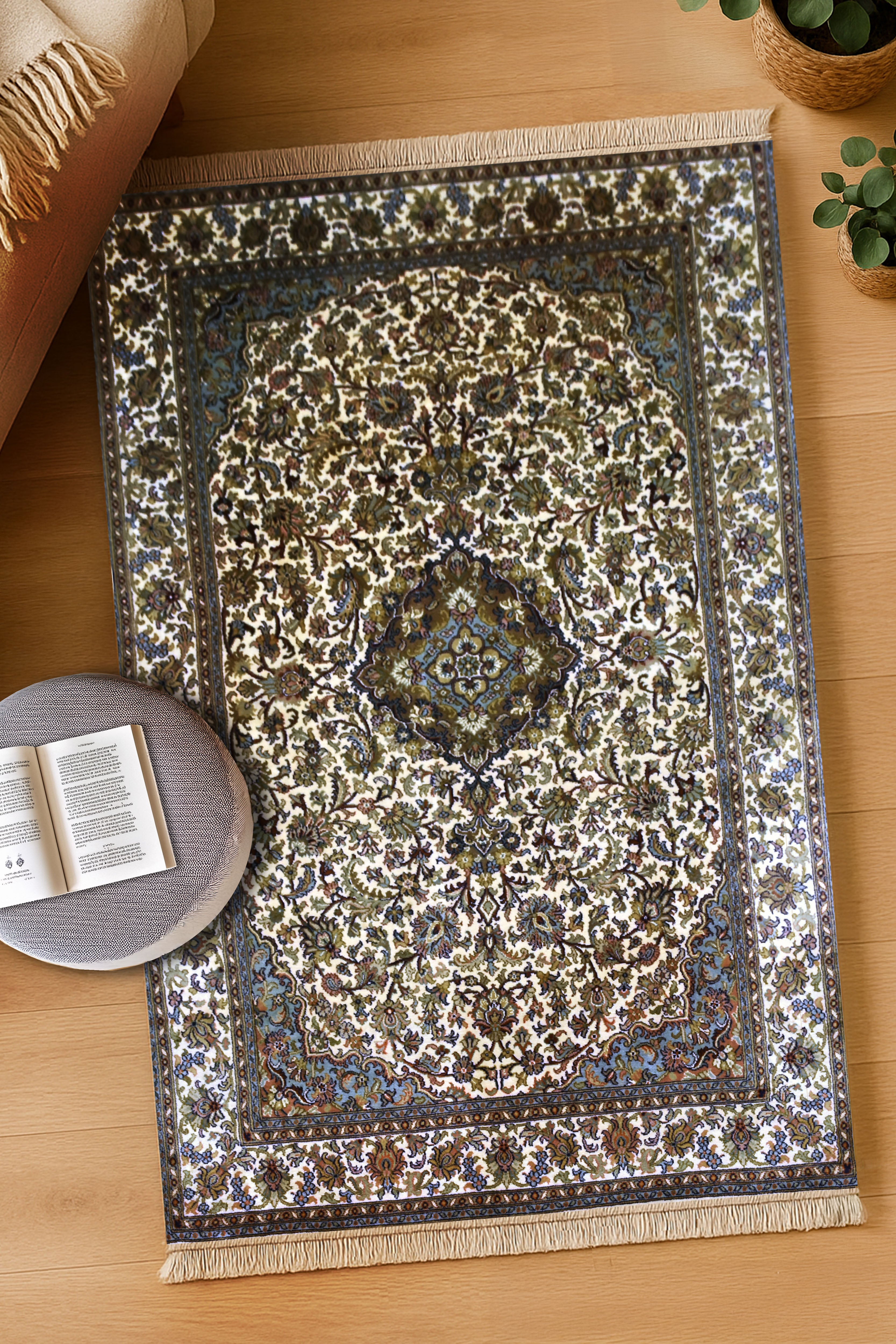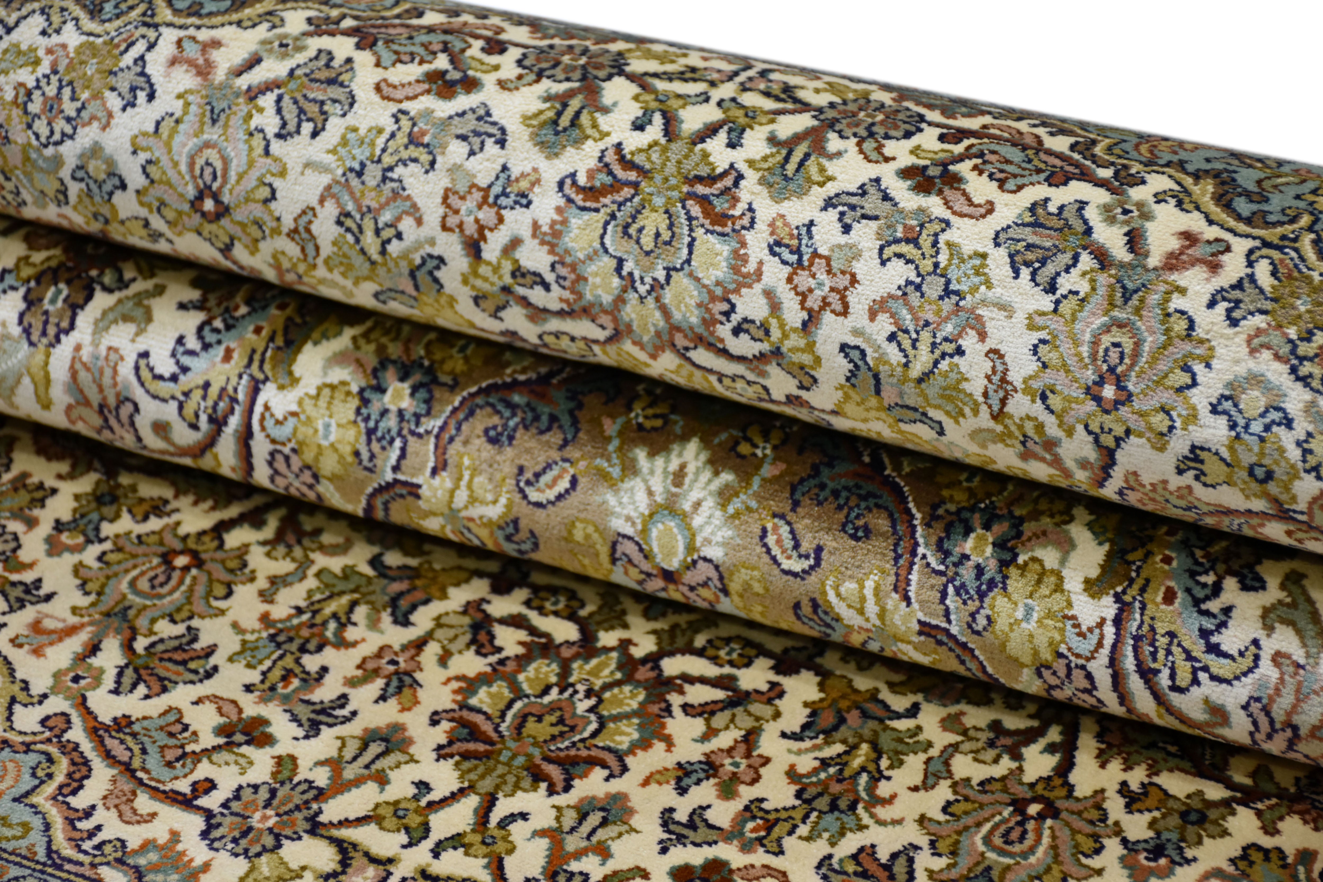 **Teppich mit Orient-Design** Dieser superweiche Qualitätsteppich ist echter Luxus unter Ihren Füßen, der verwöhnt und schmeichelt. Das stolze Gewicht zeugt von Langlebigkeit und macht den eleganten Teppich zu einem Spitzenprodukt. Ein handgewebter Teppich unterscheidet sich zu einem maschinell erstellten Teppich durch seine feinen Details und die kompexe Herstellungsart. Die faszinierende Bandbreite der Designs, die luxuriöse Geschmeidigkeit und Elastizität und die Lebhaftigkeit der Farben machen echte Seidenteppiche so unverkennbar. Durch das orientalische Design verleihen Sie Ihrem Zuhause einen bezaubernden fernöstlichen Look. Werten Sie Ihre Einrichtung auf und bestellen Sie sich Ihren neuen Seidenteppich.