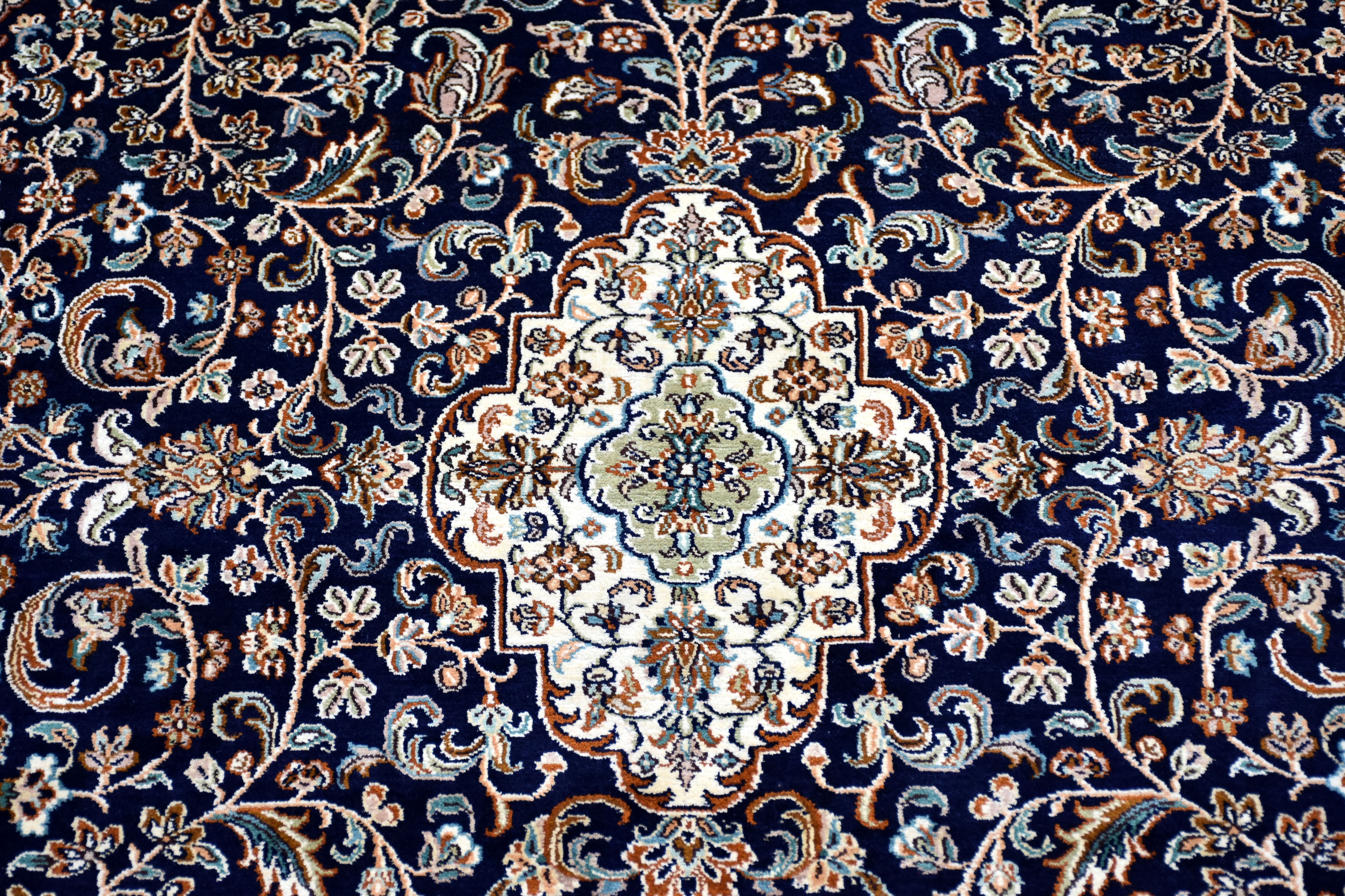 Dieser superweiche Qualitätsteppich ist echter Luxus unter Ihren Füßen, der verwöhnt und schmeichelt. Das stolze Gewicht zeugt von Langlebigkeit und macht den eleganten Teppich zu einem Spitzenprodukt. Ein handgewebter Teppich unterscheidet sich zu einem maschinell erstellten Teppich durch seine feinen Details und die kompexe Herstellungsart. Die faszinierende Bandbreite der Designs, die luxuriöse Geschmeidigkeit und Elastizität und die Lebhaftigkeit der Farben machen echte Seidenteppiche so unverkennbar. Durch das orientalische Design verleihen Sie Ihrem Zuhause einen bezaubernden fernöstlichen Look. Werten Sie Ihre Einrichtung auf und bestellen Sie sich Ihren neuen Seidenteppich.