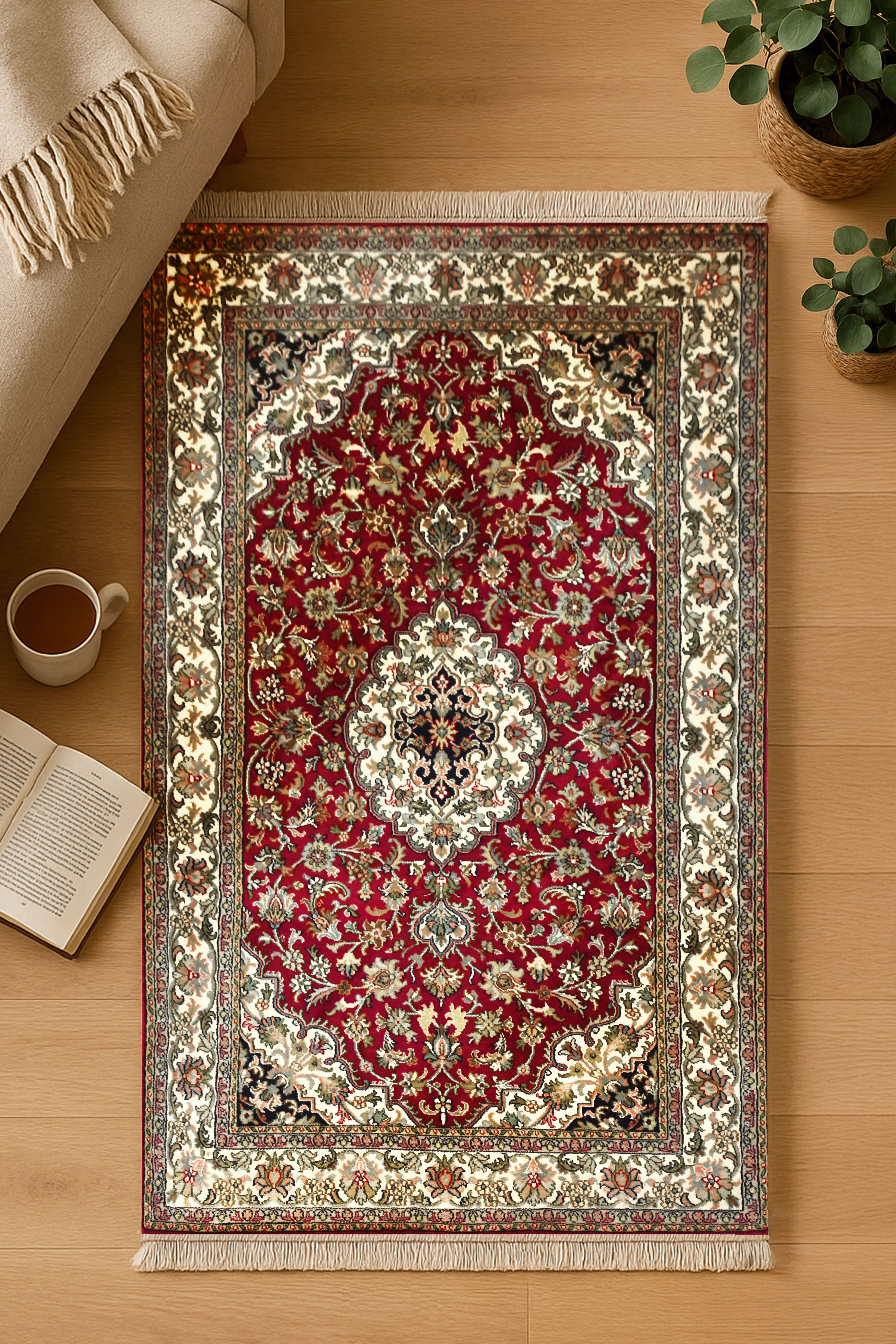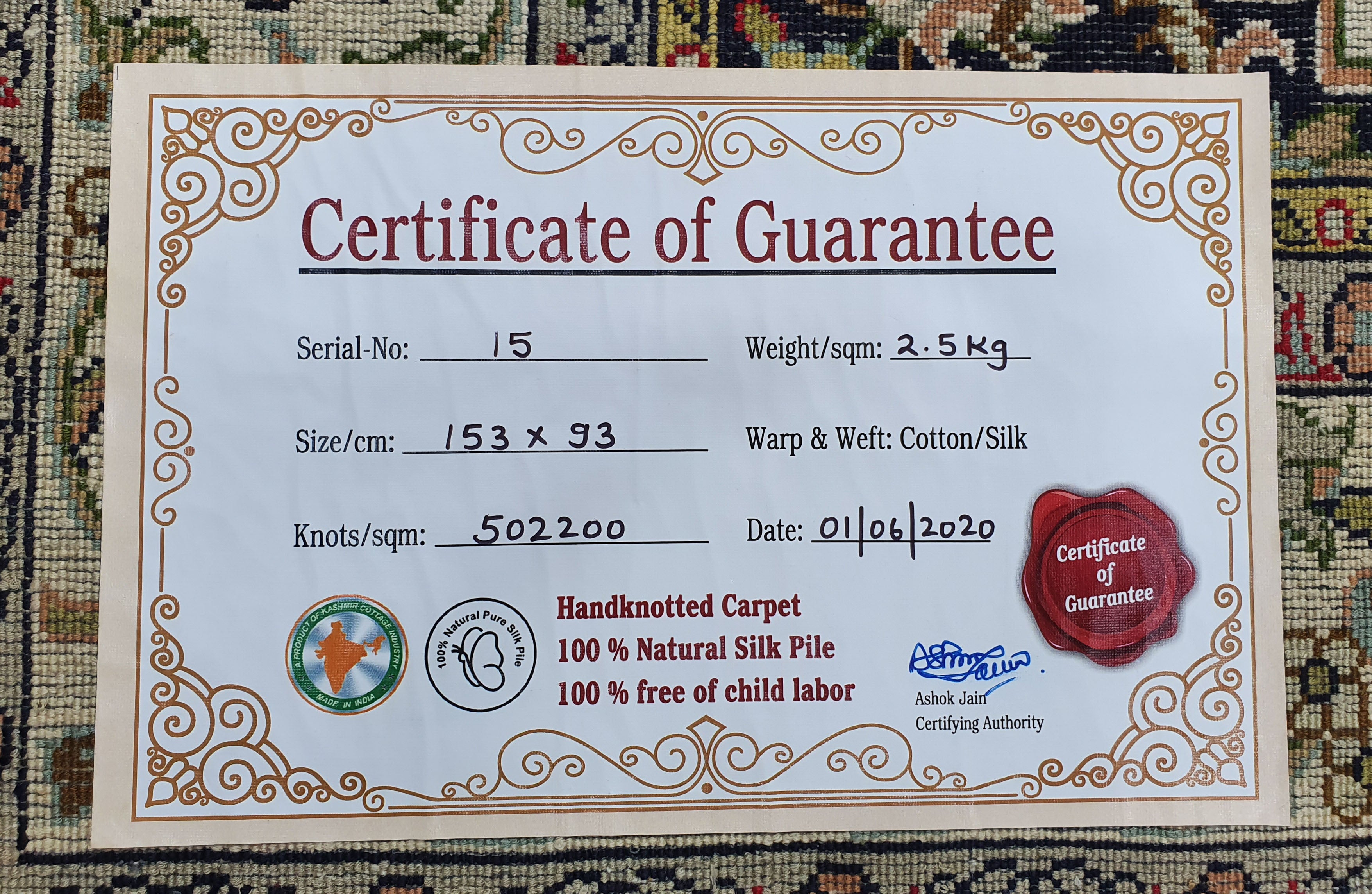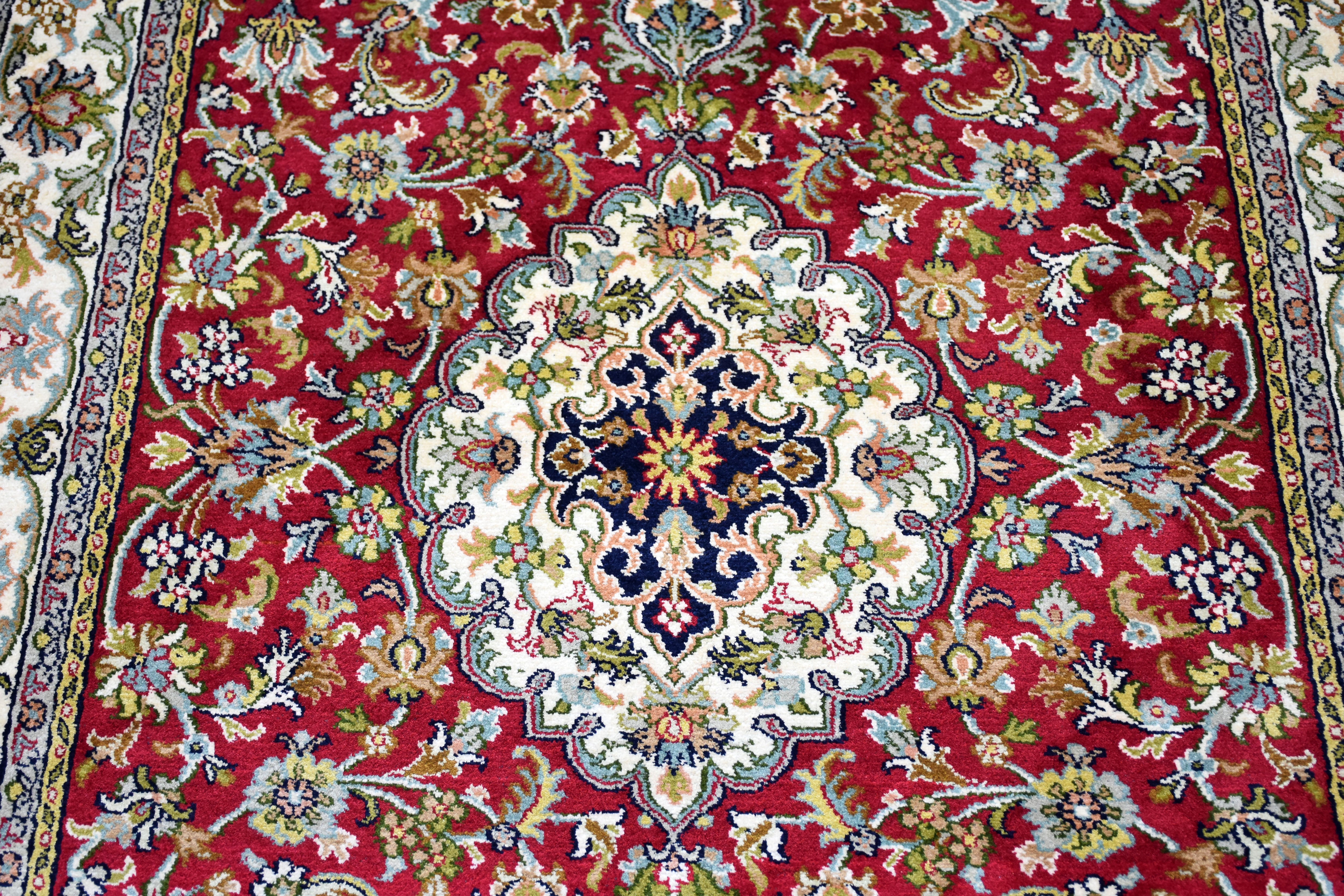 Dieser superweiche Qualitätsteppich ist echter Luxus unter Ihren Füßen, der verwöhnt und schmeichelt. Das stolze Gewicht zeugt von Langlebigkeit und macht den eleganten Teppich zu einem Spitzenprodukt. Ein handgewebter Teppich unterscheidet sich zu einem maschinell erstellten Teppich durch seine feinen Details und die kompexe Herstellungsart. Die faszinierende Bandbreite der Designs, die luxuriöse Geschmeidigkeit und Elastizität und die Lebhaftigkeit der Farben machen echte Seidenteppiche so unverkennbar. Durch das orientalische Design verleihen Sie Ihrem Zuhause einen bezaubernden fernöstlichen Look. Werten Sie Ihre Einrichtung auf und bestellen Sie sich Ihren neuen Seidenteppich.