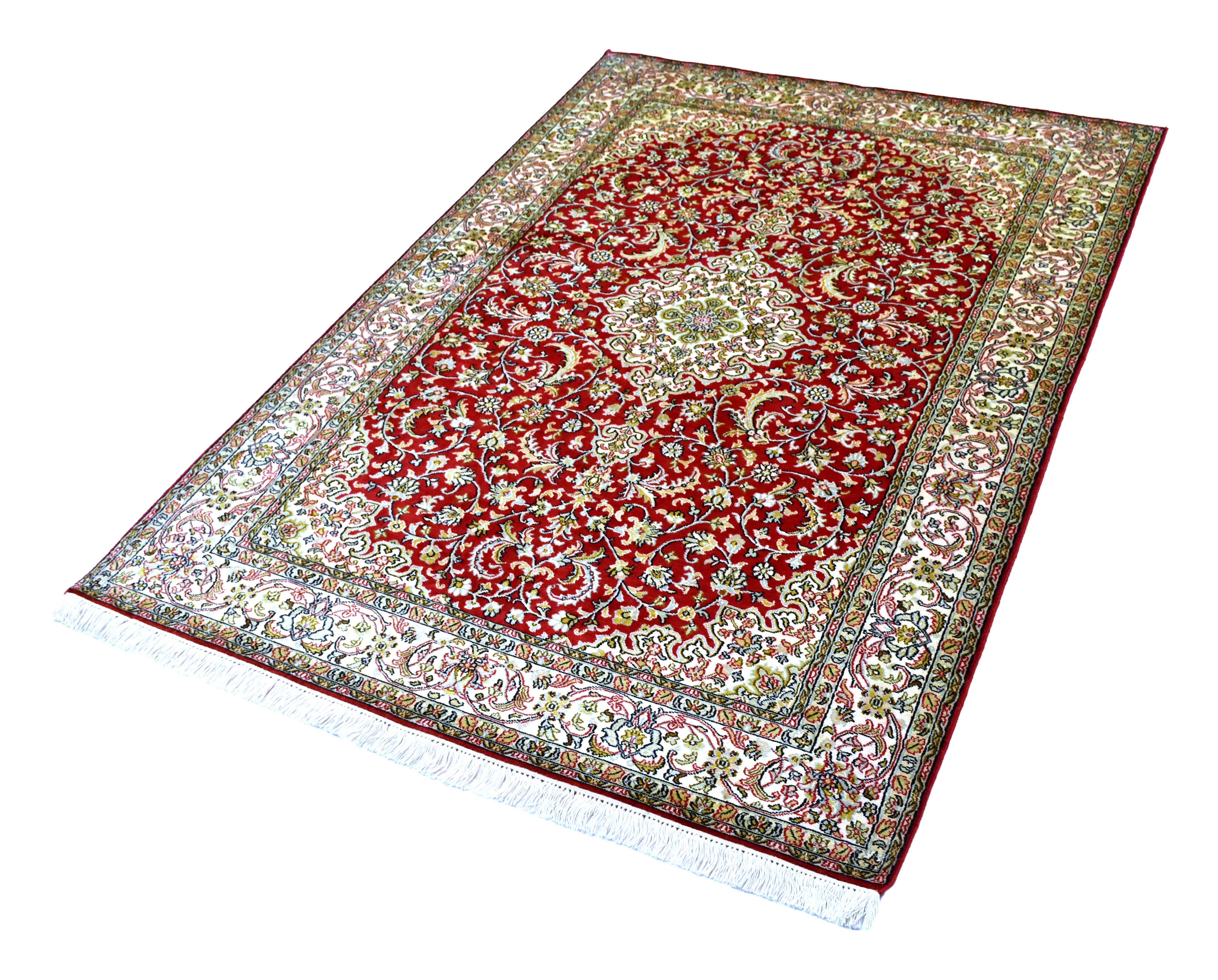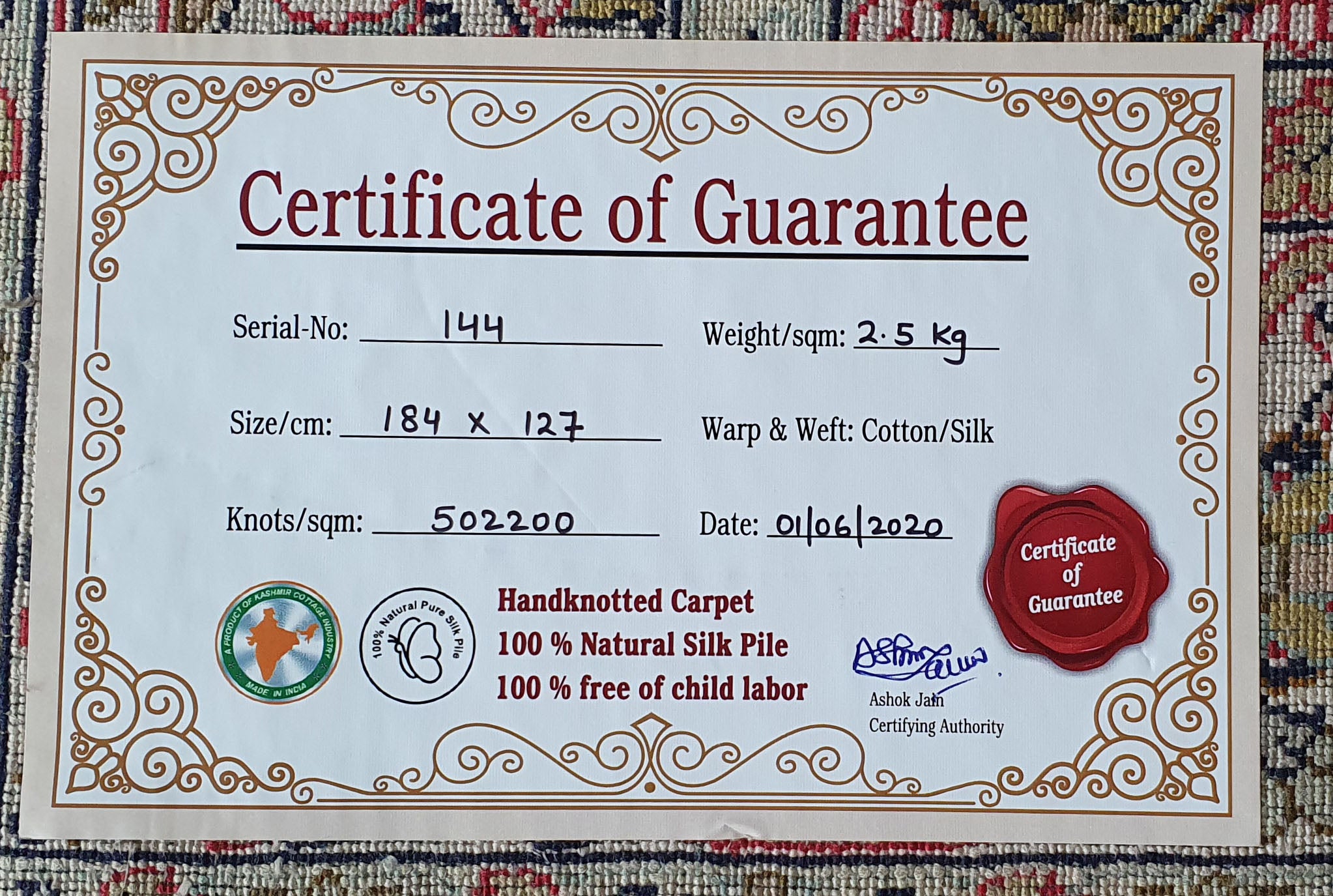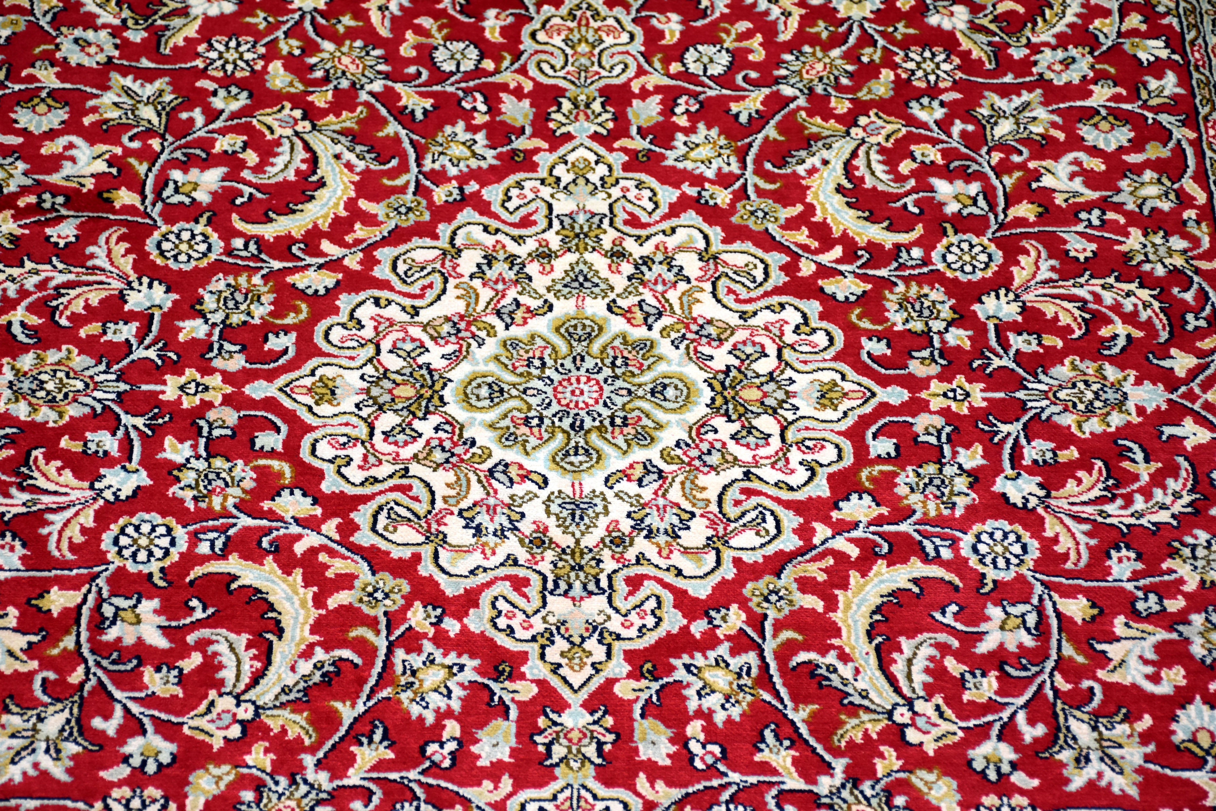 Dieser superweiche Qualitätsteppich ist echter Luxus unter Ihren Füßen, der verwöhnt und schmeichelt. Das stolze Gewicht zeugt von Langlebigkeit und macht den eleganten Teppich zu einem Spitzenprodukt. Ein handgewebter Teppich unterscheidet sich zu einem maschinell erstellten Teppich durch seine feinen Details und die kompexe Herstellungsart. Die faszinierende Bandbreite der Designs, die luxuriöse Geschmeidigkeit und Elastizität und die Lebhaftigkeit der Farben machen echte Seidenteppiche so unverkennbar. Durch das orientalische Design verleihen Sie Ihrem Zuhause einen bezaubernden fernöstlichen Look. Werten Sie Ihre Einrichtung auf und bestellen Sie sich Ihren neuen Seidenteppich.