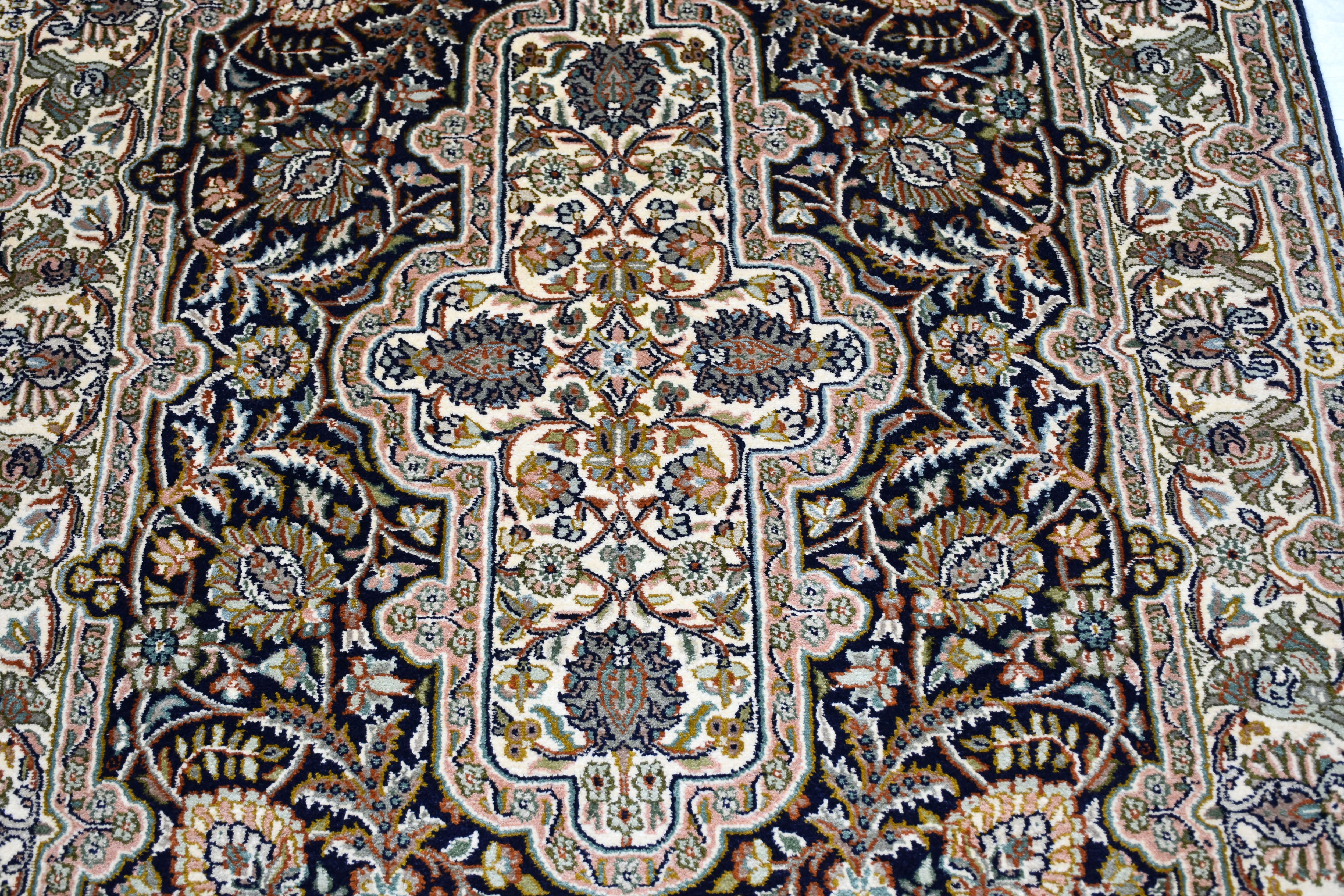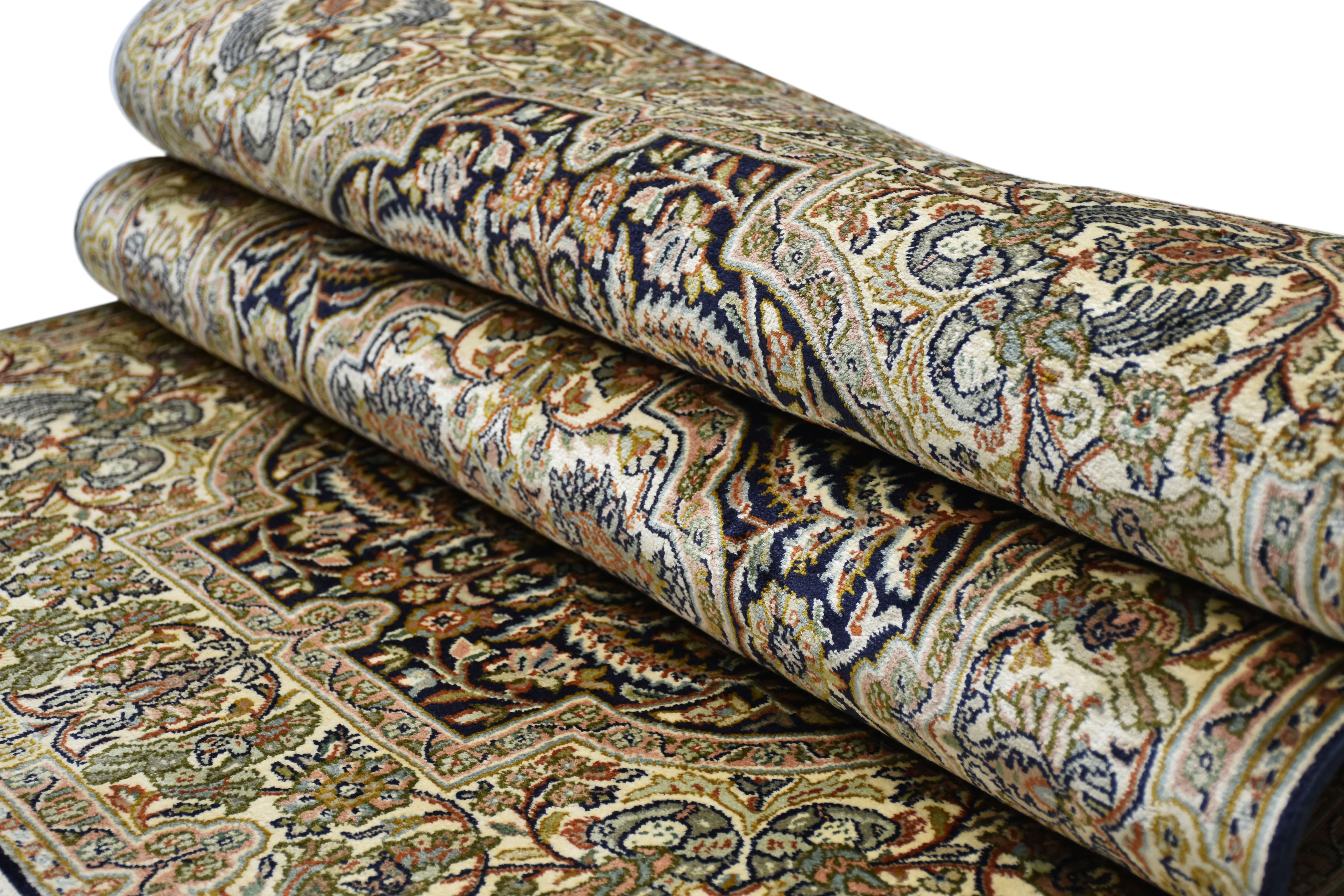 Dieser superweiche Qualitätsteppich ist echter Luxus unter Ihren Füßen, der verwöhnt und schmeichelt. Das stolze Gewicht zeugt von Langlebigkeit und macht den eleganten Teppich zu einem Spitzenprodukt. Ein handgewebter Teppich unterscheidet sich zu einem maschinell erstellten Teppich durch seine feinen Details und die kompexe Herstellungsart. Die faszinierende Bandbreite der Designs, die luxuriöse Geschmeidigkeit und Elastizität und die Lebhaftigkeit der Farben machen echte Seidenteppiche so unverkennbar. Durch das orientalische Design verleihen Sie Ihrem Zuhause einen bezaubernden fernöstlichen Look. Werten Sie Ihre Einrichtung auf und bestellen Sie sich Ihren neuen Seidenteppich.