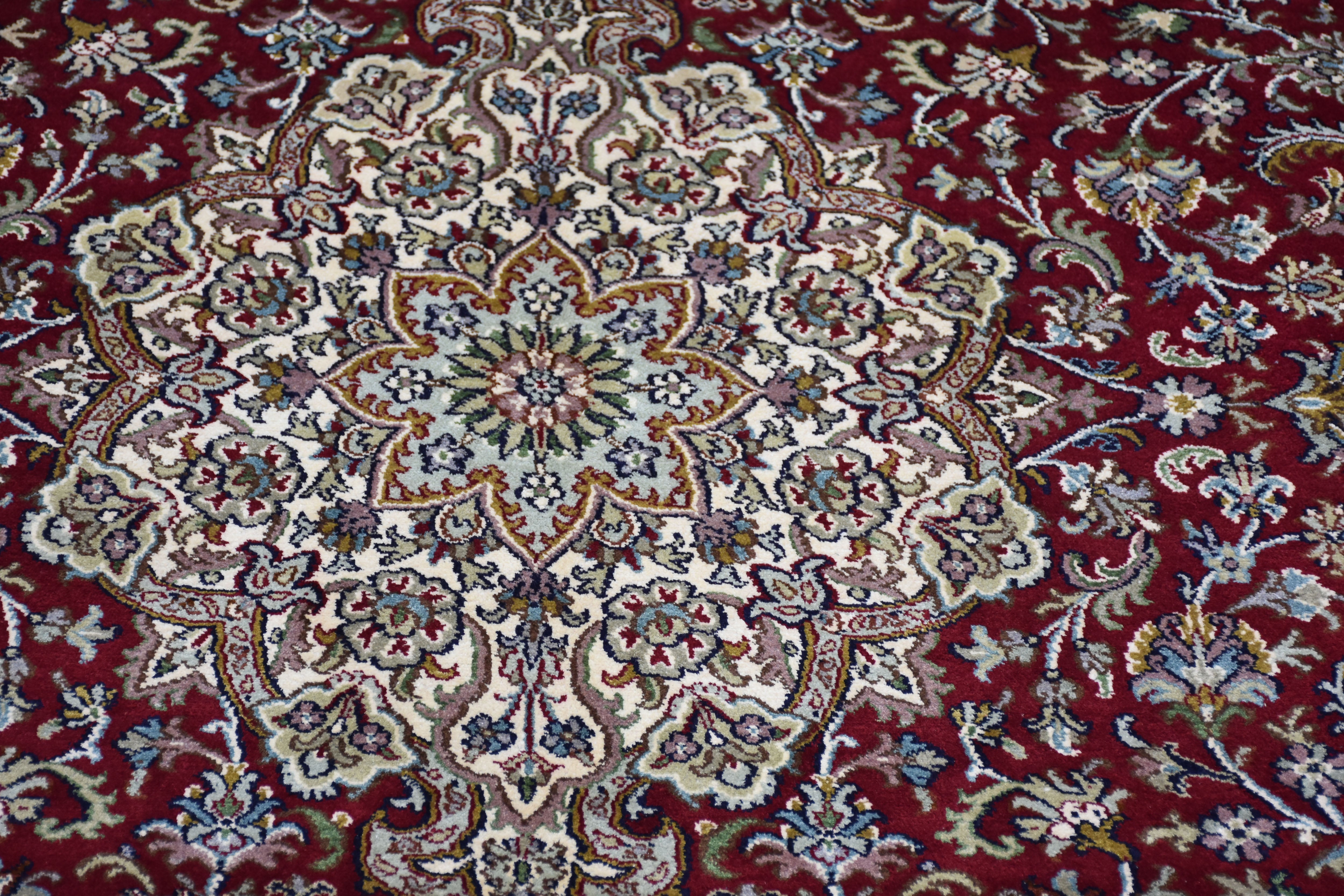 **Teppich mit Orient-Design** Dieser superweiche Qualitätsteppich ist echter Luxus unter Ihren Füßen, der verwöhnt und schmeichelt. Das stolze Gewicht zeugt von Langlebigkeit und macht den eleganten Teppich zu einem Spitzenprodukt. Ein handgewebter Teppich unterscheidet sich zu einem maschinell erstellten Teppich durch seine feinen Details und die kompexe Herstellungsart. Die faszinierende Bandbreite der Designs, die luxuriöse Geschmeidigkeit und Elastizität und die Lebhaftigkeit der Farben machen echte Seidenteppiche so unverkennbar. Durch das orientalische Design verleihen Sie Ihrem Zuhause einen bezaubernden fernöstlichen Look. Werten Sie Ihre Einrichtung auf und bestellen Sie sich Ihren neuen Seidenteppich.