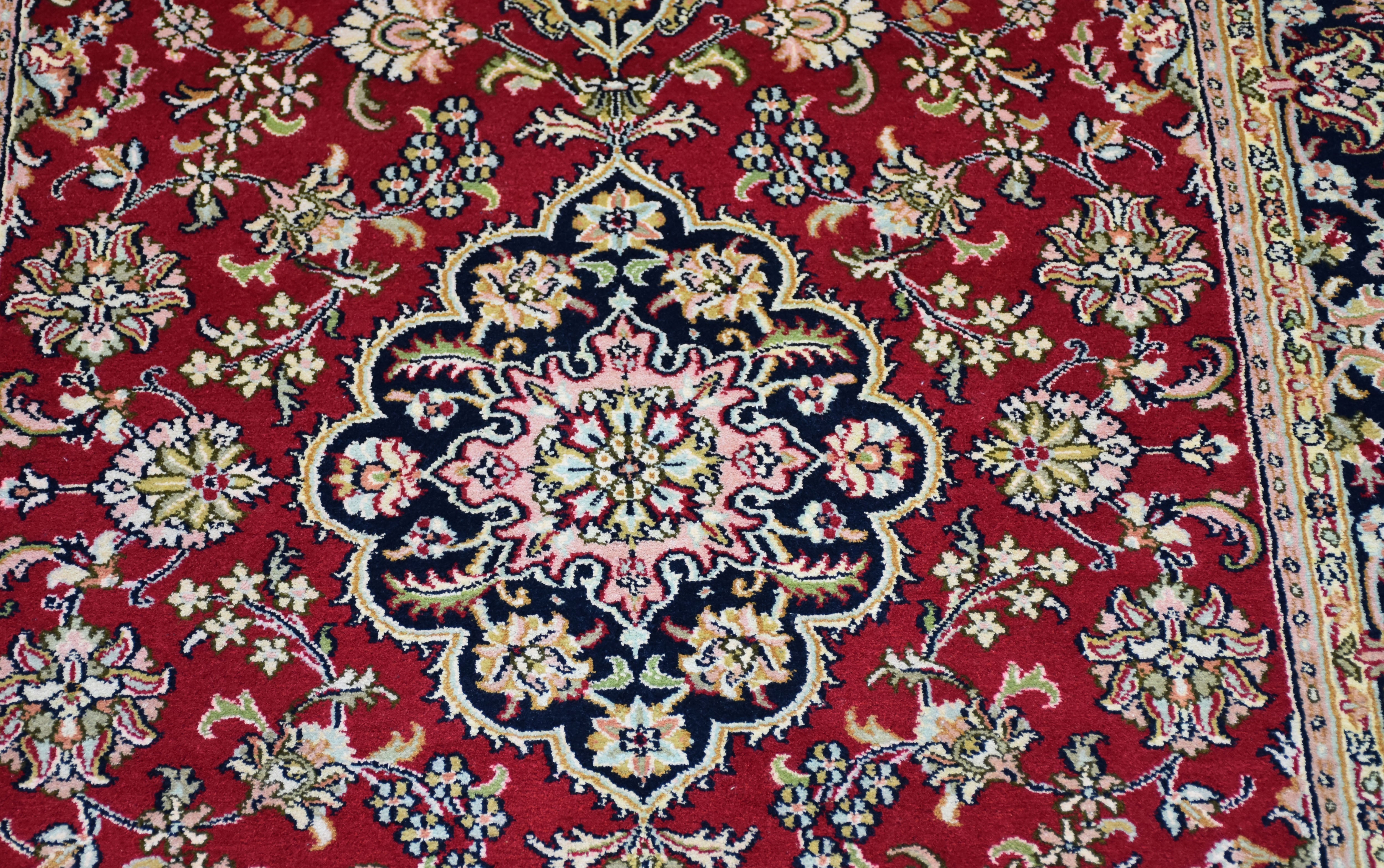 Dieser superweiche Qualitätsteppich ist echter Luxus unter Ihren Füßen, der verwöhnt und schmeichelt. Das stolze Gewicht zeugt von Langlebigkeit und macht den eleganten Teppich zu einem Spitzenprodukt. Ein handgewebter Teppich unterscheidet sich zu einem maschinell erstellten Teppich durch seine feinen Details und die kompexe Herstellungsart. Die faszinierende Bandbreite der Designs, die luxuriöse Geschmeidigkeit und Elastizität und die Lebhaftigkeit der Farben machen echte Seidenteppiche so unverkennbar. Durch das orientalische Design verleihen Sie Ihrem Zuhause einen bezaubernden fernöstlichen Look. Werten Sie Ihre Einrichtung auf und bestellen Sie sich Ihren neuen Seidenteppich.