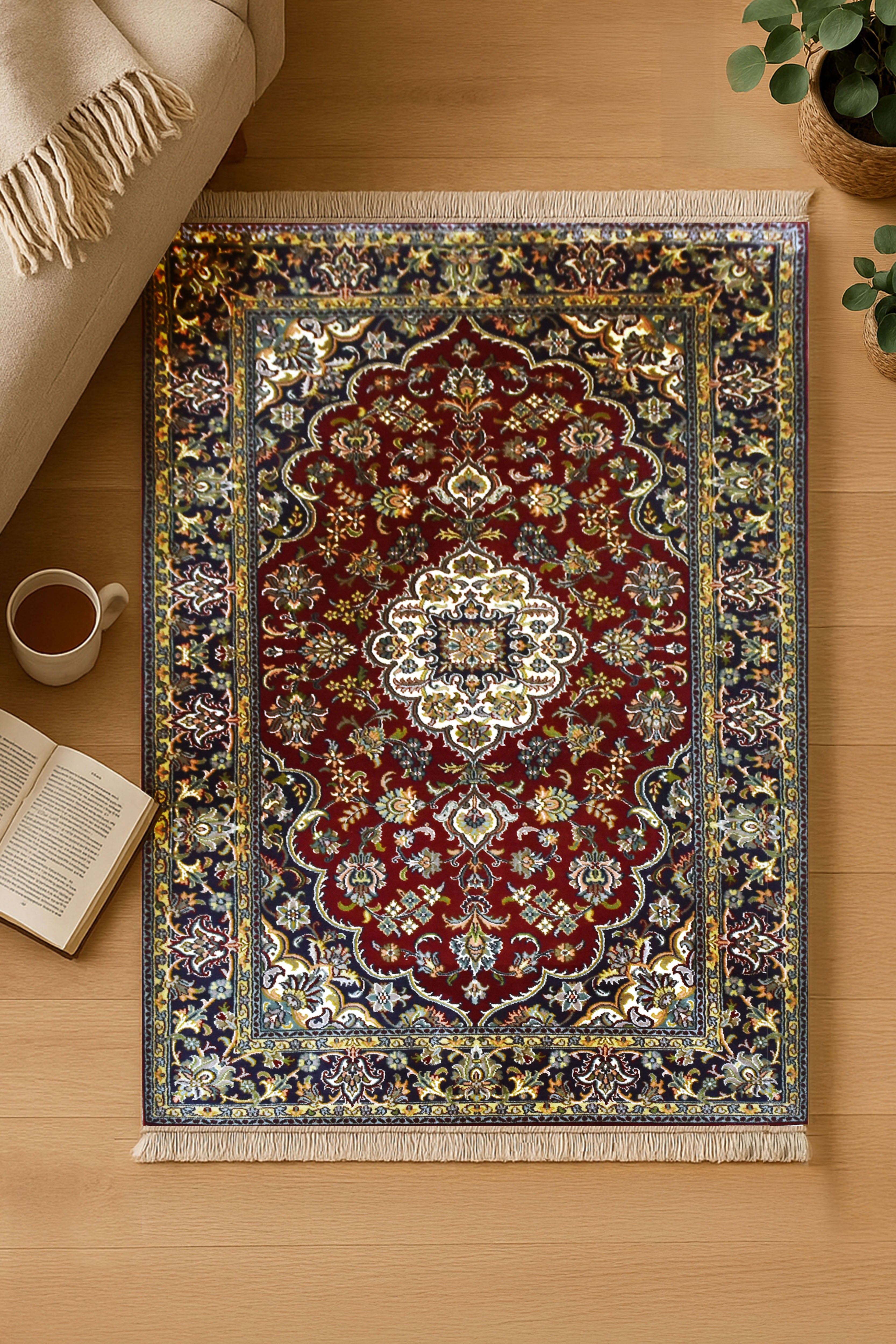 Dieser superweiche Qualitätsteppich ist echter Luxus unter Ihren Füßen, der verwöhnt und schmeichelt. Das stolze Gewicht zeugt von Langlebigkeit und macht den eleganten Teppich zu einem Spitzenprodukt. Ein handgewebter Teppich unterscheidet sich zu einem maschinell erstellten Teppich durch seine feinen Details und die kompexe Herstellungsart. Die faszinierende Bandbreite der Designs, die luxuriöse Geschmeidigkeit und Elastizität und die Lebhaftigkeit der Farben machen echte Seidenteppiche so unverkennbar. Durch das orientalische Design verleihen Sie Ihrem Zuhause einen bezaubernden fernöstlichen Look. Werten Sie Ihre Einrichtung auf und bestellen Sie sich Ihren neuen Seidenteppich.