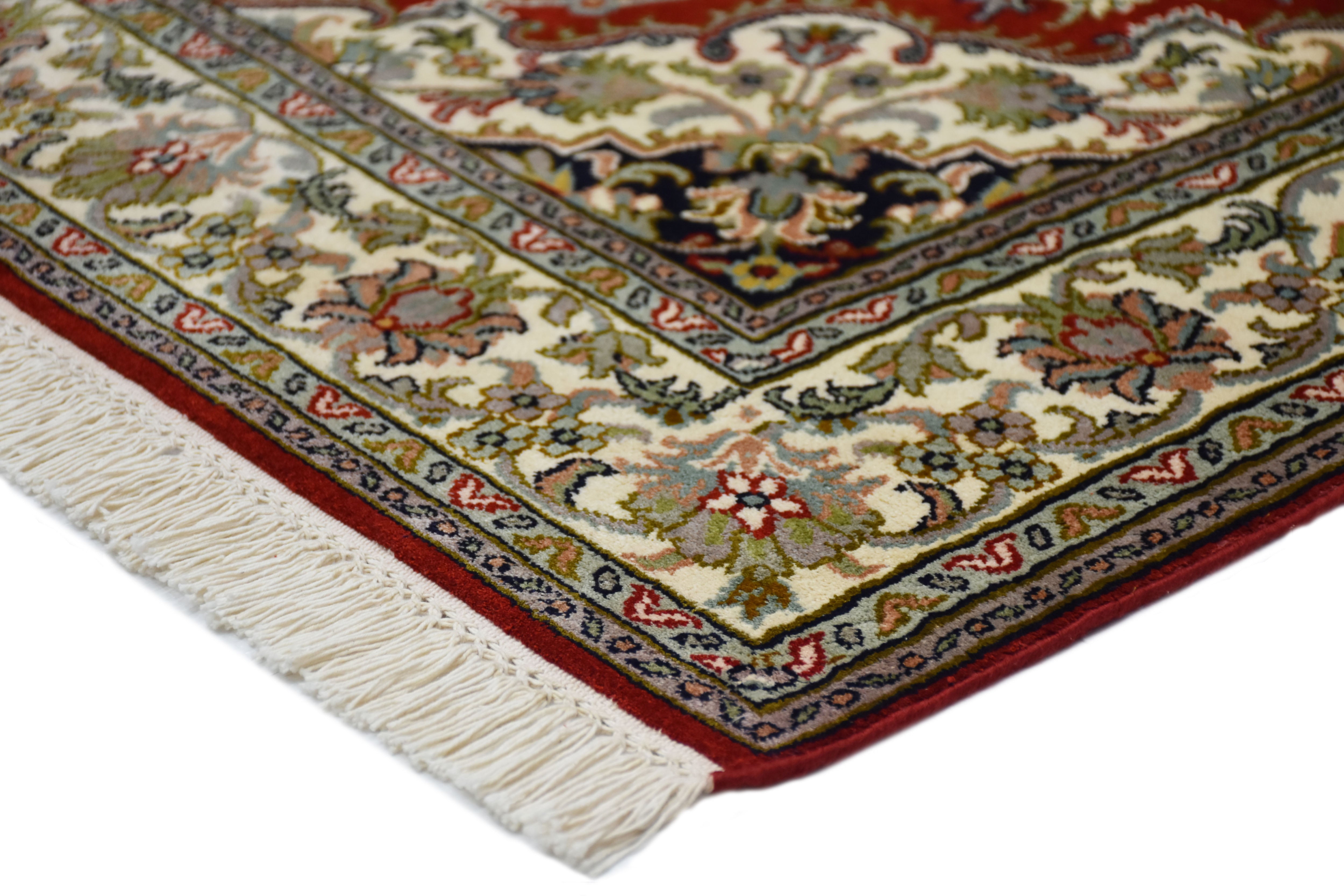 Dieser superweiche Qualitätsteppich ist echter Luxus unter Ihren Füßen, der verwöhnt und schmeichelt. Das stolze Gewicht zeugt von Langlebigkeit und macht den eleganten Teppich zu einem Spitzenprodukt. Ein handgewebter Teppich unterscheidet sich zu einem maschinell erstellten Teppich durch seine feinen Details und die kompexe Herstellungsart. Die faszinierende Bandbreite der Designs, die luxuriöse Geschmeidigkeit und Elastizität und die Lebhaftigkeit der Farben machen echte Seidenteppiche so unverkennbar. Durch das orientalische Design verleihen Sie Ihrem Zuhause einen bezaubernden fernöstlichen Look. Werten Sie Ihre Einrichtung auf und bestellen Sie sich Ihren neuen Seidenteppich.