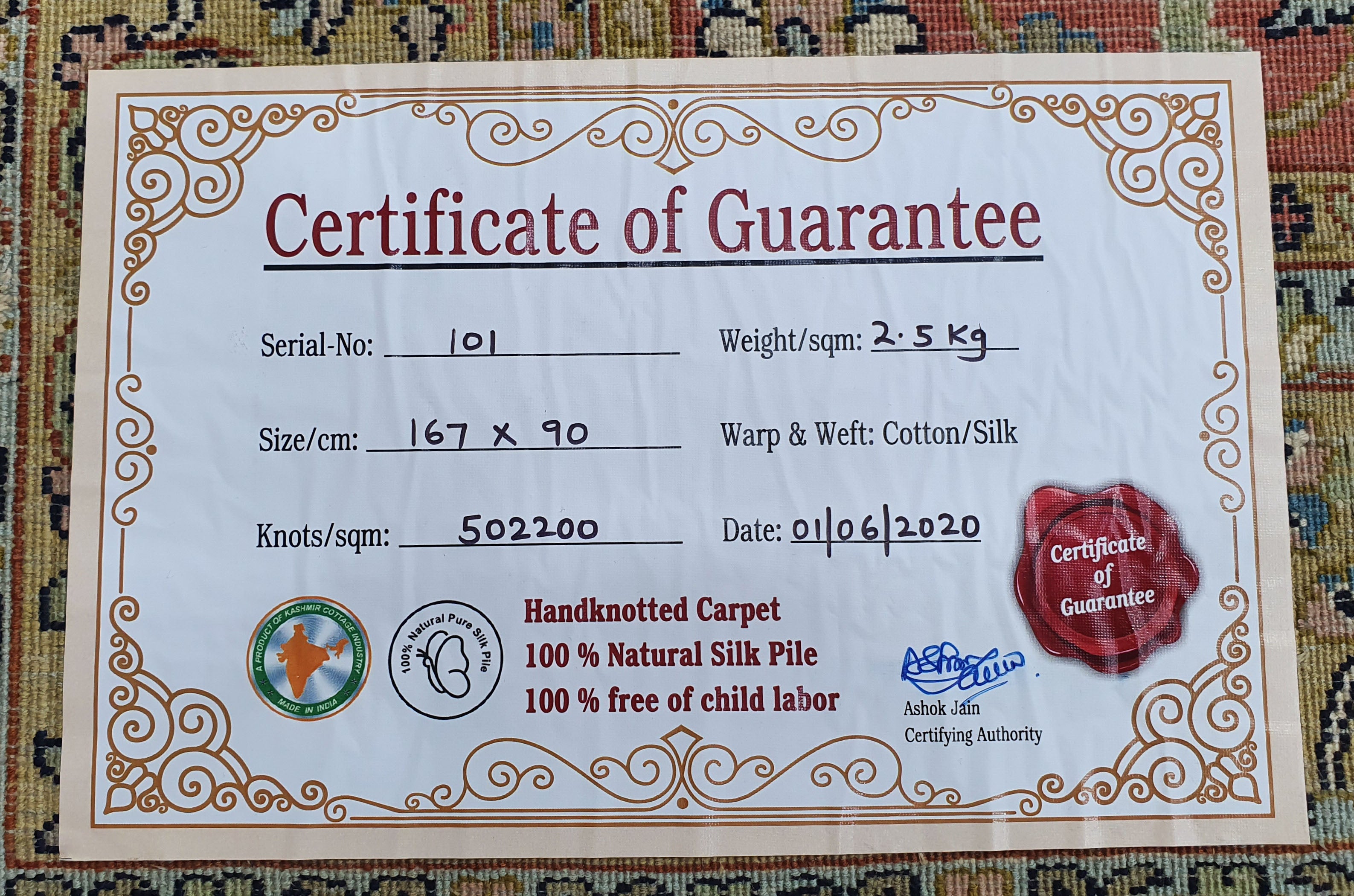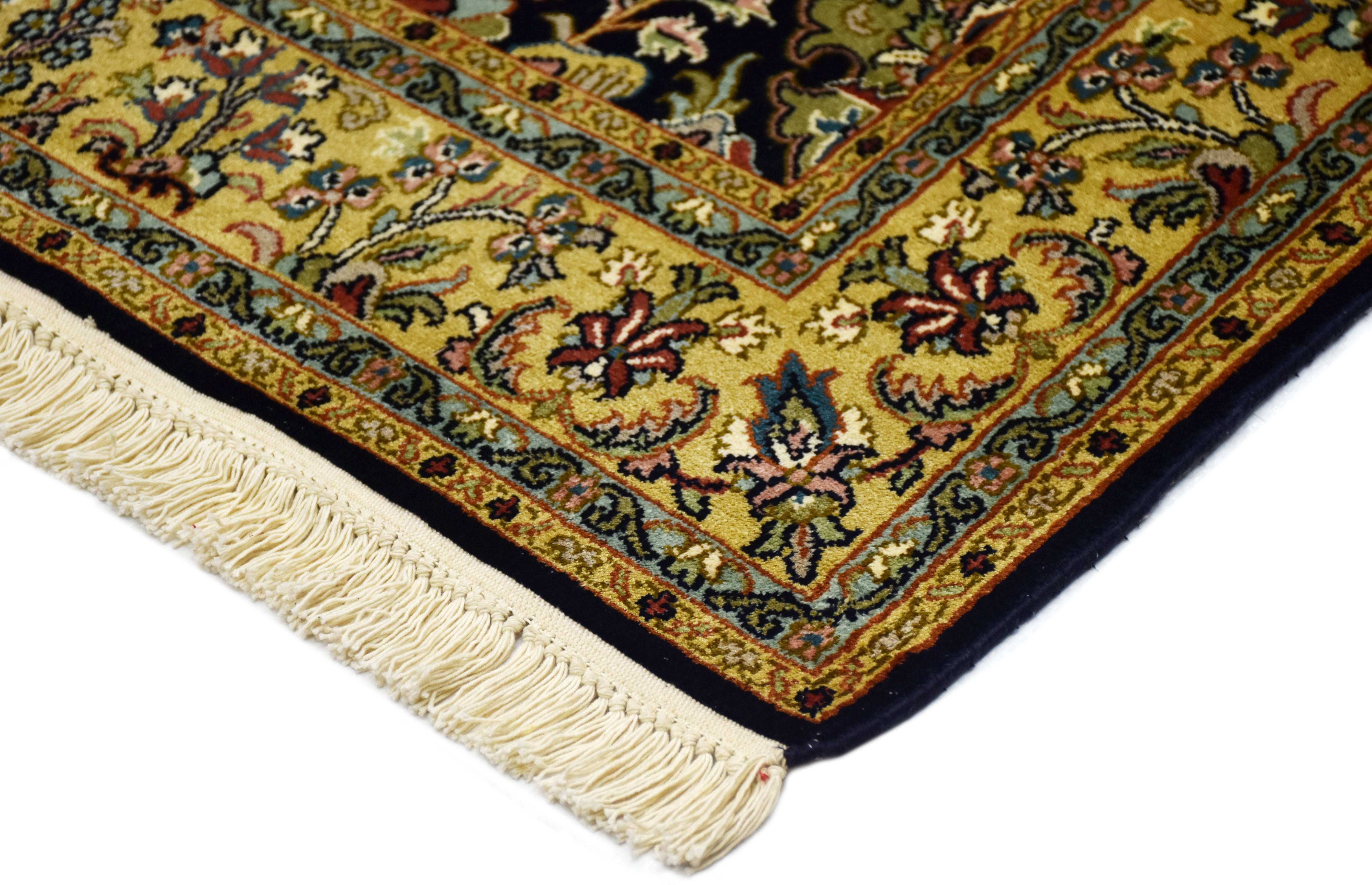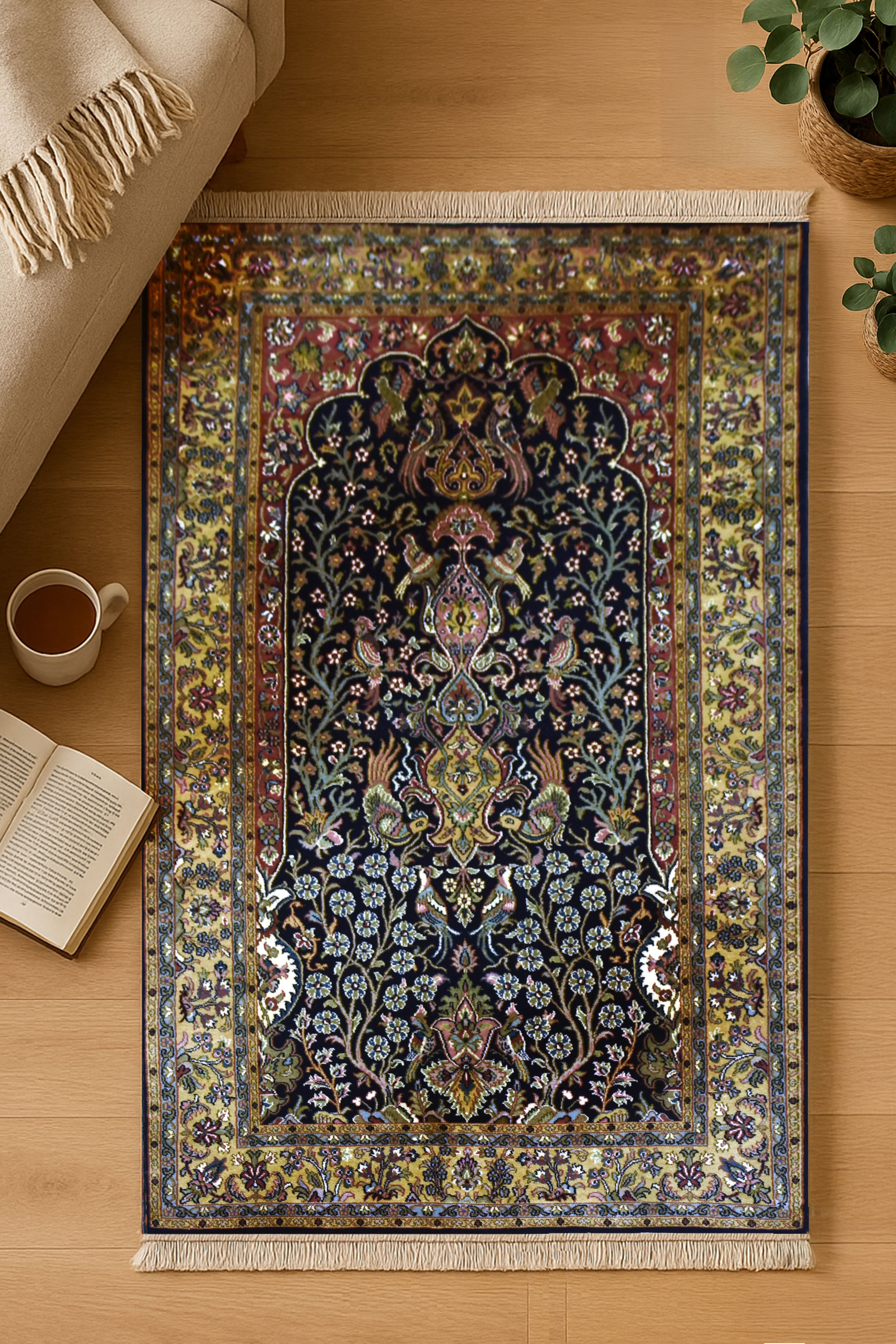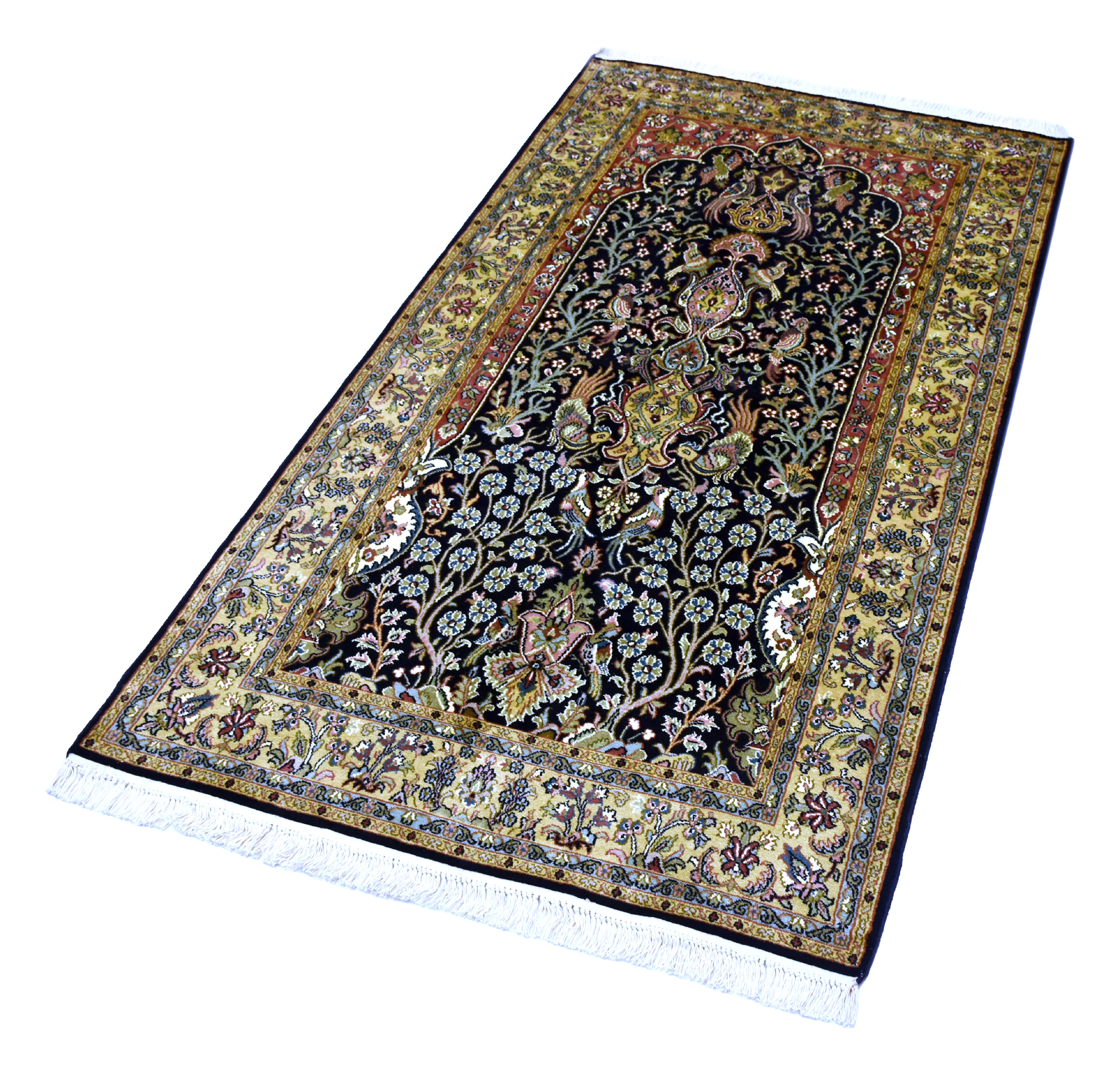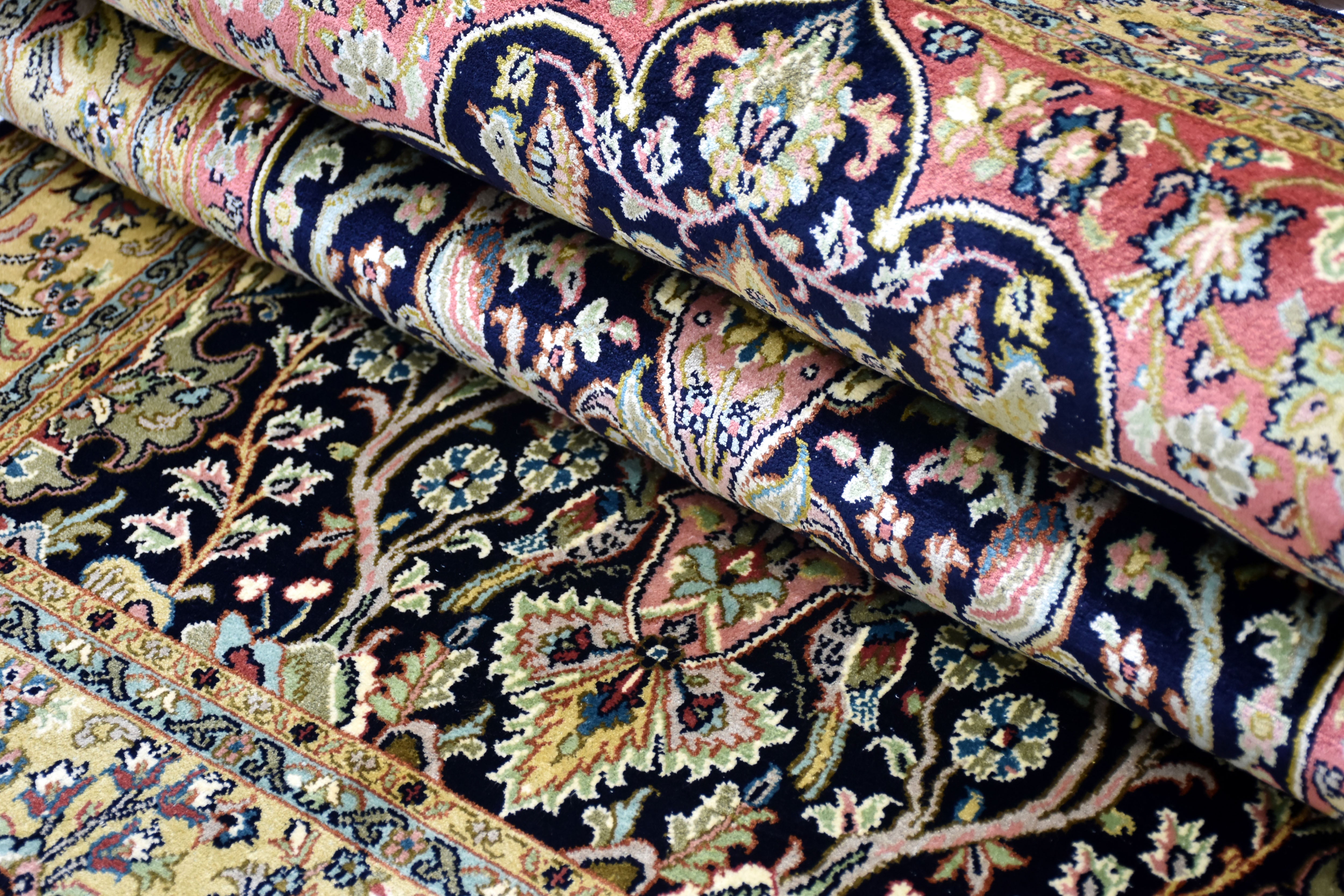 Dieser superweiche Qualitätsteppich ist echter Luxus unter Ihren Füßen, der verwöhnt und schmeichelt. Das stolze Gewicht zeugt von Langlebigkeit und macht den eleganten Teppich zu einem Spitzenprodukt. Ein handgewebter Teppich unterscheidet sich zu einem maschinell erstellten Teppich durch seine feinen Details und die kompexe Herstellungsart. Die faszinierende Bandbreite der Designs, die luxuriöse Geschmeidigkeit und Elastizität und die Lebhaftigkeit der Farben machen echte Seidenteppiche so unverkennbar. Durch das orientalische Design verleihen Sie Ihrem Zuhause einen bezaubernden fernöstlichen Look. Werten Sie Ihre Einrichtung auf und bestellen Sie sich Ihren neuen Seidenteppich.