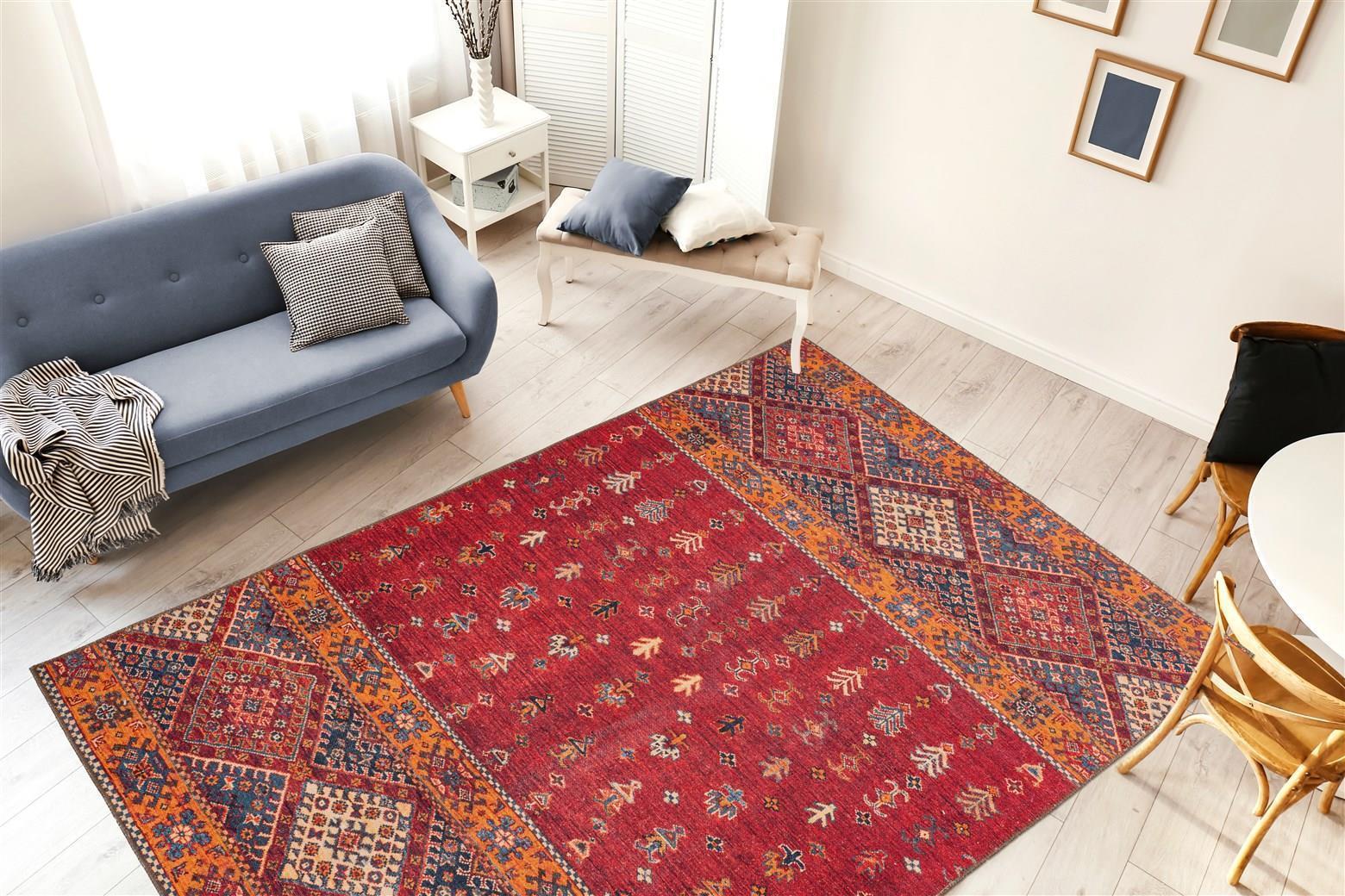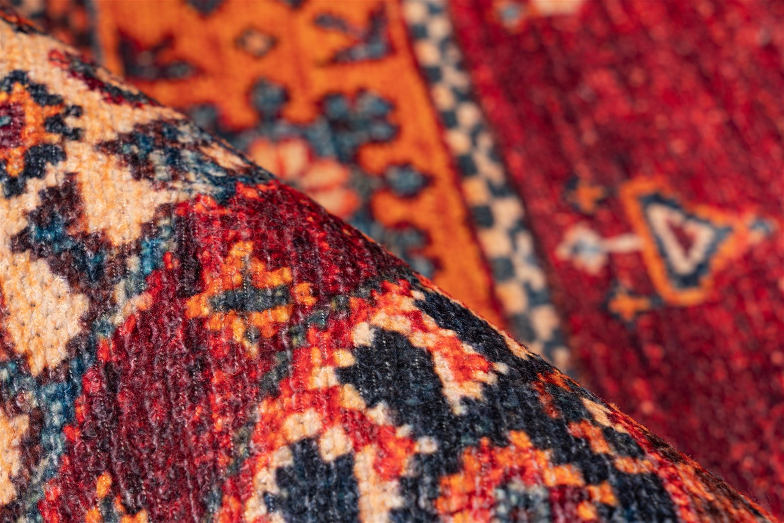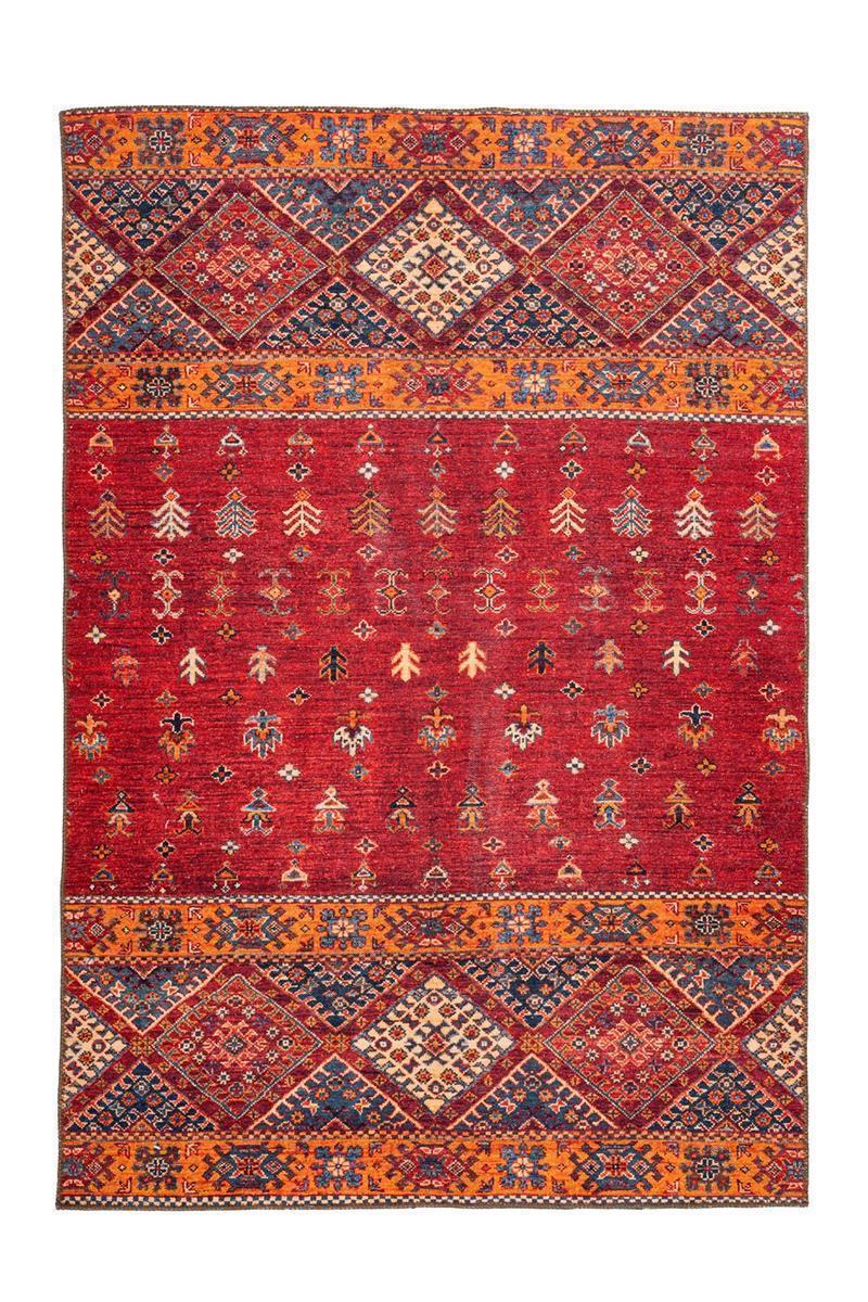 **Geprinteter Flachflorteppich** Das stilvolle Print-Design dieses Flachflorteppichs kann mit seinem Vintage-Charakter im orientalischen Stil auf ganzer Linie punkten. Das Design besticht durch attraktive charakteristische Verwaschungen, eine sommerliche Farbgebung und orientalische Elemente. Verleihen Sie Ihrem Zuhause einen fernöstlichen Look, indem Sie den stilvollen Teppich mit farbenfrohen Kissen, edlen Wohnaccessoires und glanzvollen Dekoartikeln kombinieren. Besonders gut eignen sich Materialien in Gold, Bronze und Silber oder edle Variationen in Samt, Seide oder Leder. Kreieren Sie ein prunkvolles Gesamtambiente mit stilvollen Highlights, sodass Sie und Ihre Besucher sich rundum wohlfühlen können. Dank seines sehr flachen Flors ist der Teppich besonders leicht und kann einfach umplatziert werden. Das Material macht die Oberfläche pflegeleicht. Verstärkt ist der Flor durch einen robusten Rücken aus Baumwolle. In Räumen mit Fußbodenheizung kann der Teppich ebenso platziert werden wie in Räumen mit herkömmlichen Heizkörpern. Die sommerliche Aufmachung des Teppichs ist keineswegs nur für den Sommer geeignet, sondern ein Allrounder für alle Jahreszeiten, denn vor allem in den kalten Jahreszeiten eignen sich warme Farbtöne ideal, um ein stimmungsvolles Ambiente im Raum zu kreieren.