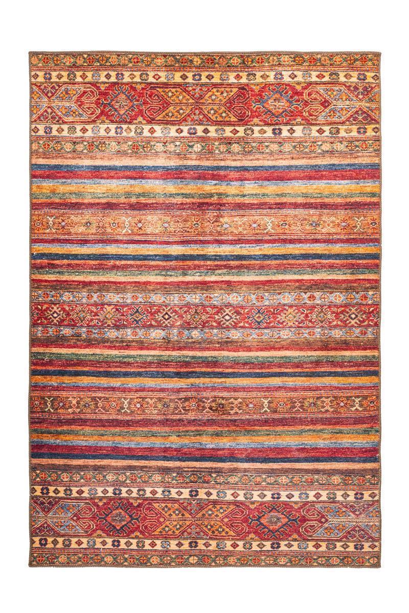 **Geprinteter Flachflorteppich** Das stilvolle Print-Design dieses Flachflorteppichs kann mit seinem Vintage-Charakter im orientalischen Stil auf ganzer Linie punkten. Das Design besticht durch attraktive charakteristische Verwaschungen, eine sommerliche Farbgebung und orientalische Elemente. Verleihen Sie Ihrem Zuhause einen fernöstlichen Look, indem Sie den stilvollen Teppich mit farbenfrohen Kissen, edlen Wohnaccessoires und glanzvollen Dekoartikeln kombinieren. Besonders gut eignen sich Materialien in Gold, Bronze und Silber oder edle Variationen in Samt, Seide oder Leder. Kreieren Sie ein prunkvolles Gesamtambiente mit stilvollen Highlights, sodass Sie und Ihre Besucher sich rundum wohlfühlen können. Dank seines sehr flachen Flors ist der Teppich besonders leicht und kann einfach umplatziert werden. Das Material macht die Oberfläche pflegeleicht. Verstärkt ist der Flor durch einen robusten Rücken aus Baumwolle. In Räumen mit Fußbodenheizung kann der Teppich ebenso platziert werden wie in Räumen mit herkömmlichen Heizkörpern. Die sommerliche Aufmachung des Teppichs ist keineswegs nur für den Sommer geeignet, sondern ein Allrounder für alle Jahreszeiten, denn vor allem in den kalten Jahreszeiten eignen sich warme Farbtöne ideal, um ein stimmungsvolles Ambiente im Raum zu kreieren.