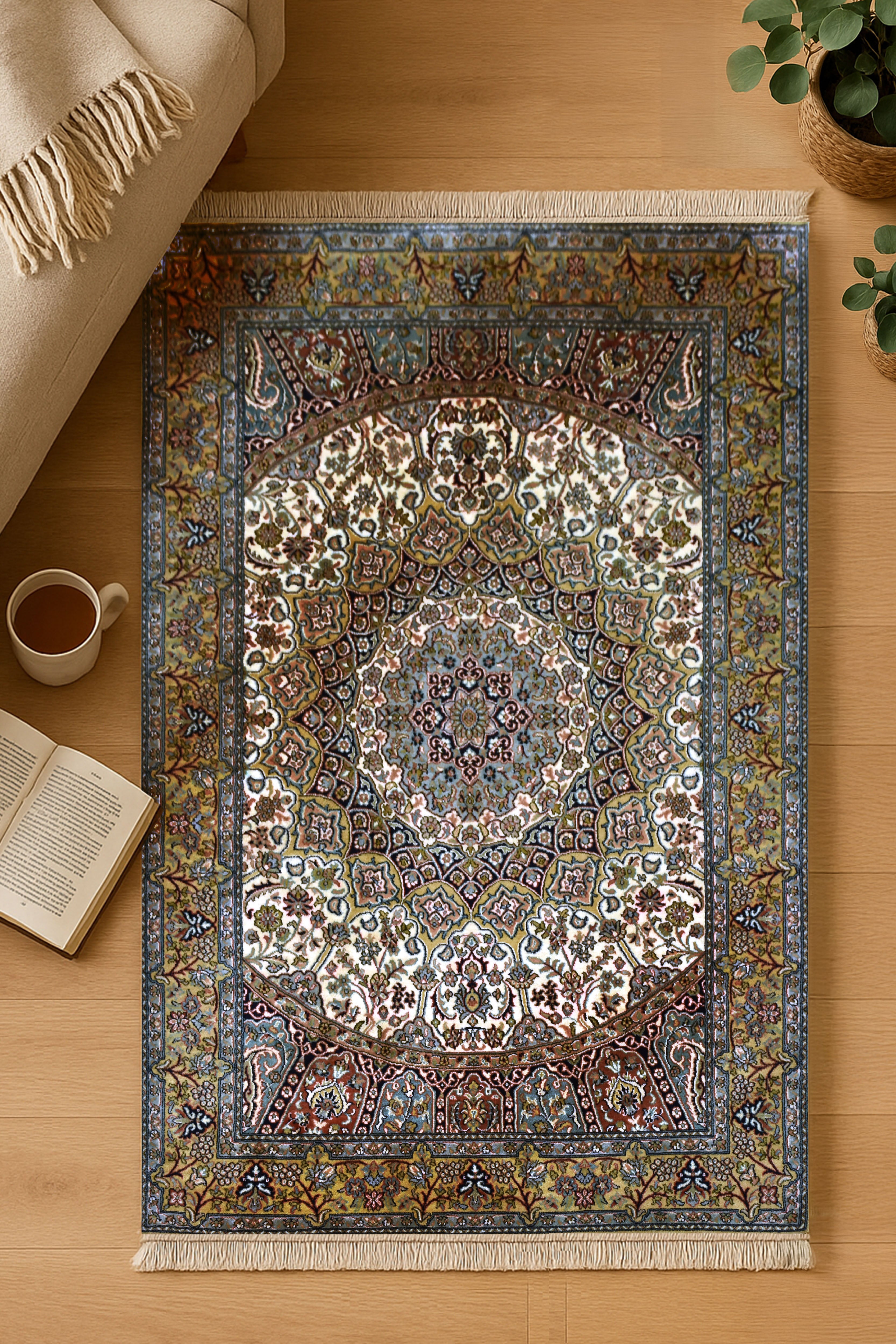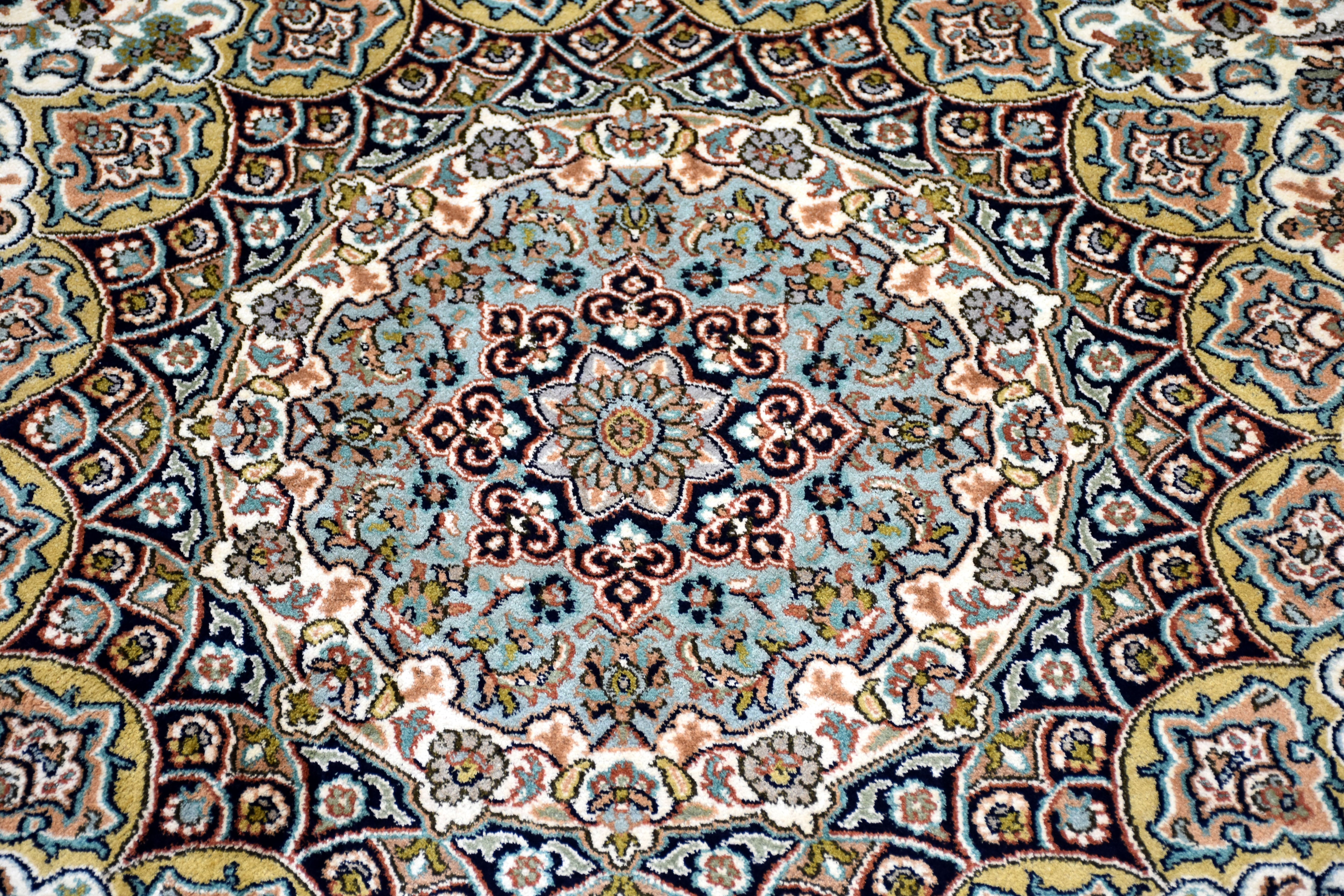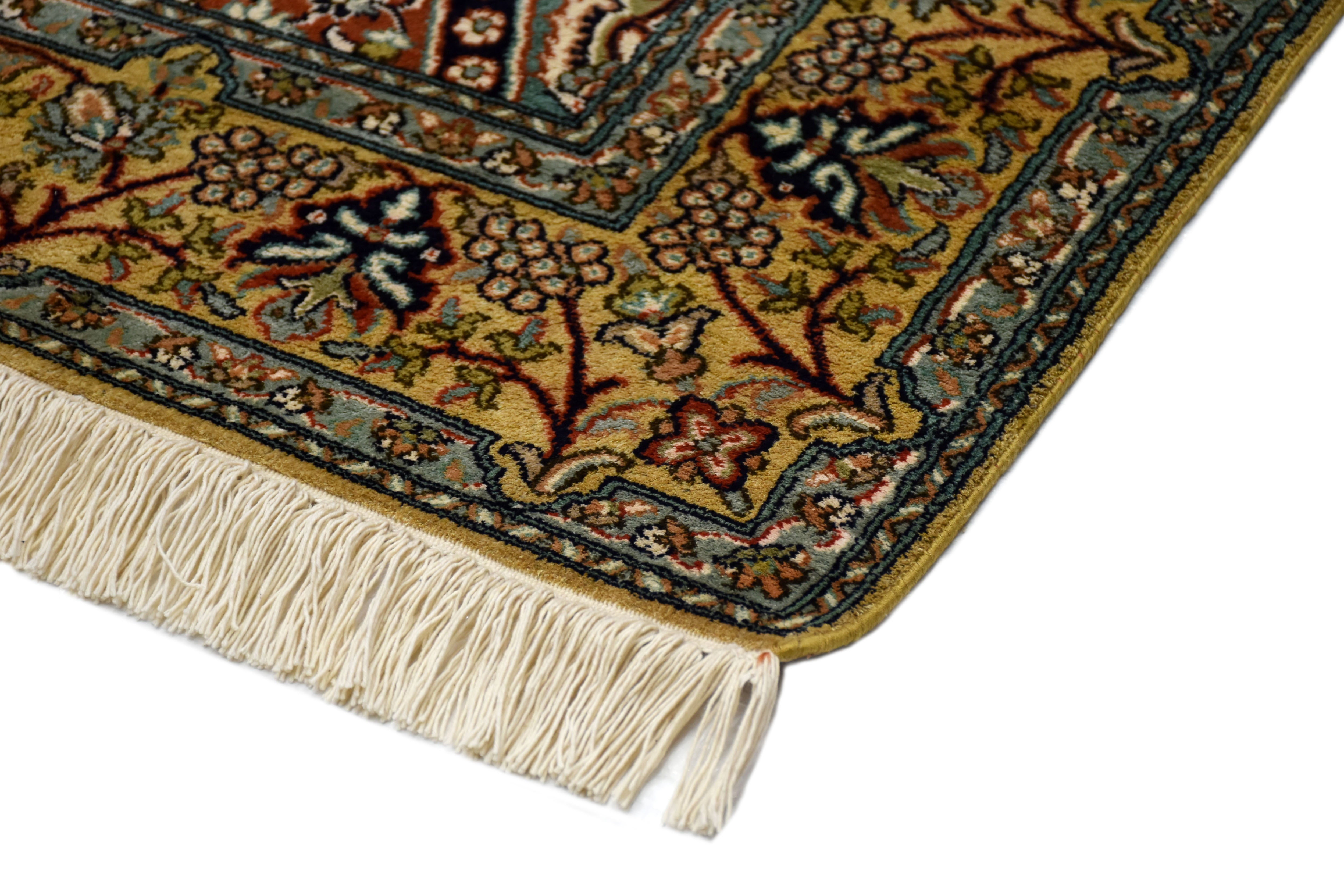 Dieser superweiche Qualitätsteppich ist echter Luxus unter Ihren Füßen, der verwöhnt und schmeichelt. Das stolze Gewicht zeugt von Langlebigkeit und macht den eleganten Teppich zu einem Spitzenprodukt. Ein handgewebter Teppich unterscheidet sich zu einem maschinell erstellten Teppich durch seine feinen Details und die kompexe Herstellungsart. Die faszinierende Bandbreite der Designs, die luxuriöse Geschmeidigkeit und Elastizität und die Lebhaftigkeit der Farben machen echte Seidenteppiche so unverkennbar. Durch das orientalische Design verleihen Sie Ihrem Zuhause einen bezaubernden fernöstlichen Look. Werten Sie Ihre Einrichtung auf und bestellen Sie sich Ihren neuen Seidenteppich.