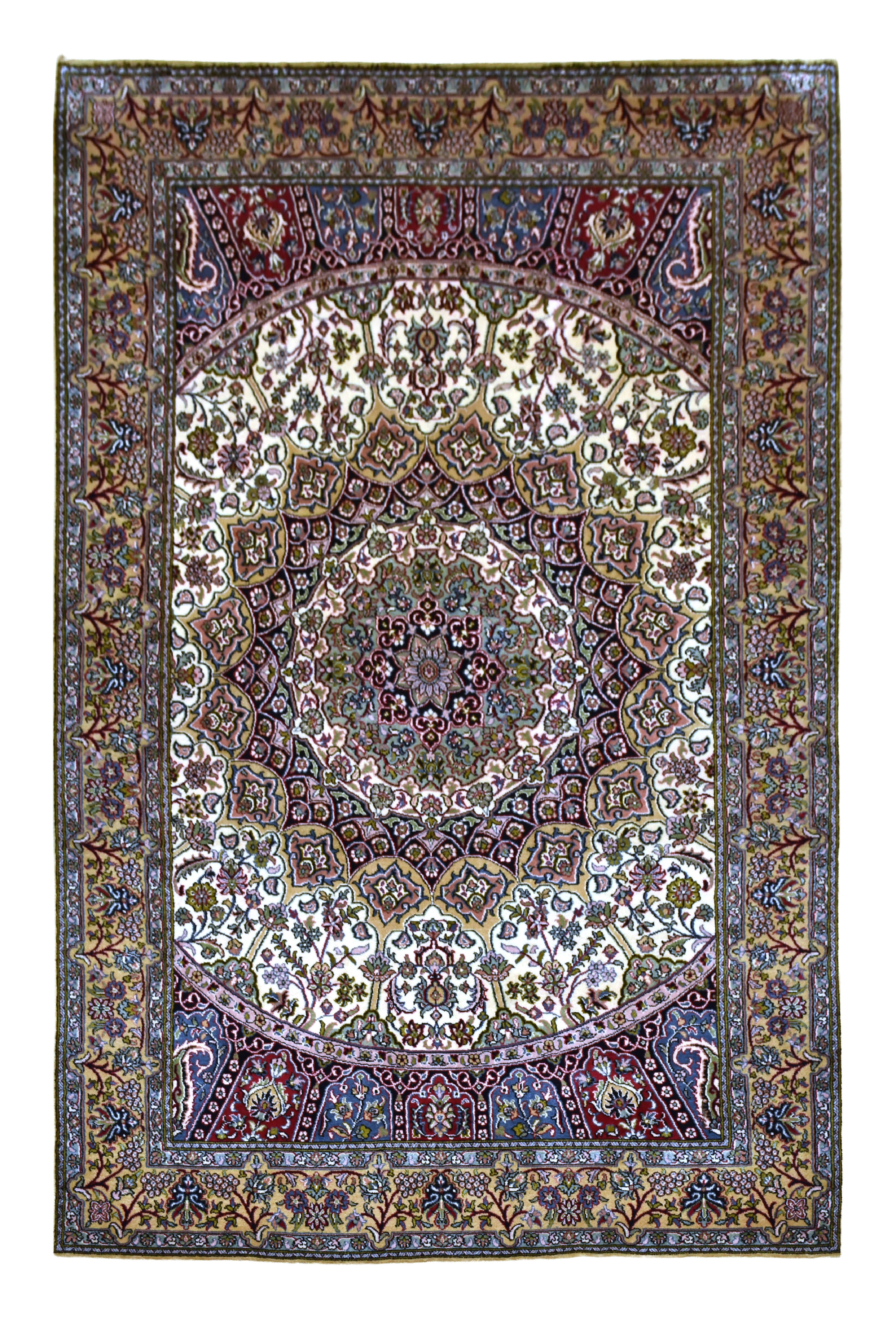 Dieser superweiche Qualitätsteppich ist echter Luxus unter Ihren Füßen, der verwöhnt und schmeichelt. Das stolze Gewicht zeugt von Langlebigkeit und macht den eleganten Teppich zu einem Spitzenprodukt. Ein handgewebter Teppich unterscheidet sich zu einem maschinell erstellten Teppich durch seine feinen Details und die kompexe Herstellungsart. Die faszinierende Bandbreite der Designs, die luxuriöse Geschmeidigkeit und Elastizität und die Lebhaftigkeit der Farben machen echte Seidenteppiche so unverkennbar. Durch das orientalische Design verleihen Sie Ihrem Zuhause einen bezaubernden fernöstlichen Look. Werten Sie Ihre Einrichtung auf und bestellen Sie sich Ihren neuen Seidenteppich.