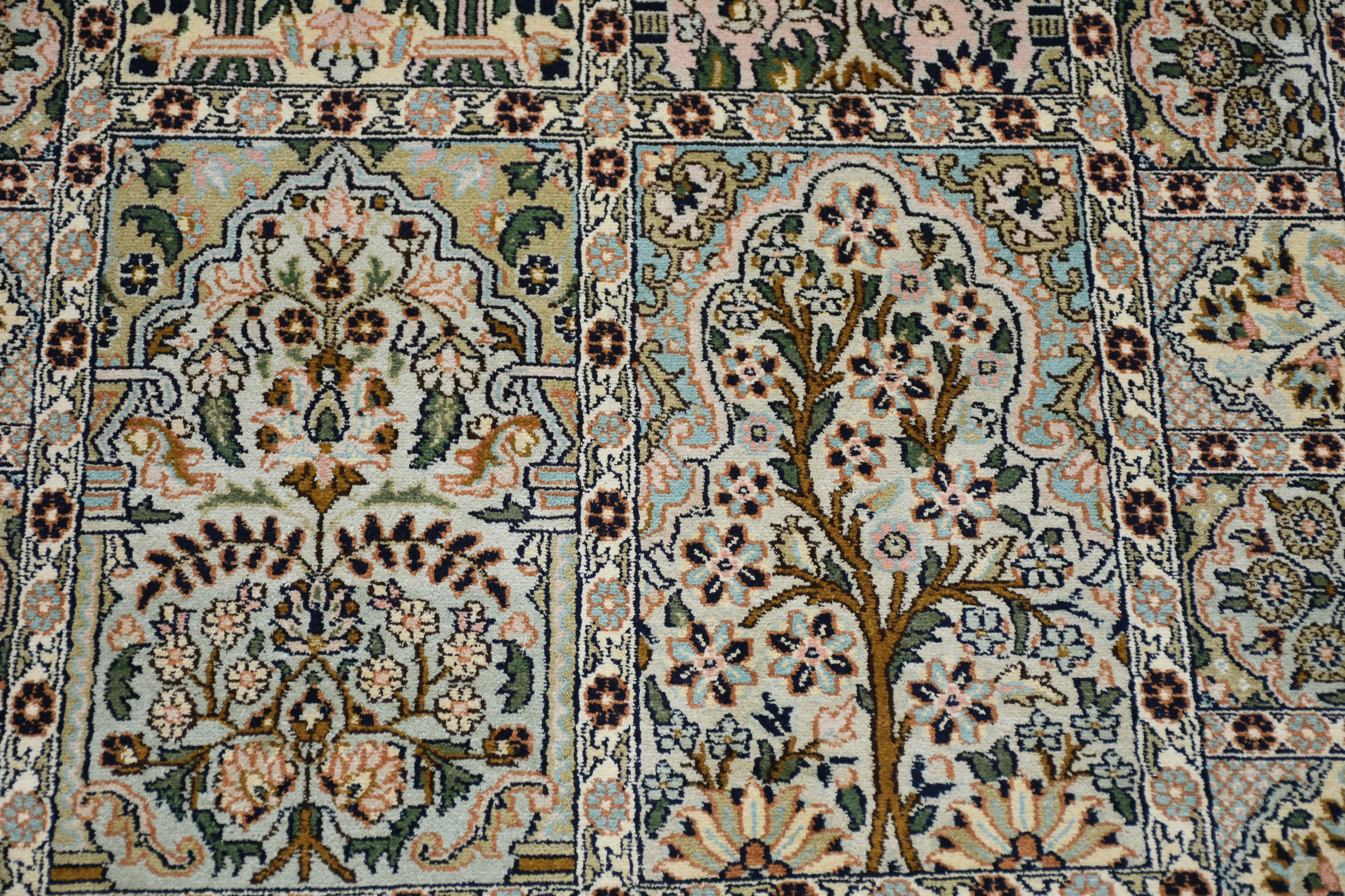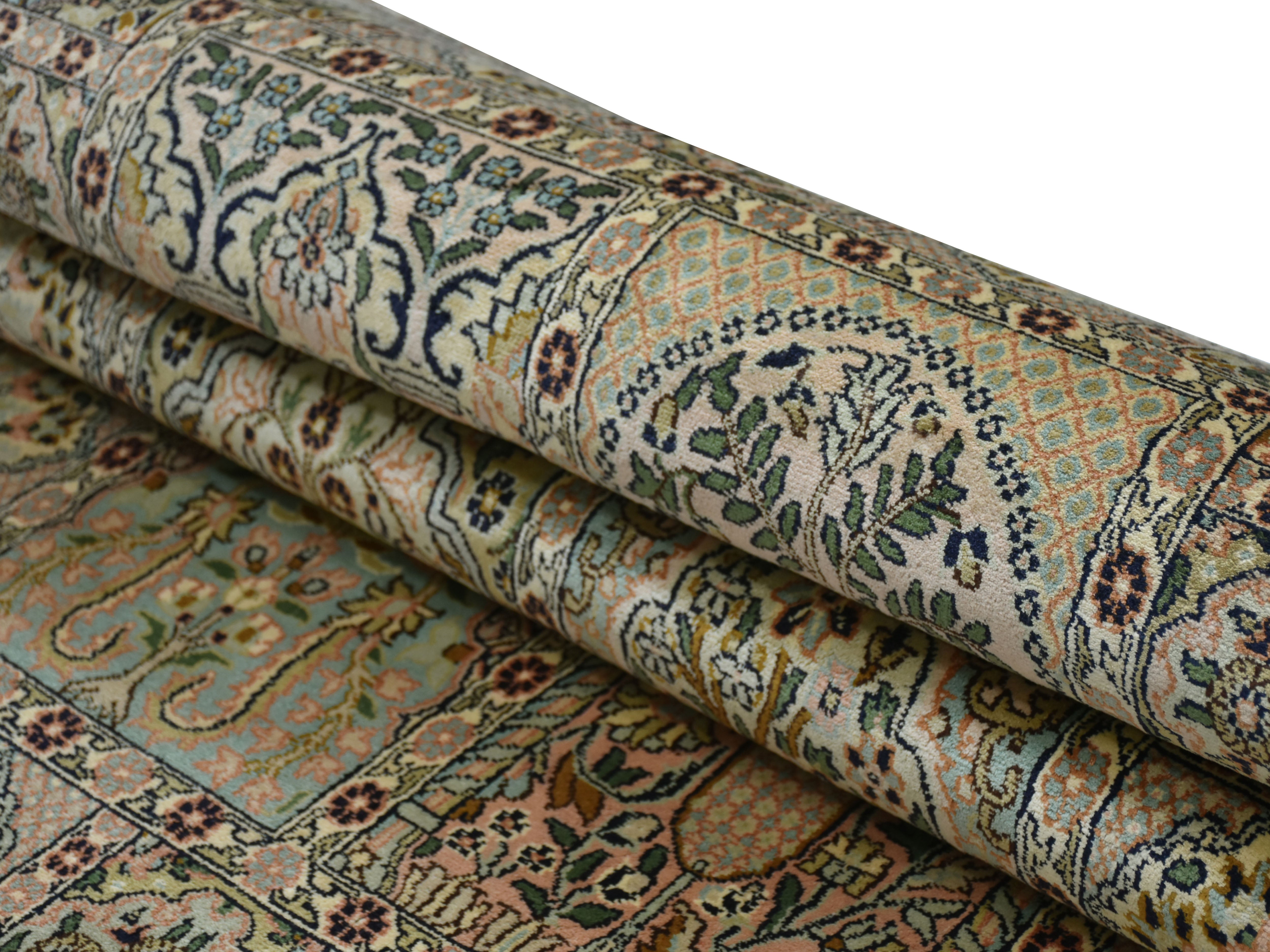 Dieser superweiche Qualitätsteppich ist echter Luxus unter Ihren Füßen, der verwöhnt und schmeichelt. Das stolze Gewicht zeugt von Langlebigkeit und macht den eleganten Teppich zu einem Spitzenprodukt. Ein handgewebter Teppich unterscheidet sich zu einem maschinell erstellten Teppich durch seine feinen Details und die kompexe Herstellungsart. Die faszinierende Bandbreite der Designs, die luxuriöse Geschmeidigkeit und Elastizität und die Lebhaftigkeit der Farben machen echte Seidenteppiche so unverkennbar. Durch das orientalische Design verleihen Sie Ihrem Zuhause einen bezaubernden fernöstlichen Look. Werten Sie Ihre Einrichtung auf und bestellen Sie sich Ihren neuen Seidenteppich.