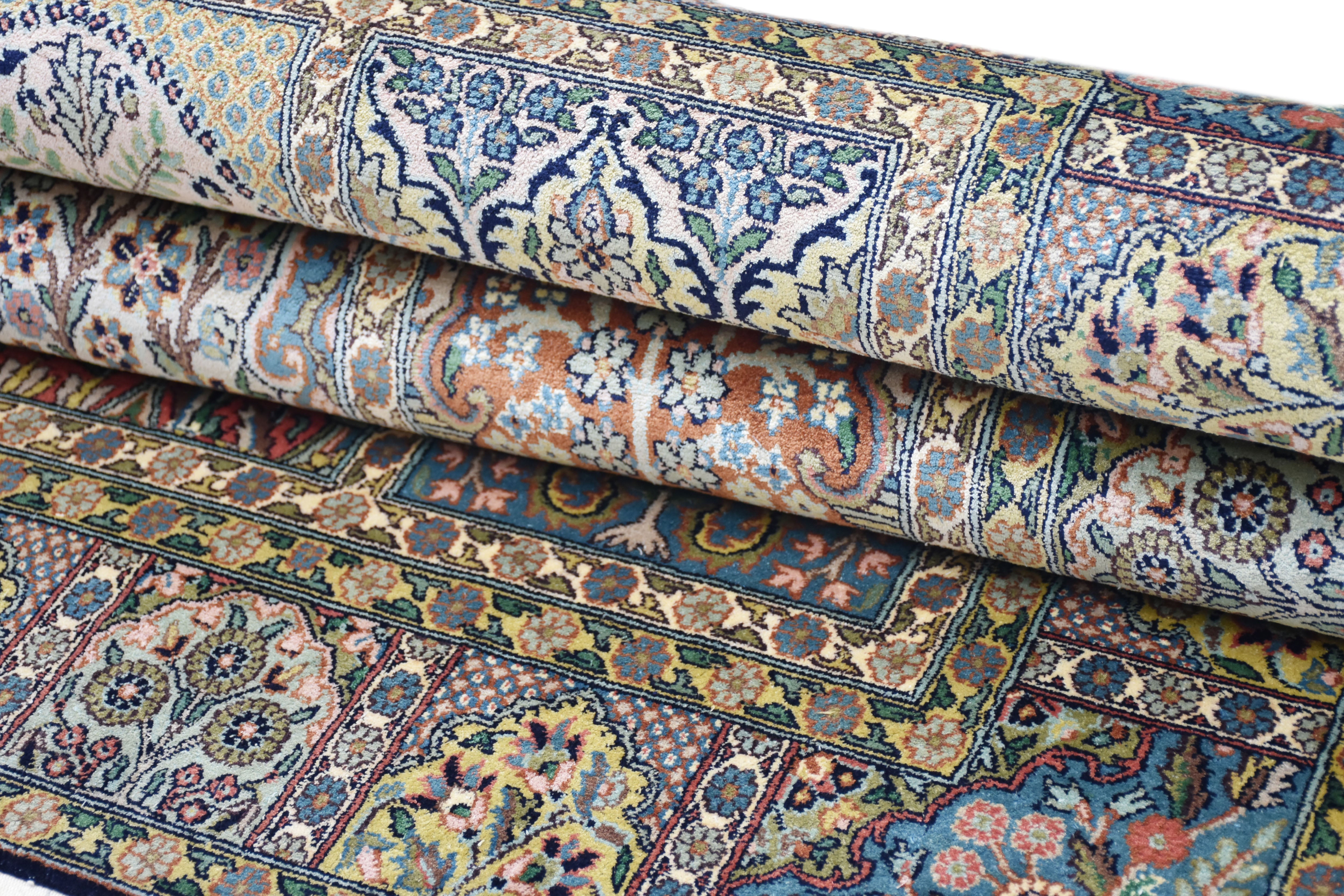 Dieser superweiche Qualitätsteppich ist echter Luxus unter Ihren Füßen, der verwöhnt und schmeichelt. Das stolze Gewicht zeugt von Langlebigkeit und macht den eleganten Teppich zu einem Spitzenprodukt. Ein handgewebter Teppich unterscheidet sich zu einem maschinell erstellten Teppich durch seine feinen Details und die kompexe Herstellungsart. Die faszinierende Bandbreite der Designs, die luxuriöse Geschmeidigkeit und Elastizität und die Lebhaftigkeit der Farben machen echte Seidenteppiche so unverkennbar. Durch das orientalische Design verleihen Sie Ihrem Zuhause einen bezaubernden fernöstlichen Look. Werten Sie Ihre Einrichtung auf und bestellen Sie sich Ihren neuen Seidenteppich.