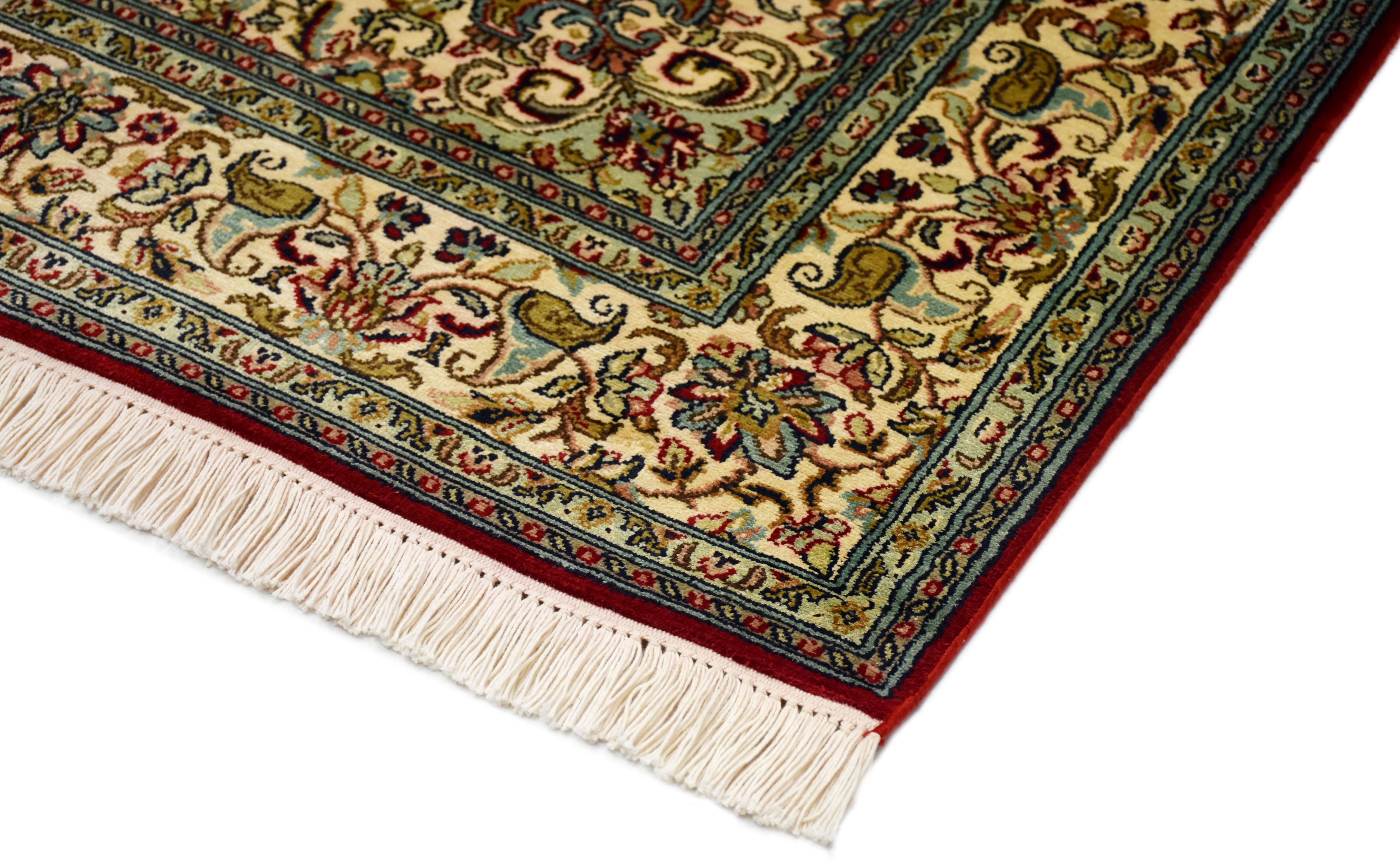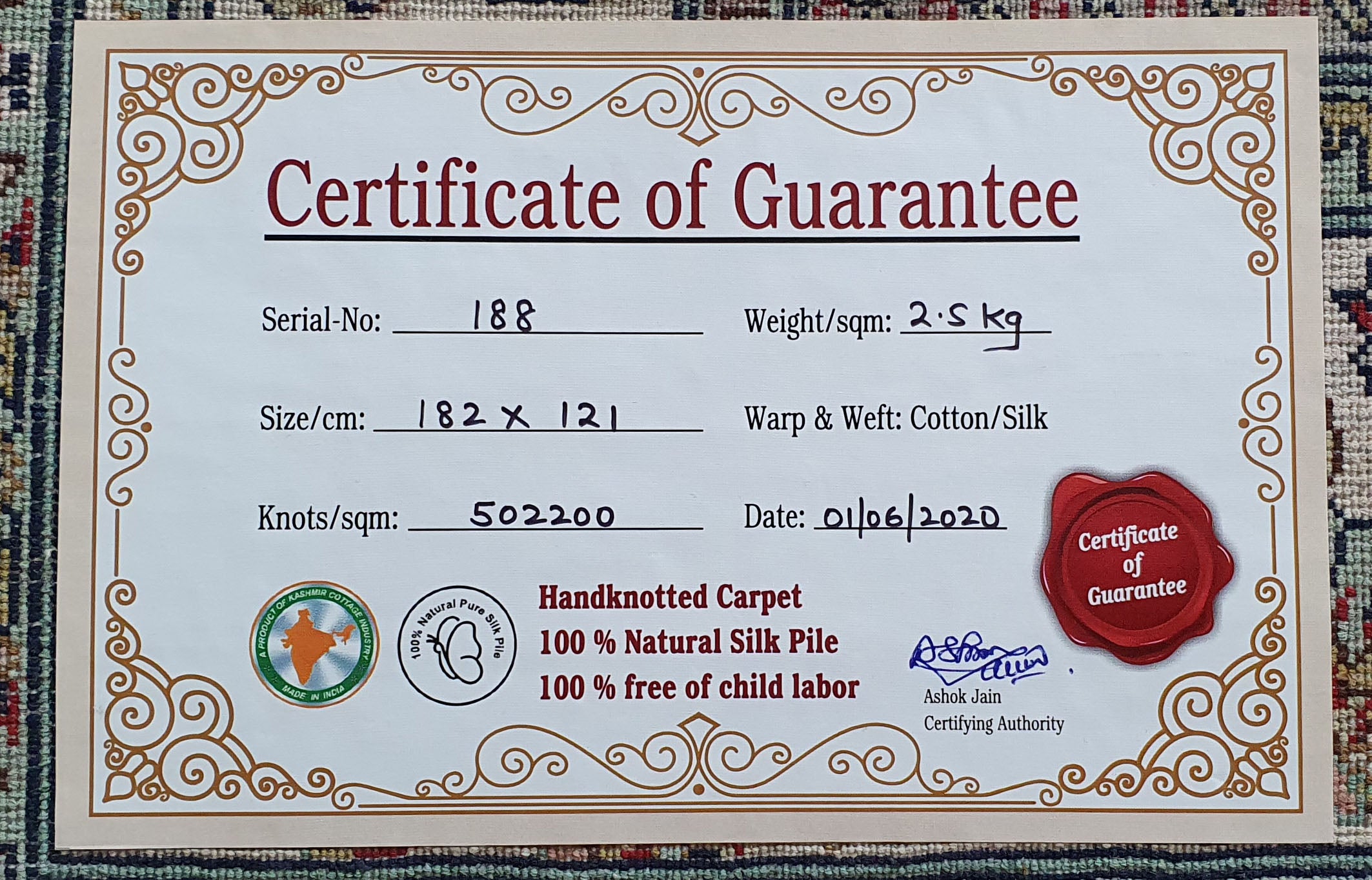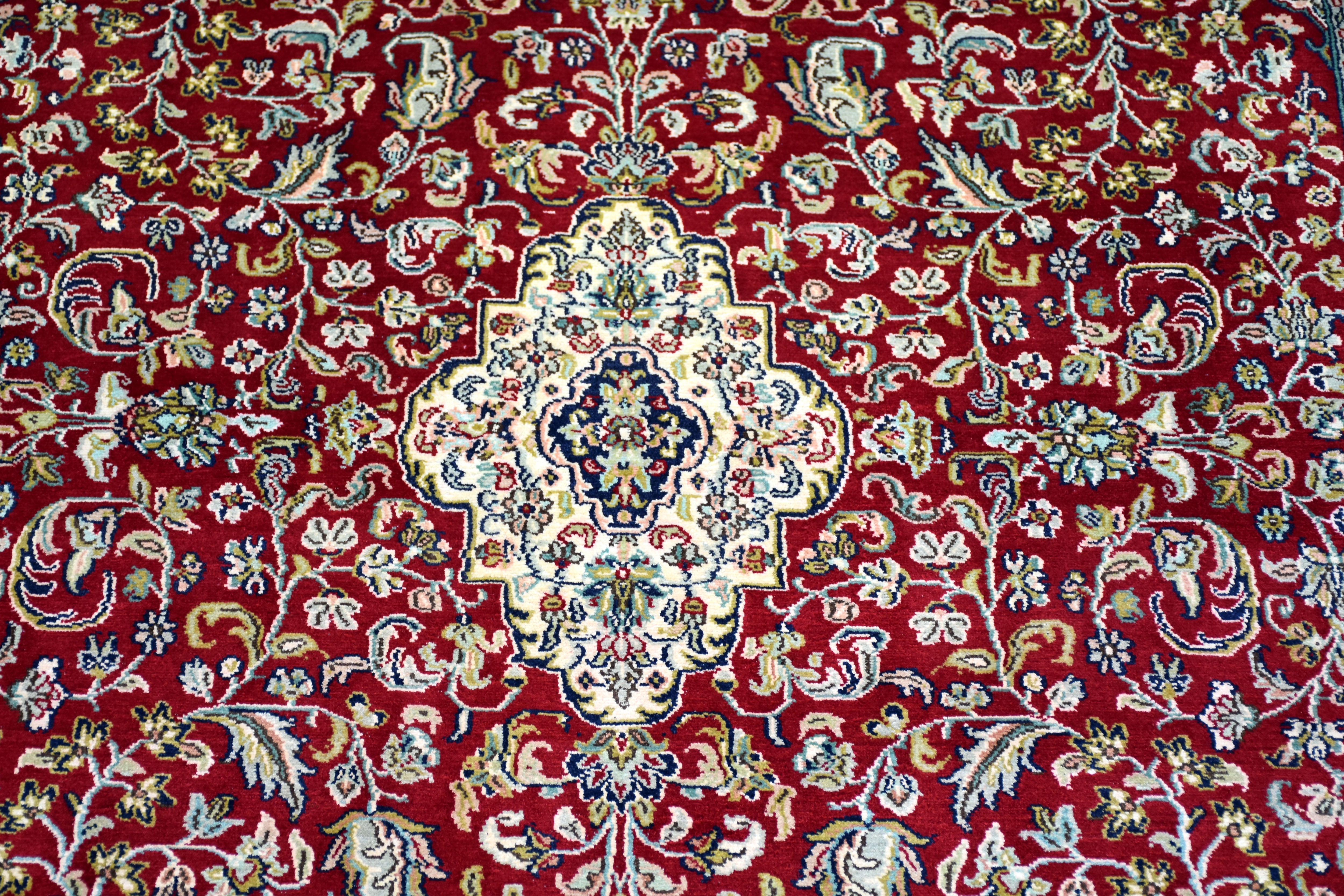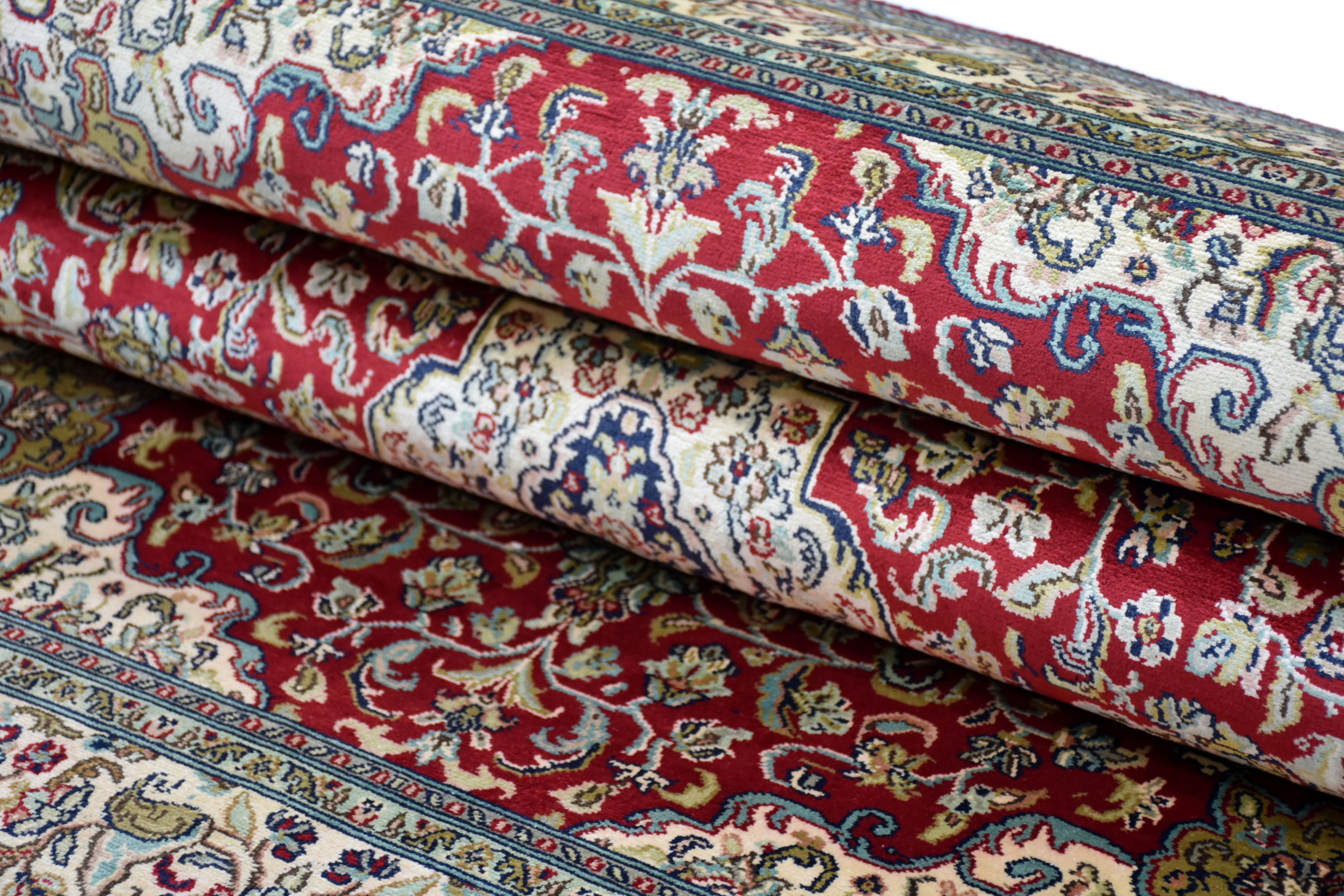 Dieser superweiche Qualitätsteppich ist echter Luxus unter Ihren Füßen, der verwöhnt und schmeichelt. Das stolze Gewicht zeugt von Langlebigkeit und macht den eleganten Teppich zu einem Spitzenprodukt. Ein handgewebter Teppich unterscheidet sich zu einem maschinell erstellten Teppich durch seine feinen Details und die kompexe Herstellungsart. Die faszinierende Bandbreite der Designs, die luxuriöse Geschmeidigkeit und Elastizität und die Lebhaftigkeit der Farben machen echte Seidenteppiche so unverkennbar. Durch das orientalische Design verleihen Sie Ihrem Zuhause einen bezaubernden fernöstlichen Look. Werten Sie Ihre Einrichtung auf und bestellen Sie sich Ihren neuen Seidenteppich.