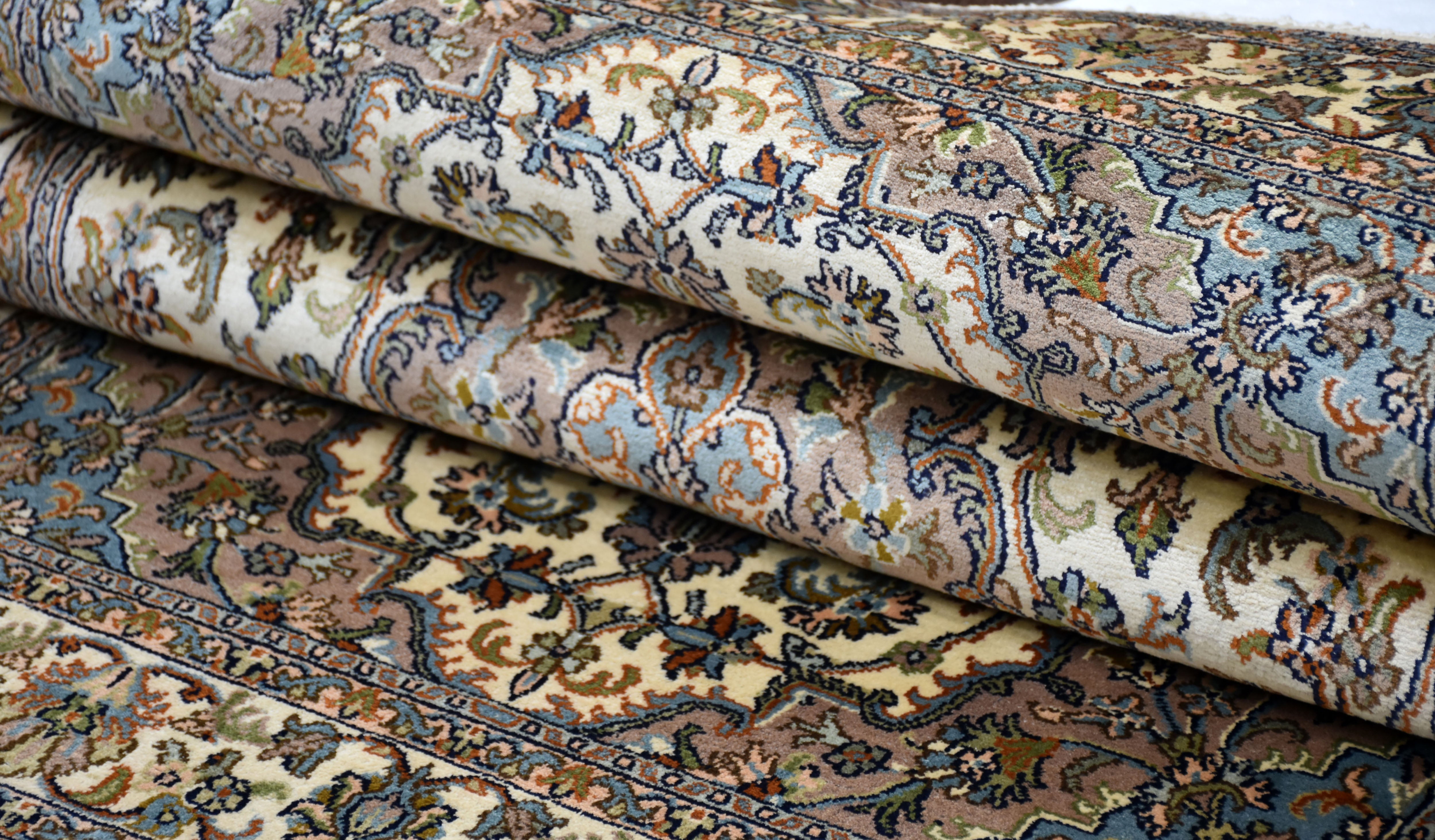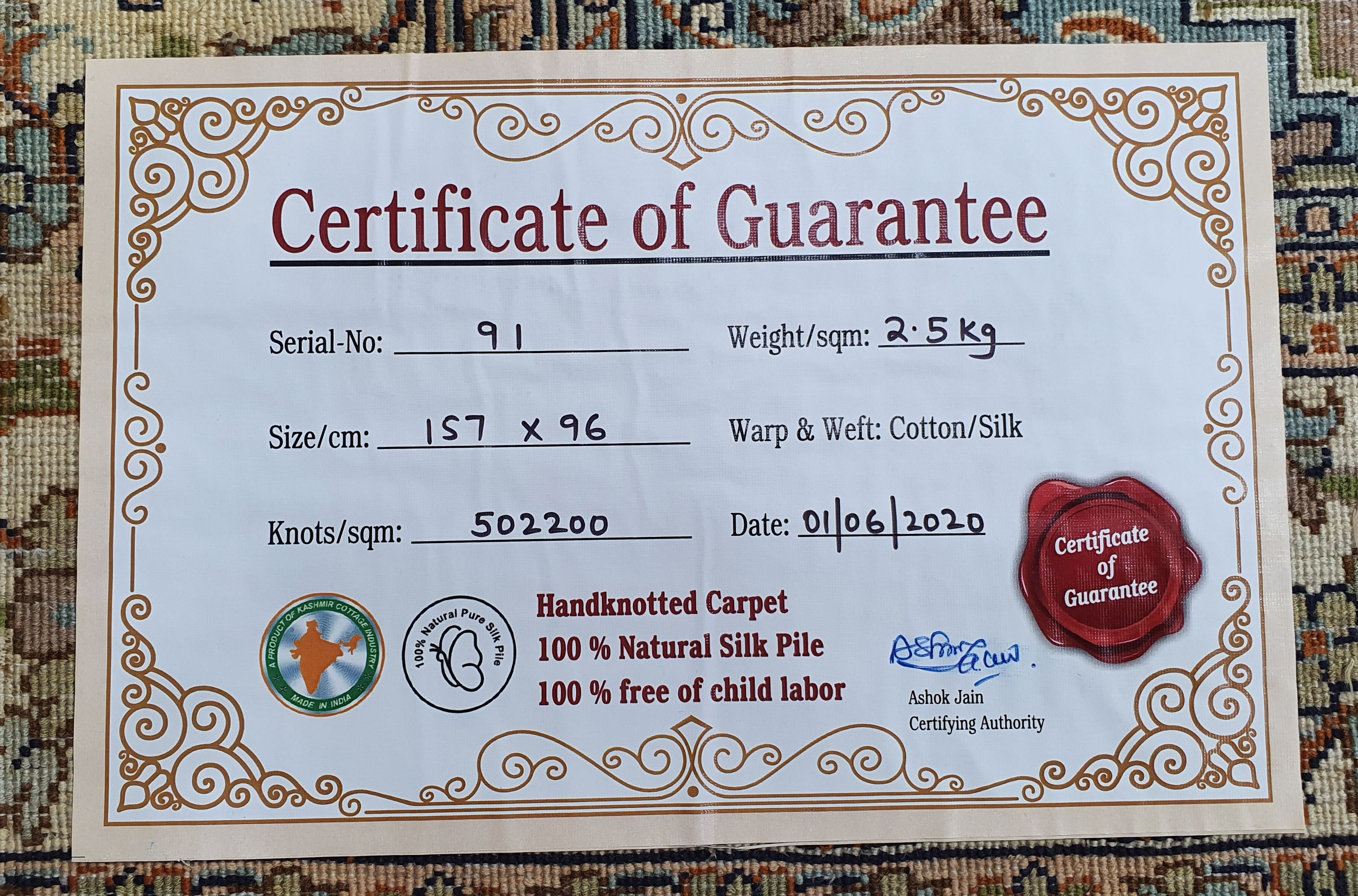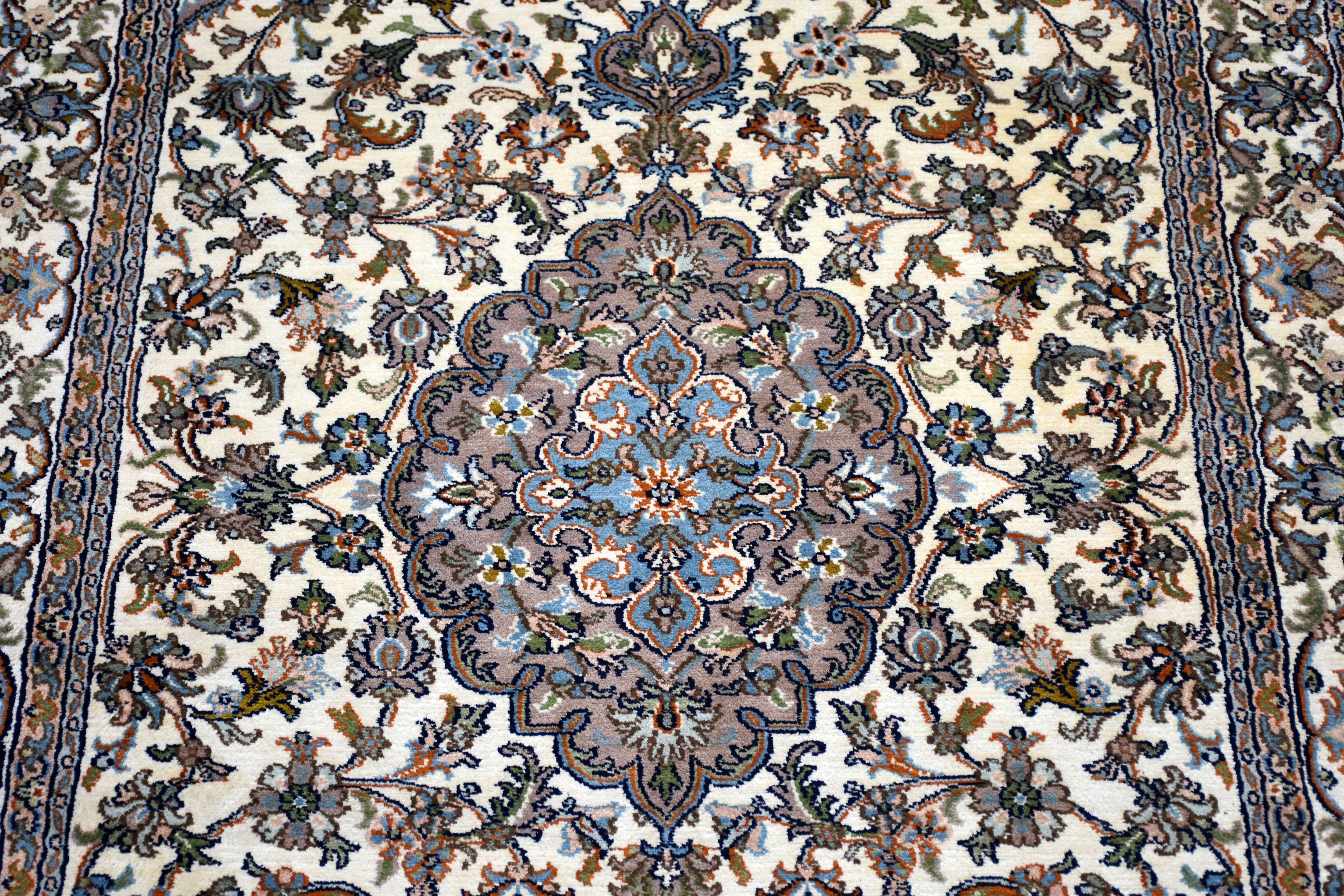 Dieser superweiche Qualitätsteppich ist echter Luxus unter Ihren Füßen, der verwöhnt und schmeichelt. Das stolze Gewicht zeugt von Langlebigkeit und macht den eleganten Teppich zu einem Spitzenprodukt. Ein handgewebter Teppich unterscheidet sich zu einem maschinell erstellten Teppich durch seine feinen Details und die kompexe Herstellungsart. Die faszinierende Bandbreite der Designs, die luxuriöse Geschmeidigkeit und Elastizität und die Lebhaftigkeit der Farben machen echte Seidenteppiche so unverkennbar. Durch das orientalische Design verleihen Sie Ihrem Zuhause einen bezaubernden fernöstlichen Look. Werten Sie Ihre Einrichtung auf und bestellen Sie sich Ihren neuen Seidenteppich.