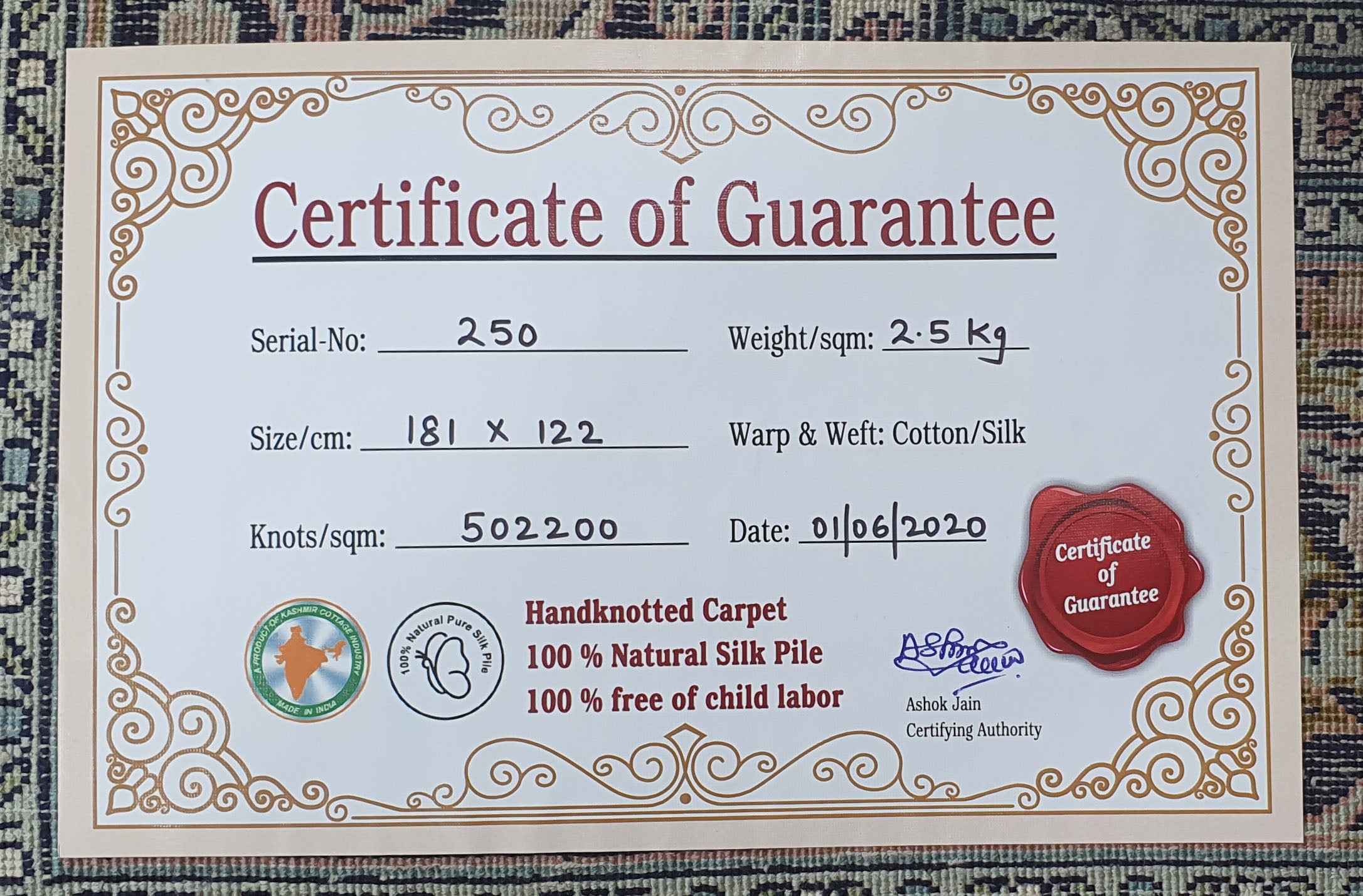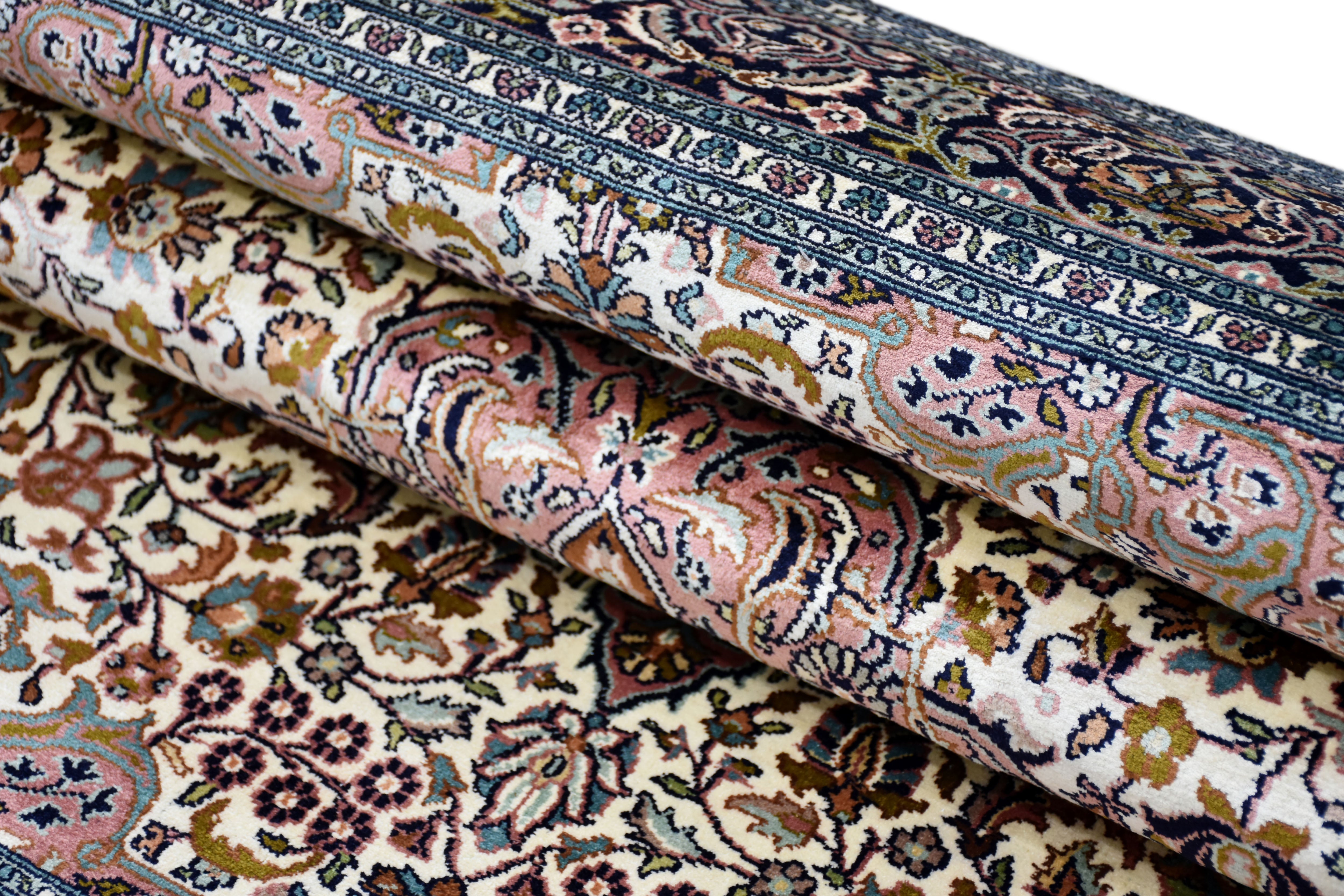 Dieser superweiche Qualitätsteppich ist echter Luxus unter Ihren Füßen, der verwöhnt und schmeichelt. Das stolze Gewicht zeugt von Langlebigkeit und macht den eleganten Teppich zu einem Spitzenprodukt. Ein handgewebter Teppich unterscheidet sich zu einem maschinell erstellten Teppich durch seine feinen Details und die kompexe Herstellungsart. Die faszinierende Bandbreite der Designs, die luxuriöse Geschmeidigkeit und Elastizität und die Lebhaftigkeit der Farben machen echte Seidenteppiche so unverkennbar. Durch das orientalische Design verleihen Sie Ihrem Zuhause einen bezaubernden fernöstlichen Look. Werten Sie Ihre Einrichtung auf und bestellen Sie sich Ihren neuen Seidenteppich.